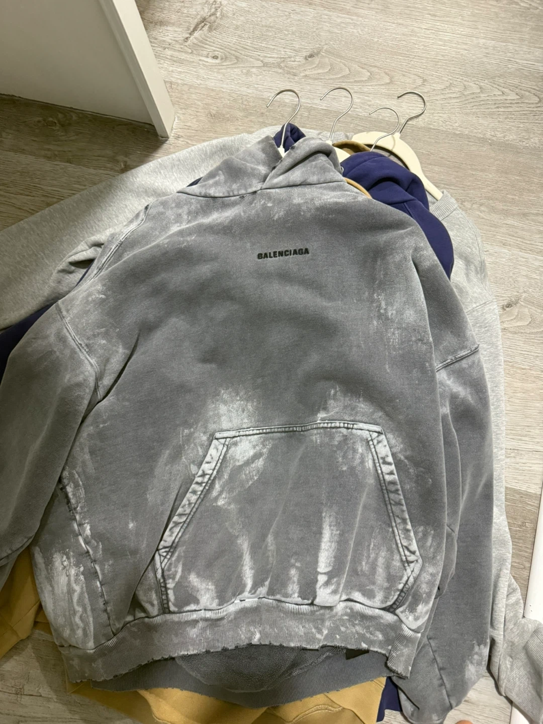 Selling a Balenciaga hoodie in gray. It has a unique, slightly distressed look with a front pocket. Perfect for casual wear!