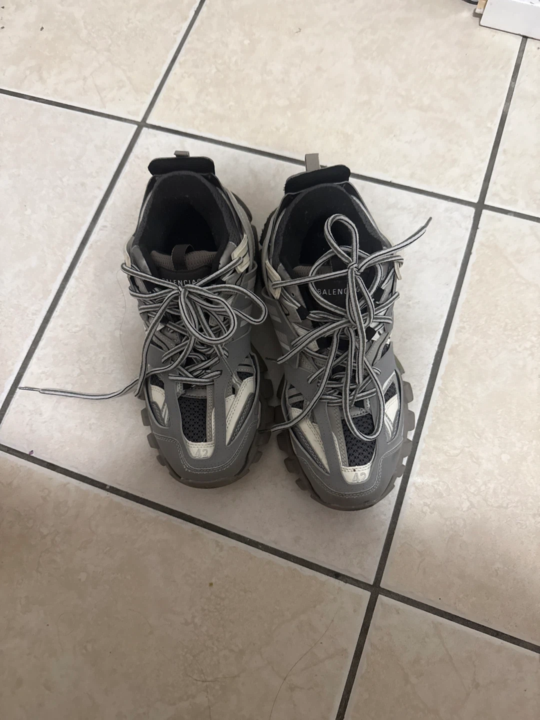 Selling a pair of Balenciaga Track sneakers in size 42. They show some signs of wear, but are still in good condition. Perfect for adding a stylish touch to your outfit!