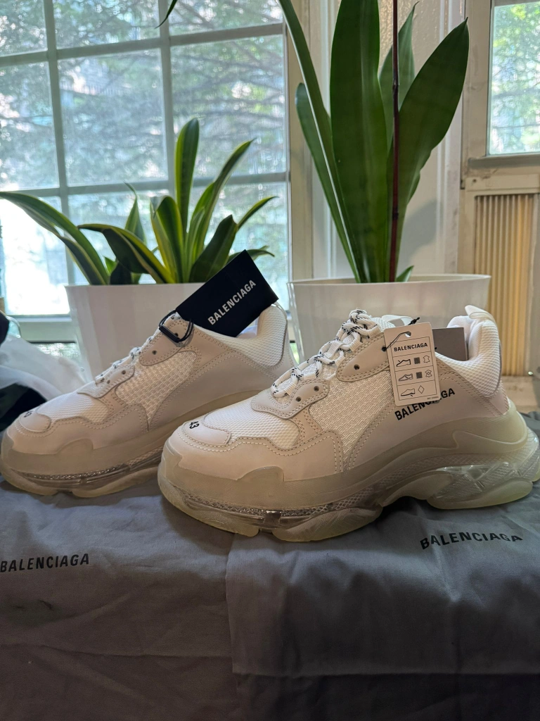 Selling a pair of Balenciaga Triple S sneakers in off-white. These are a stylish and iconic choice for footwear enthusiasts. They are in great condition brand new and ready for a new home! FREE DELIVERY.