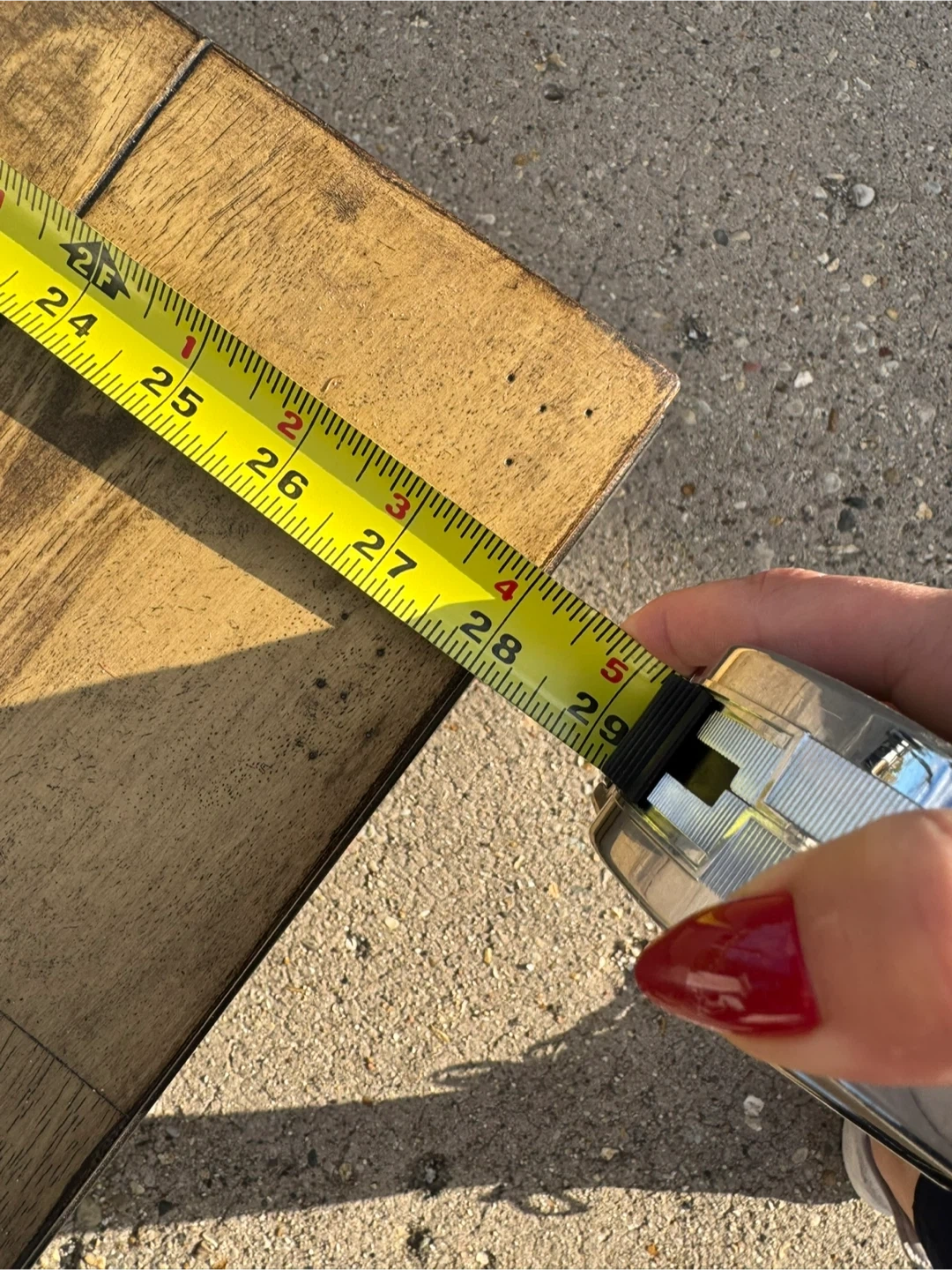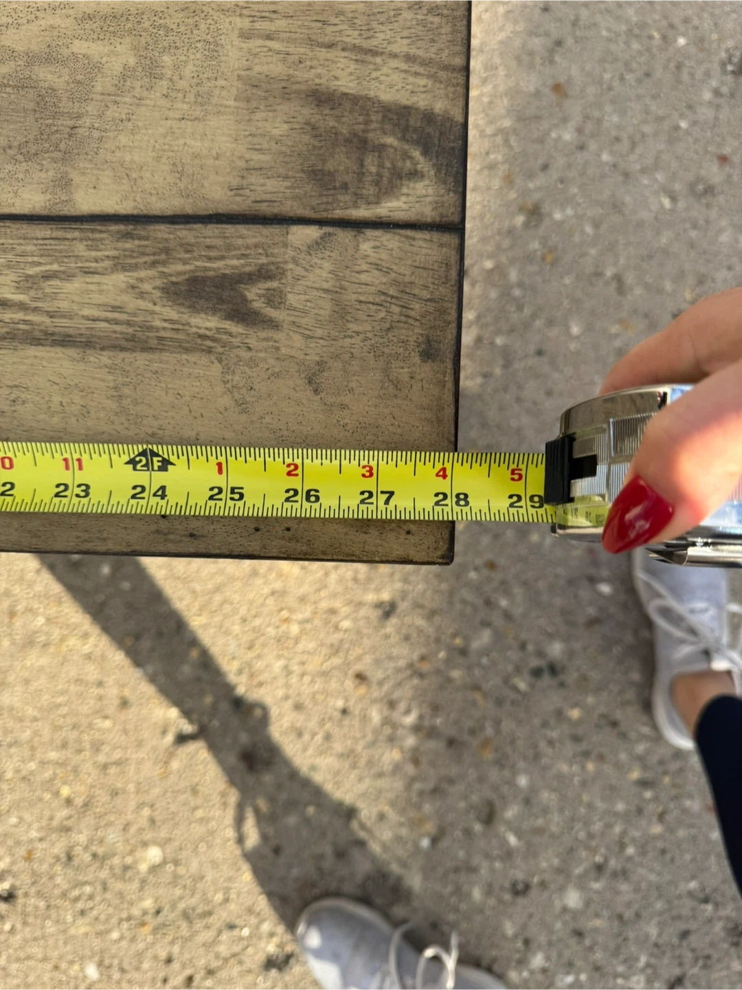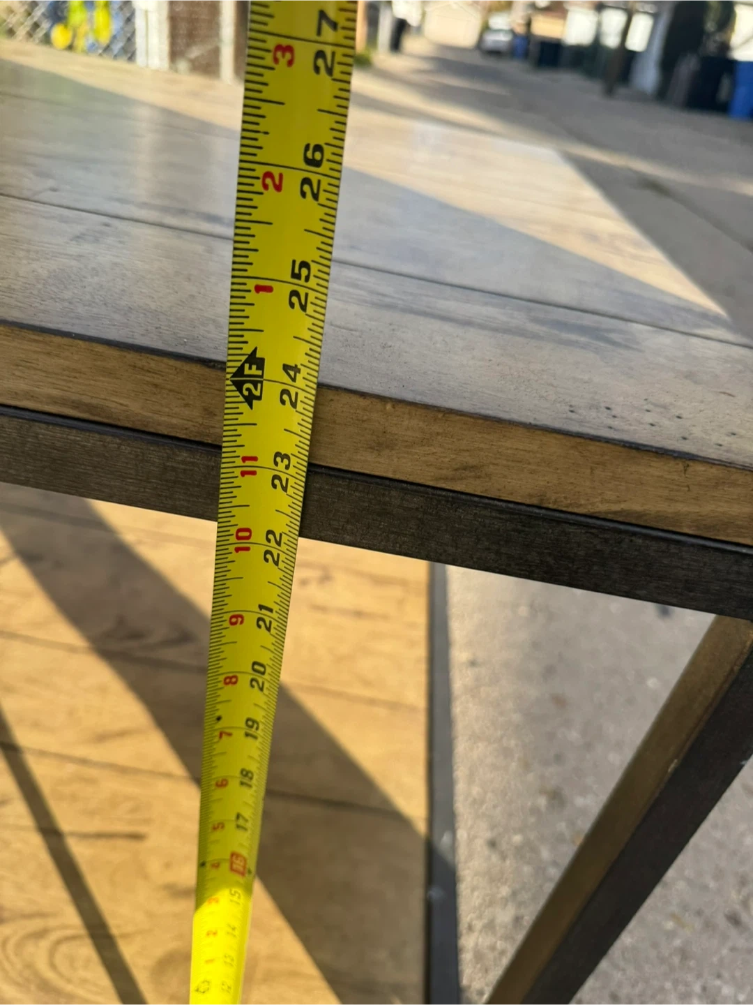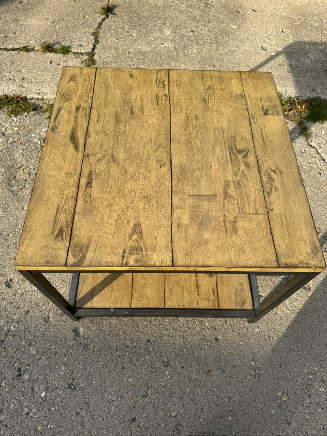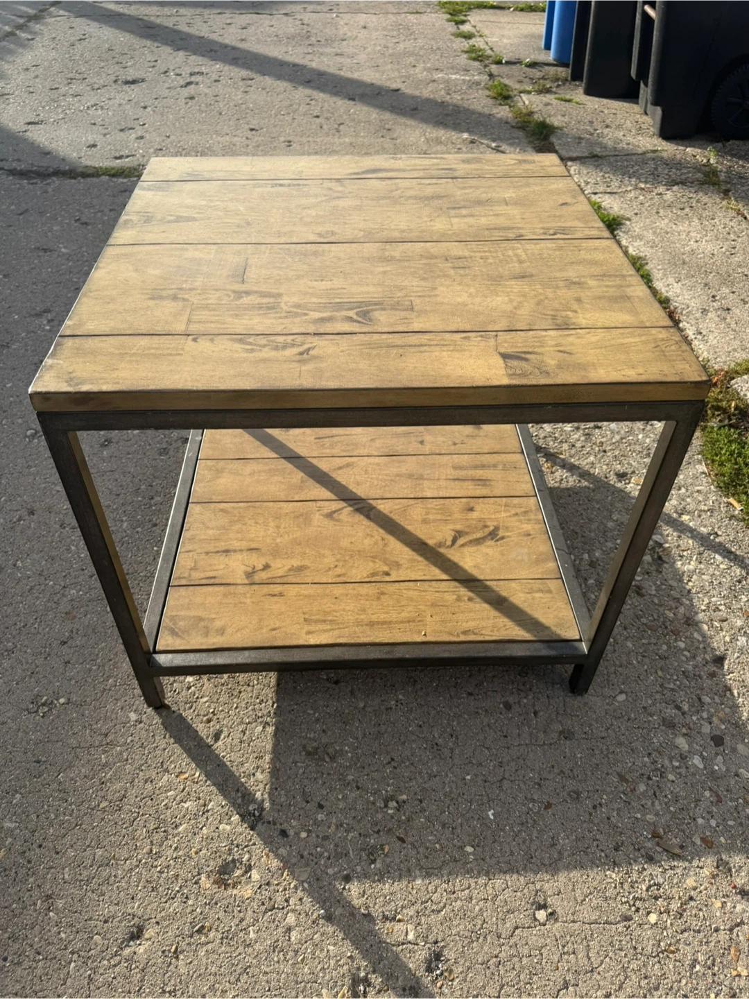 5Ballard coffee table with a wood top and metal frame! It measures approximately 27 inches square. Beautiful table!