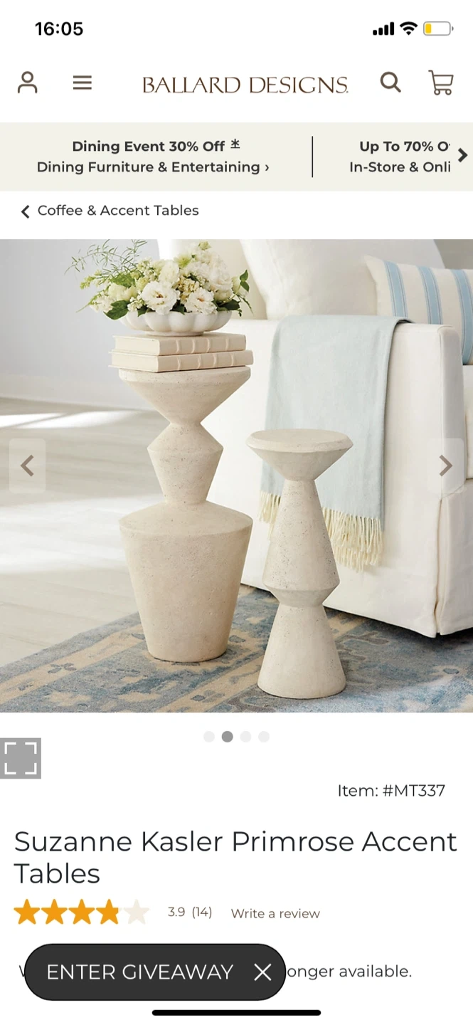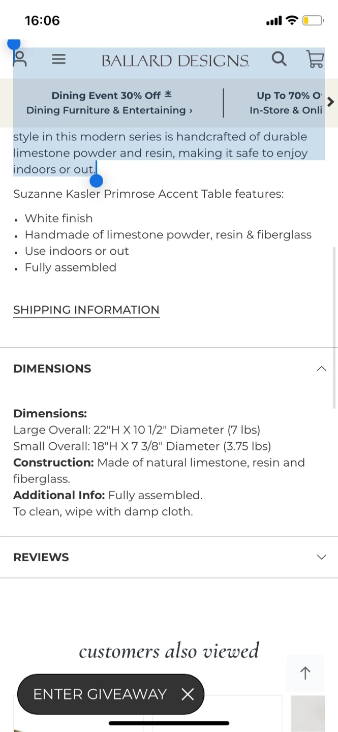 Selling a Ballard Designs Suzanne Kasler Primrose Accent Table. It's in great condition and ready for a new home! This stylish table adds a touch of elegance to any room. Bought for $183. Selling for $80 - price negotiable. Light and easy to transport (weighs 7lbs) H: 22” / Diameter: 10.5” Link: https://www.ballarddesigns.com/suzanne-kasler-primrose-accent-tables/659015