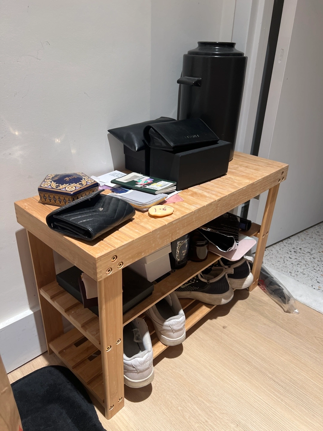 60Wooden shoe rack. Two shelves. Holds shoes and other items. Good condition.