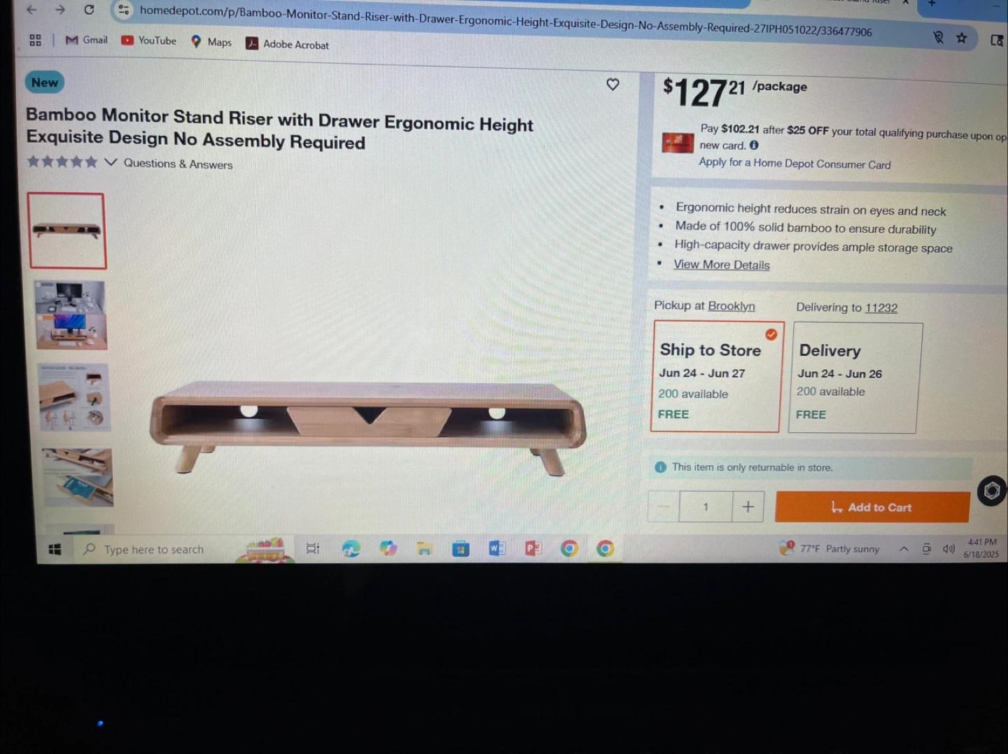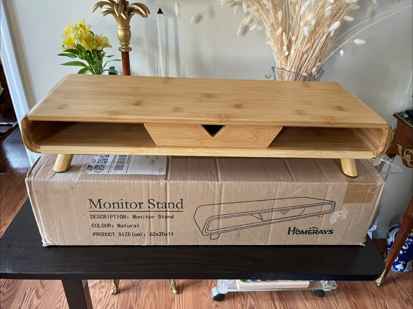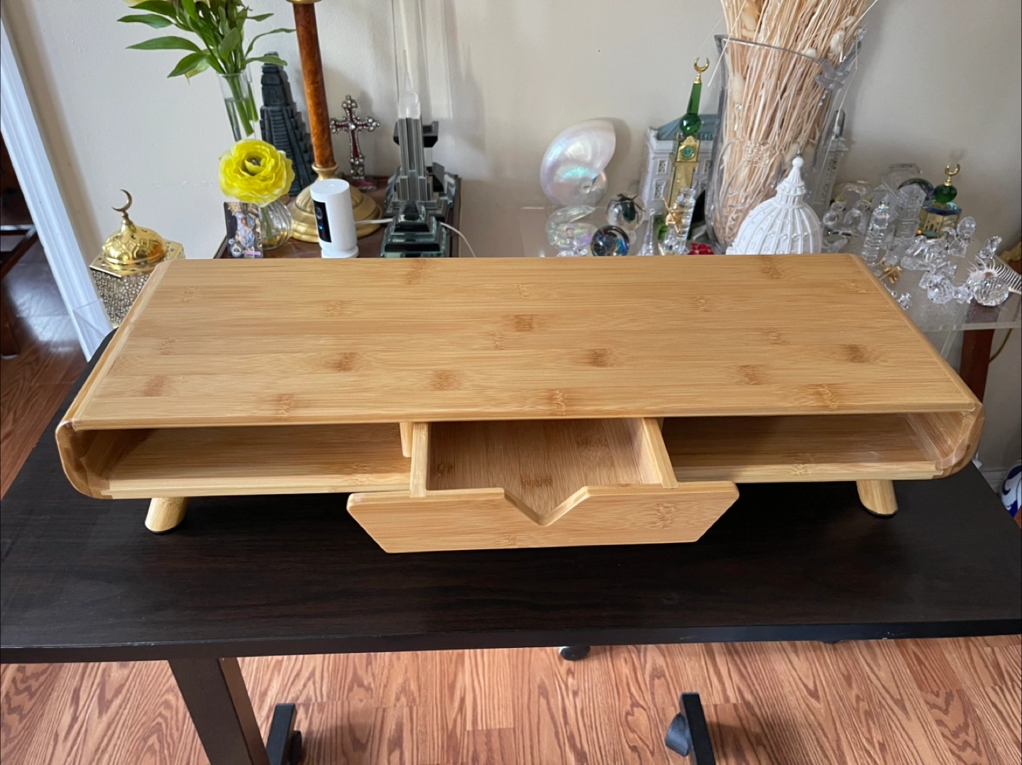 10A beautiful New bamboo monitor stand. Features a drawer and two storage compartments. Perfect for elevating your monitor for a better viewing experience, encouraging proper posture, and promoting relaxation.