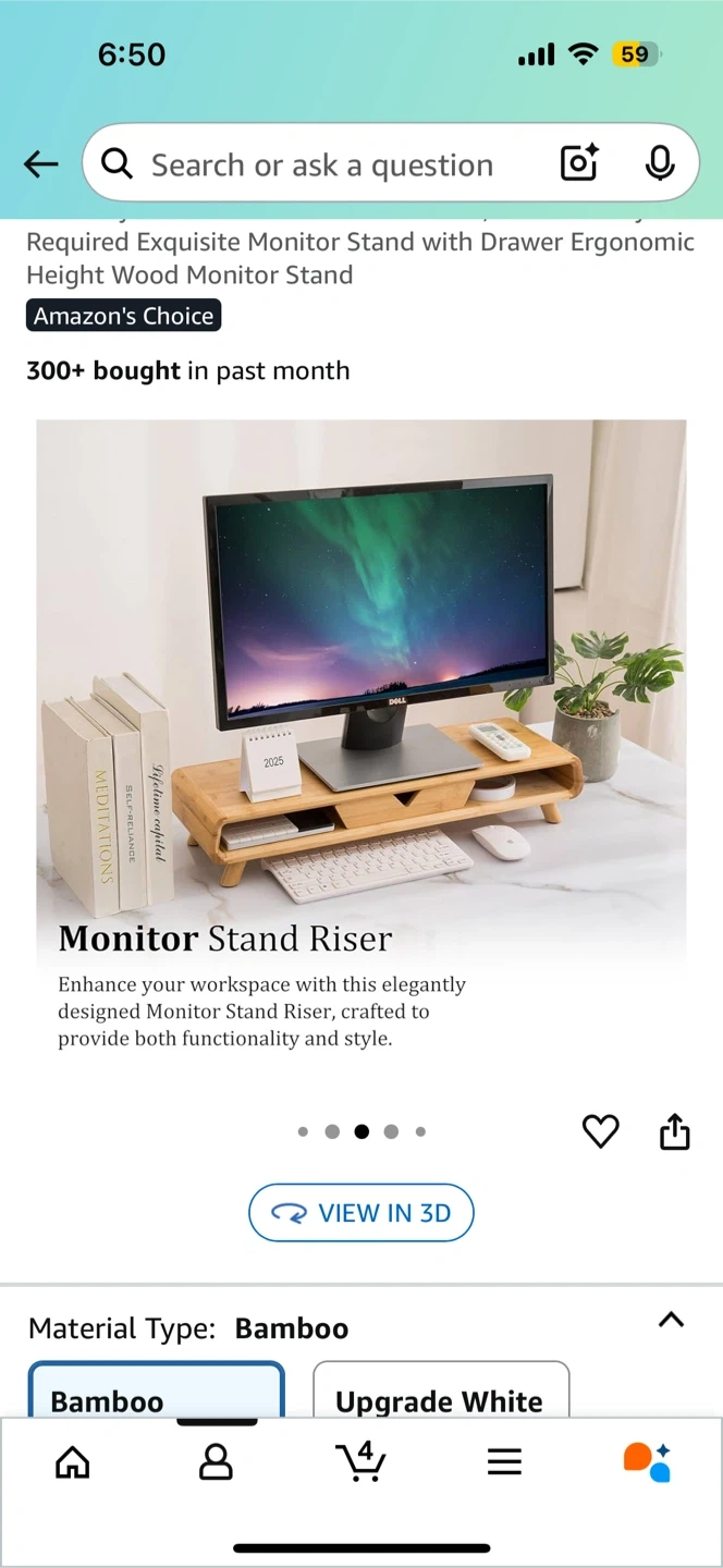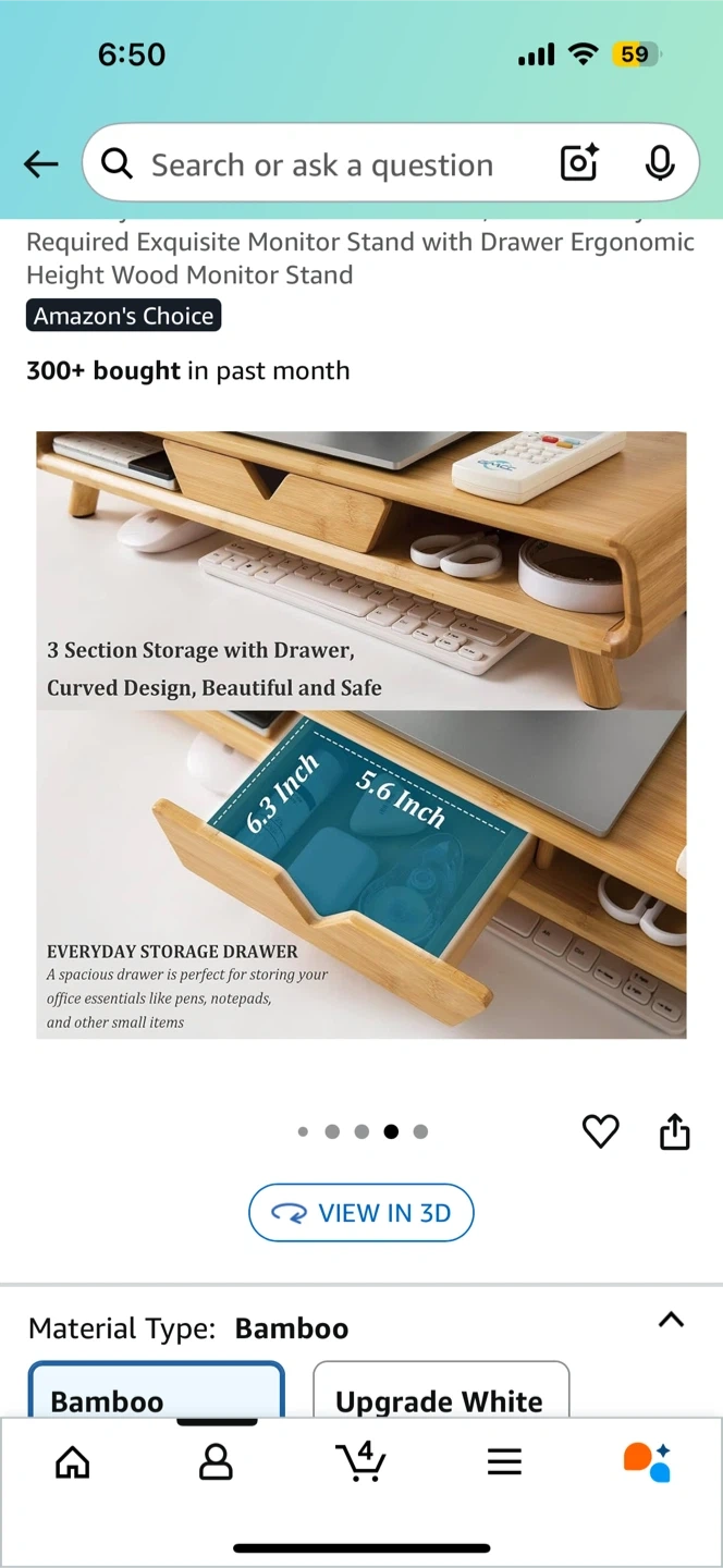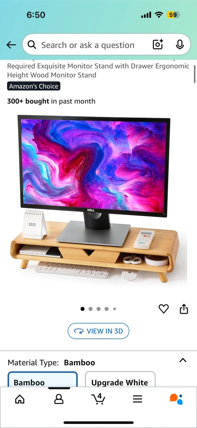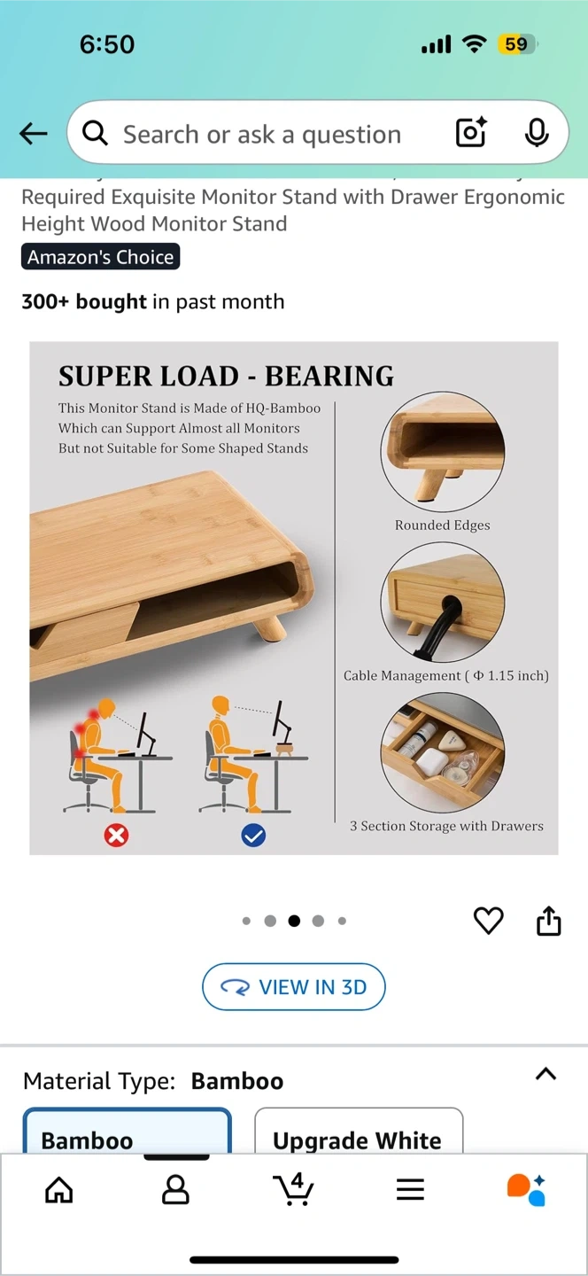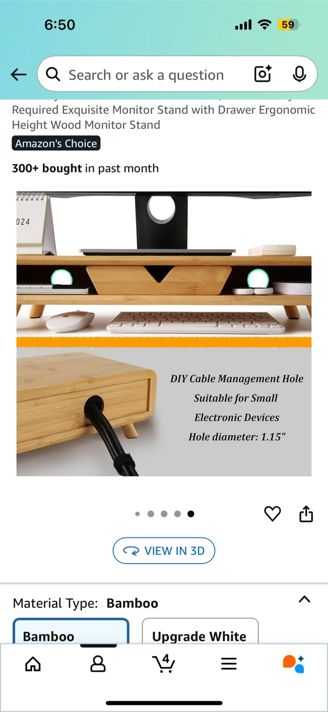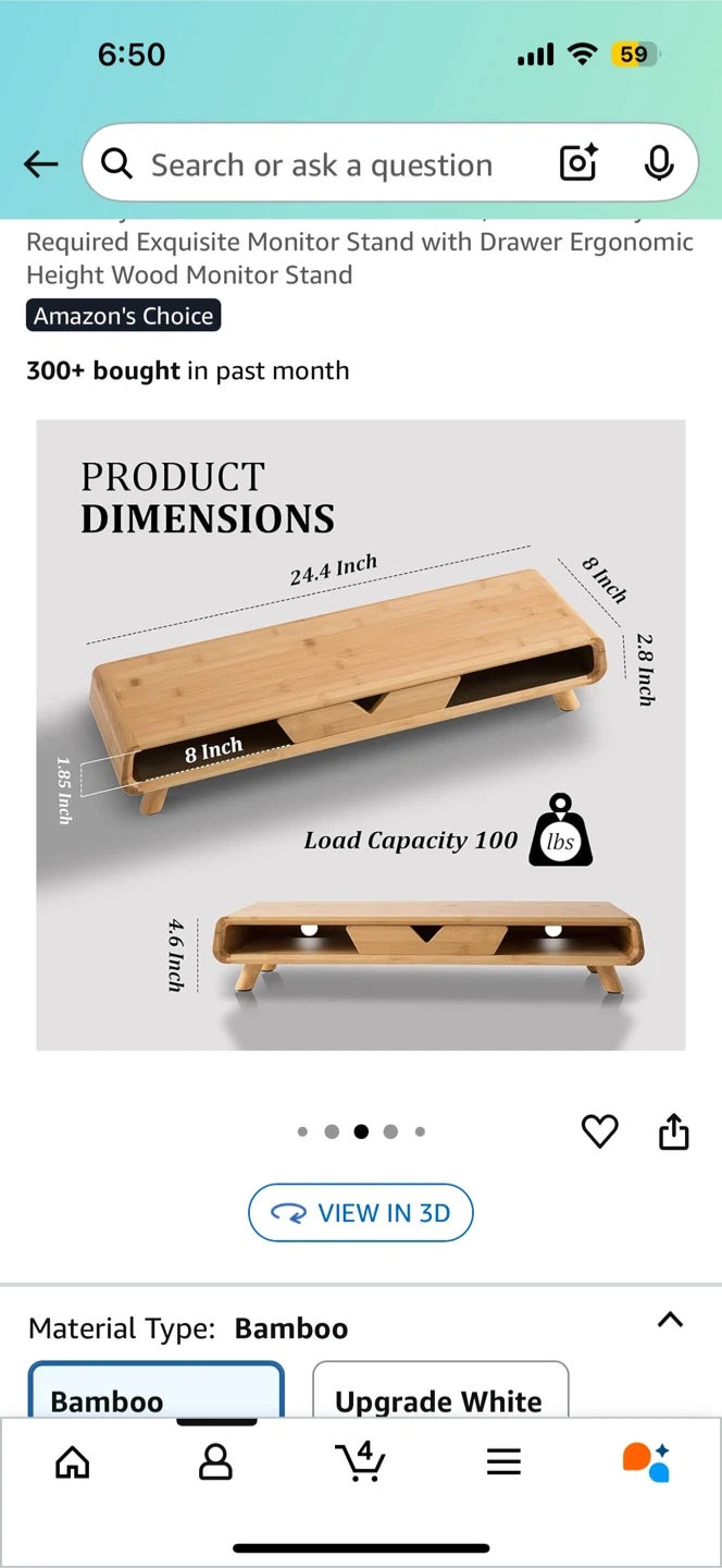 68This monitor stand is made of bamboo and has a drawer for storage. It's designed to be ergonomic and help with posture. The product dimensions are 24.4 x 8 x 4.61 inches. It also has cable management and rounded edges completely new: just no space for it original price: $60