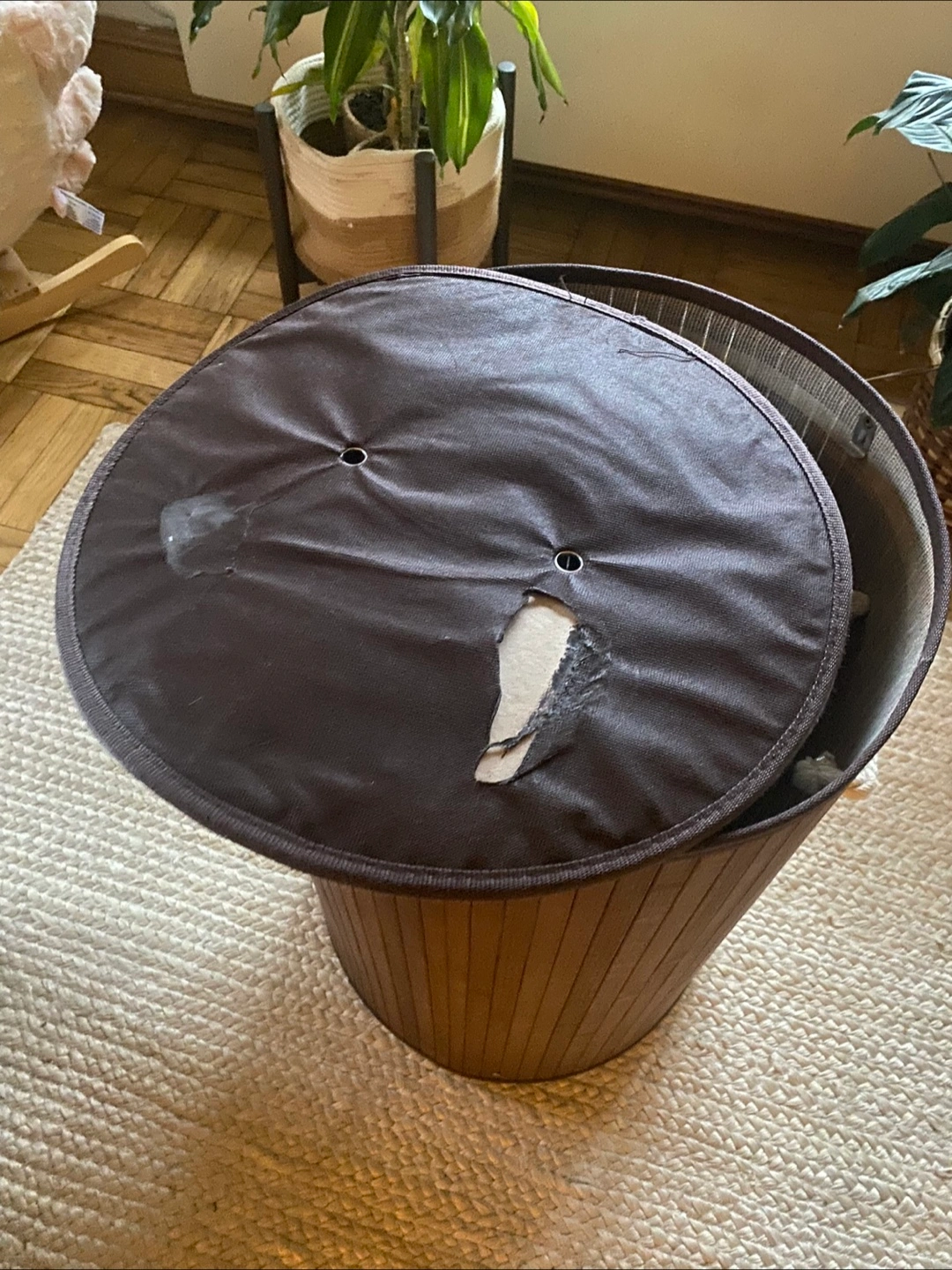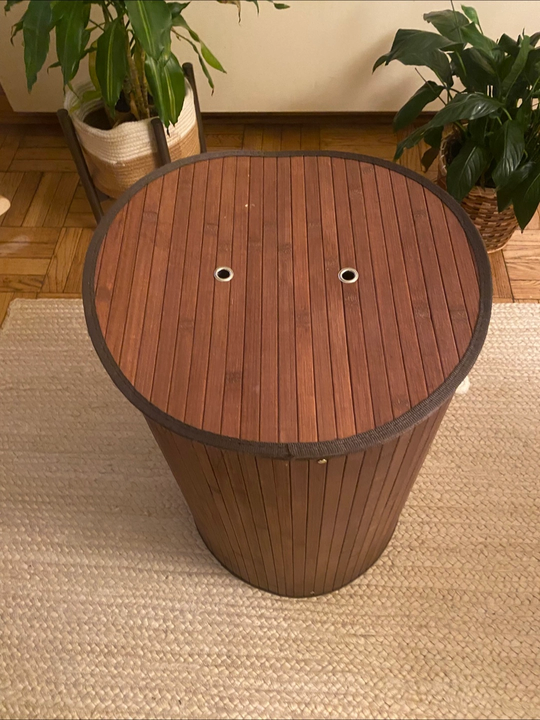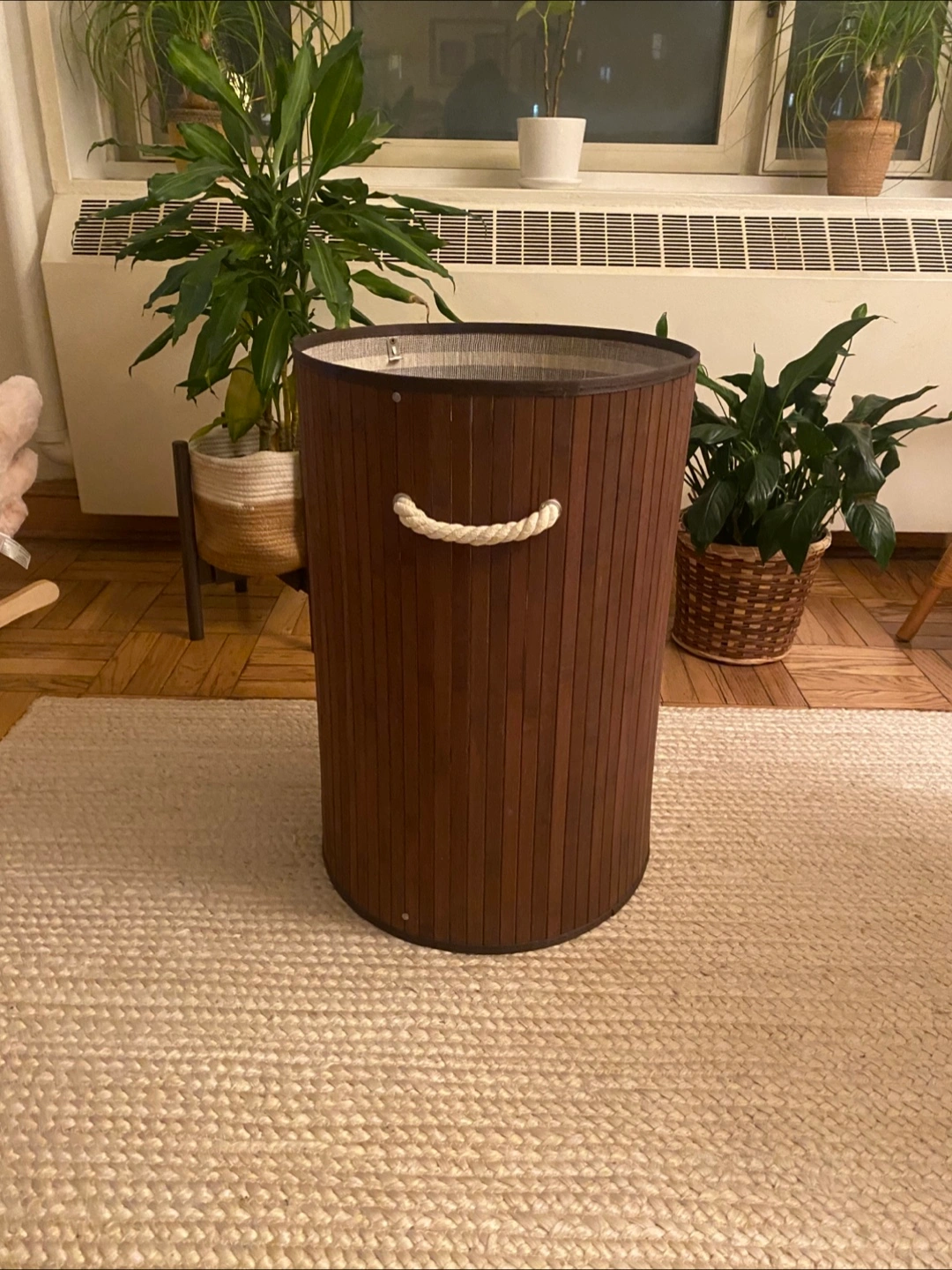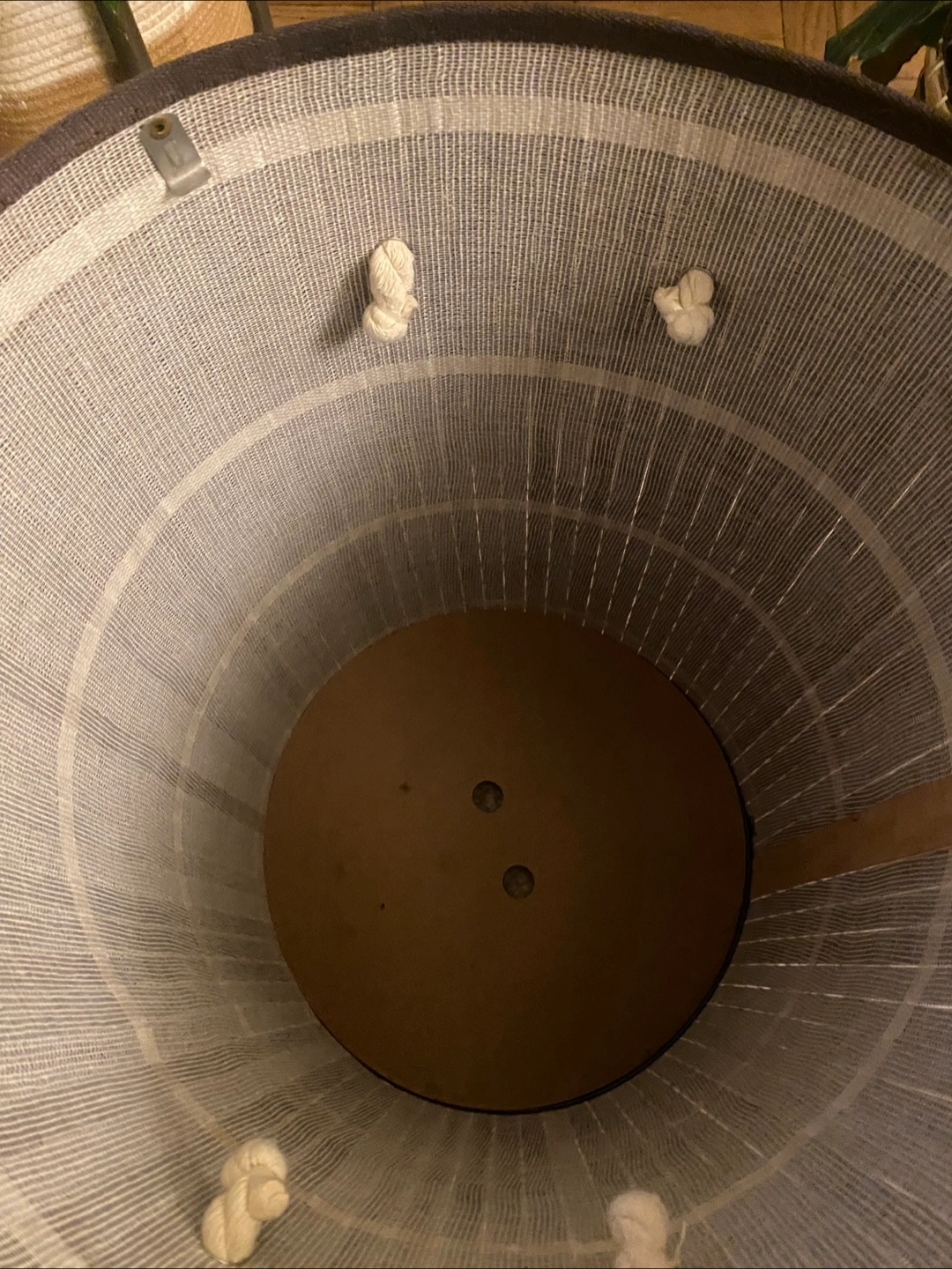 Lightweight - has interior metal hooks to attach a liner/laundry bag and a cardboard bottom. Practical uses include towels, sheets, linen or other lightweight items. Measures 23” high. Overall good interior and exterior frame. The lid is missing the rope handles and its underside has some of its lining missing.
