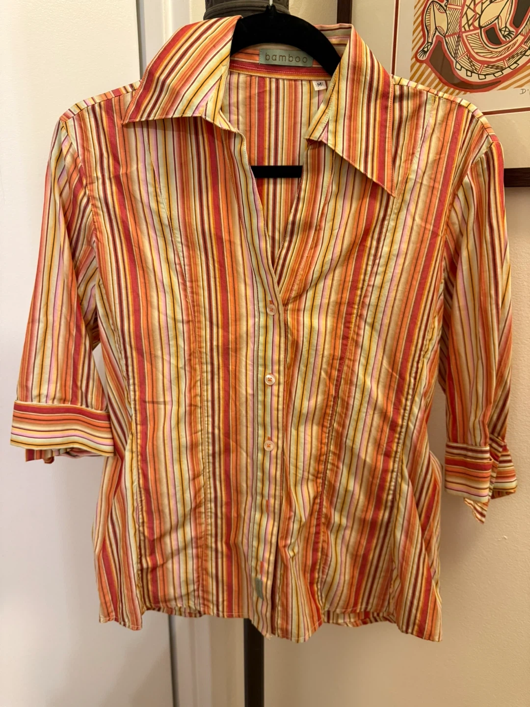 272Here's a Bamboo brand button-down shirt with a colorful striped pattern! It's a size medium and has 3/4 sleeves. Made in Italy 100% cotton