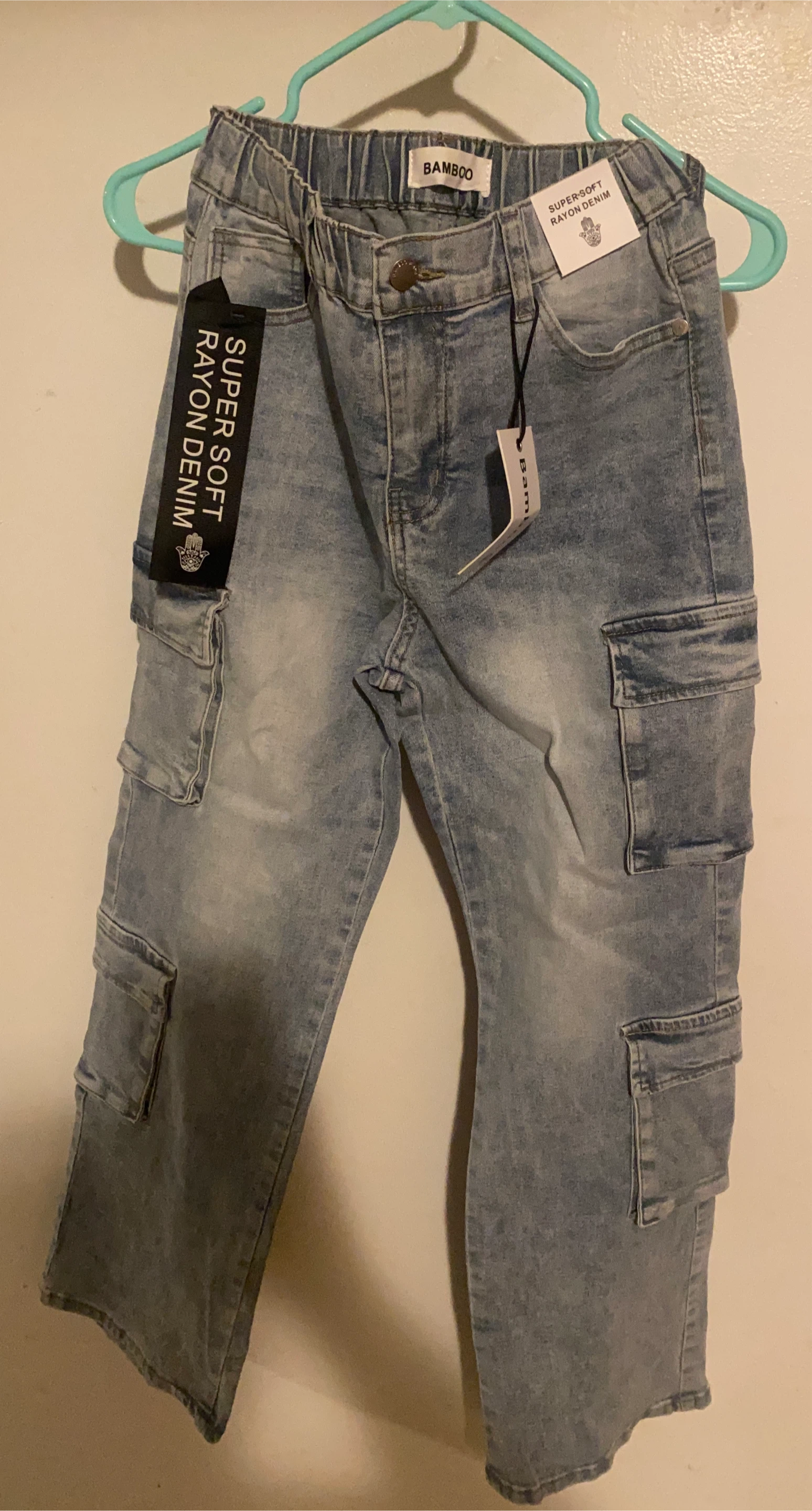 65Here are some super soft rayon denim cargo pants from Bamboo! They have a comfortable elastic waistband and several pockets. The material is a light wash denim.