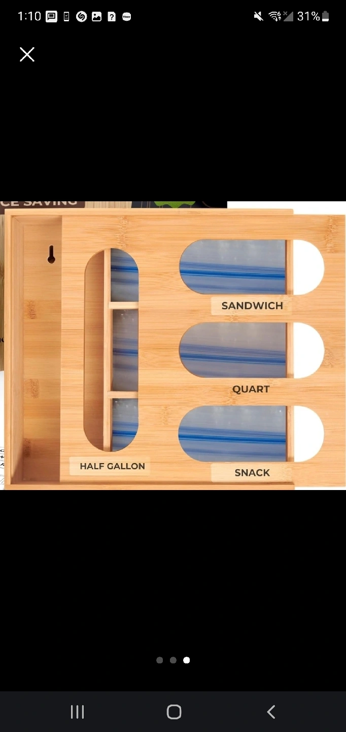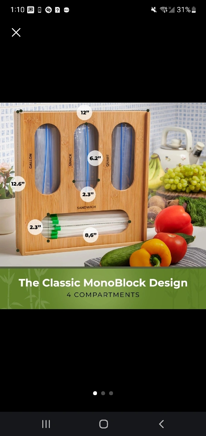 Keep your kitchen drawers organized with this bamboo ziplock bag organizer! It features compartments for snack, sandwich, quart, and half gallon bags. The classic monoblock design makes it easy to remove the lid, insert bags, close the lid, and access them easily. Dimensions are approximately 12.6" x 12" x 2.3"