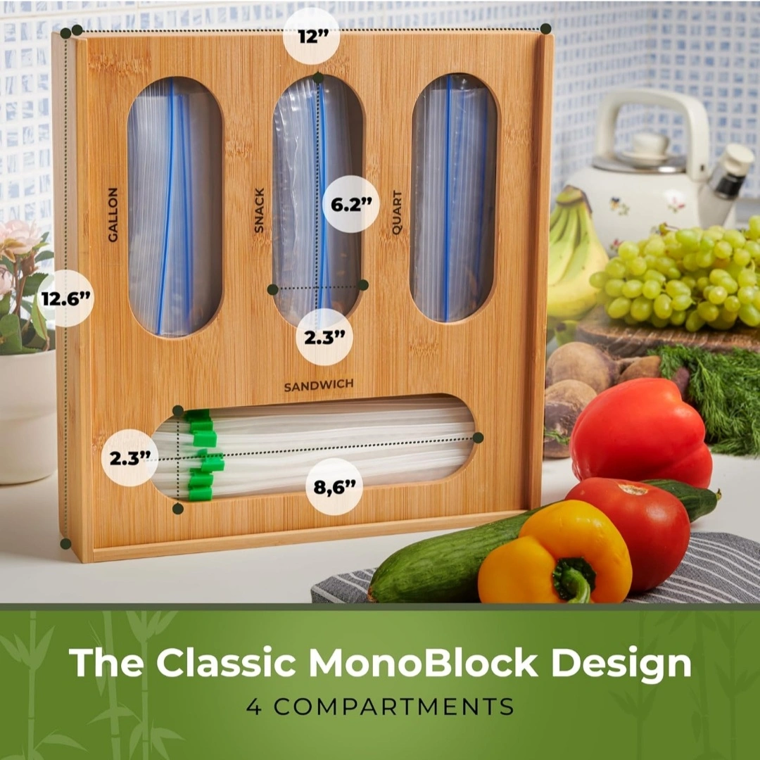 Keep your kitchen drawers organized with this bamboo ziplock bag organizer! It's designed to hold sandwich, snack, quart, half gallon, and gallon size bags. The organizer has 4 compartments and features a classic Monoblock design. It's easy to use – just remove the lid, insert your ziplock bags, close the lid, and access easily!