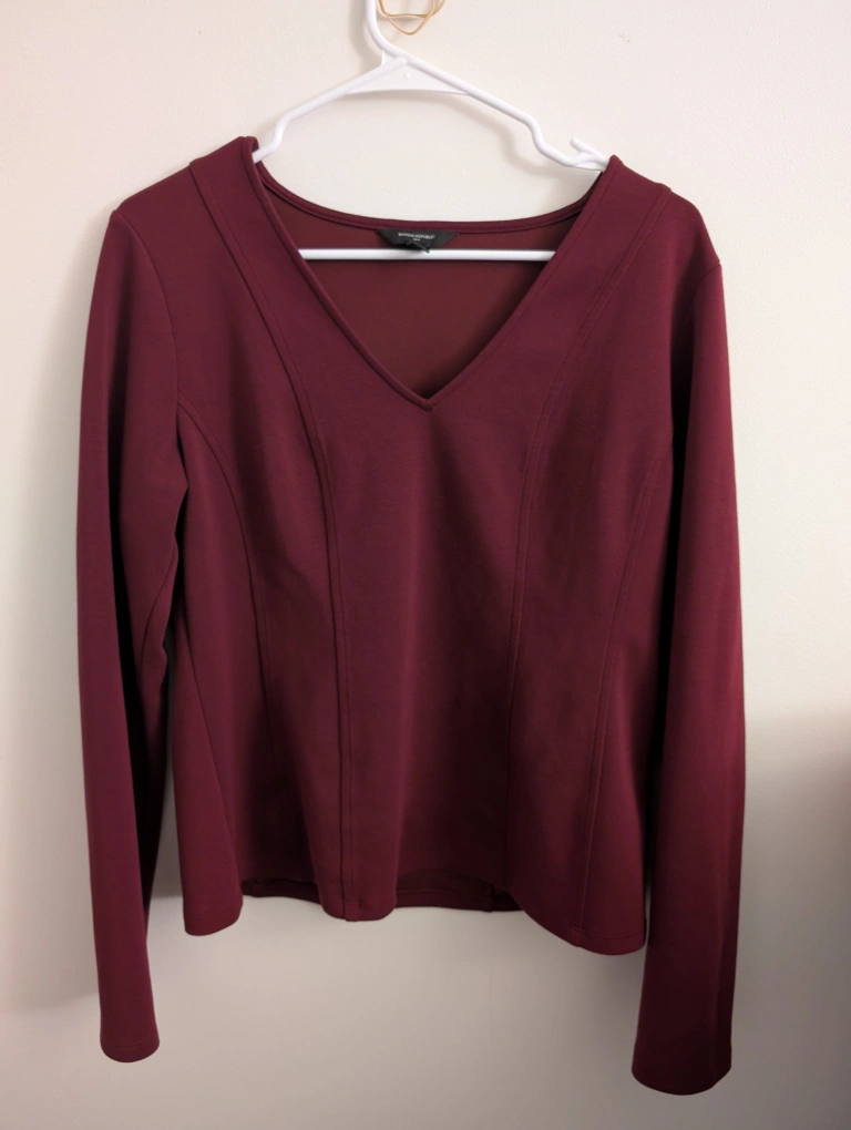 Here's a lovely burgundy long sleeve top from Banana Republic! It's a size large and made in Vietnam. The material is a blend of 47% rayon/viscose, 41% polyester, and 12% spandex/elastane. It's machine washable, too! Suitable for office wear