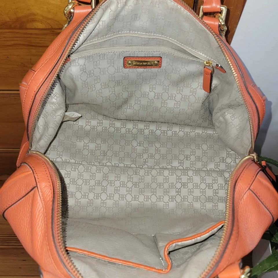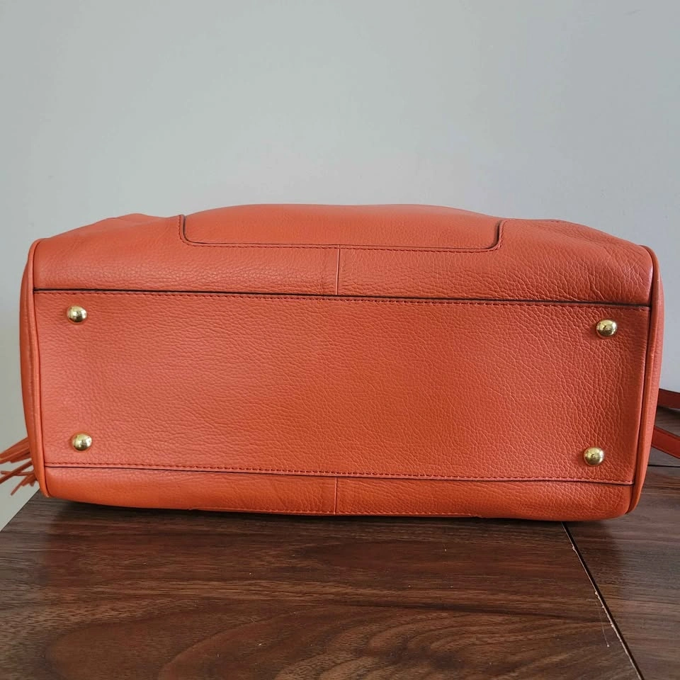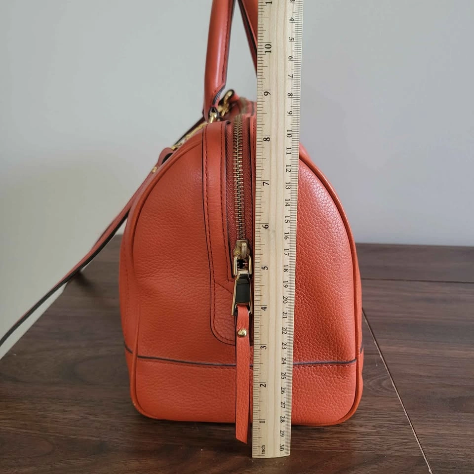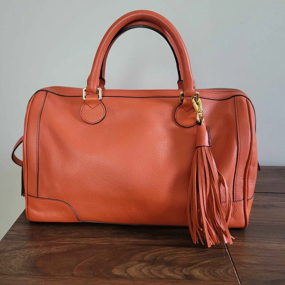 10Material: Shell: Cow leather Comments: Damp wipe only for cleaning purposes Please see pictures for size/ measurements Item is stored in a smoke-free and pet-free environment Cash only and no returns Must pick up About this item: • Gold tone hardware • Top zipper closure • Inside bag has 2 slip pockets and a zipper pocket.