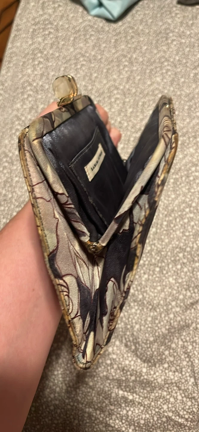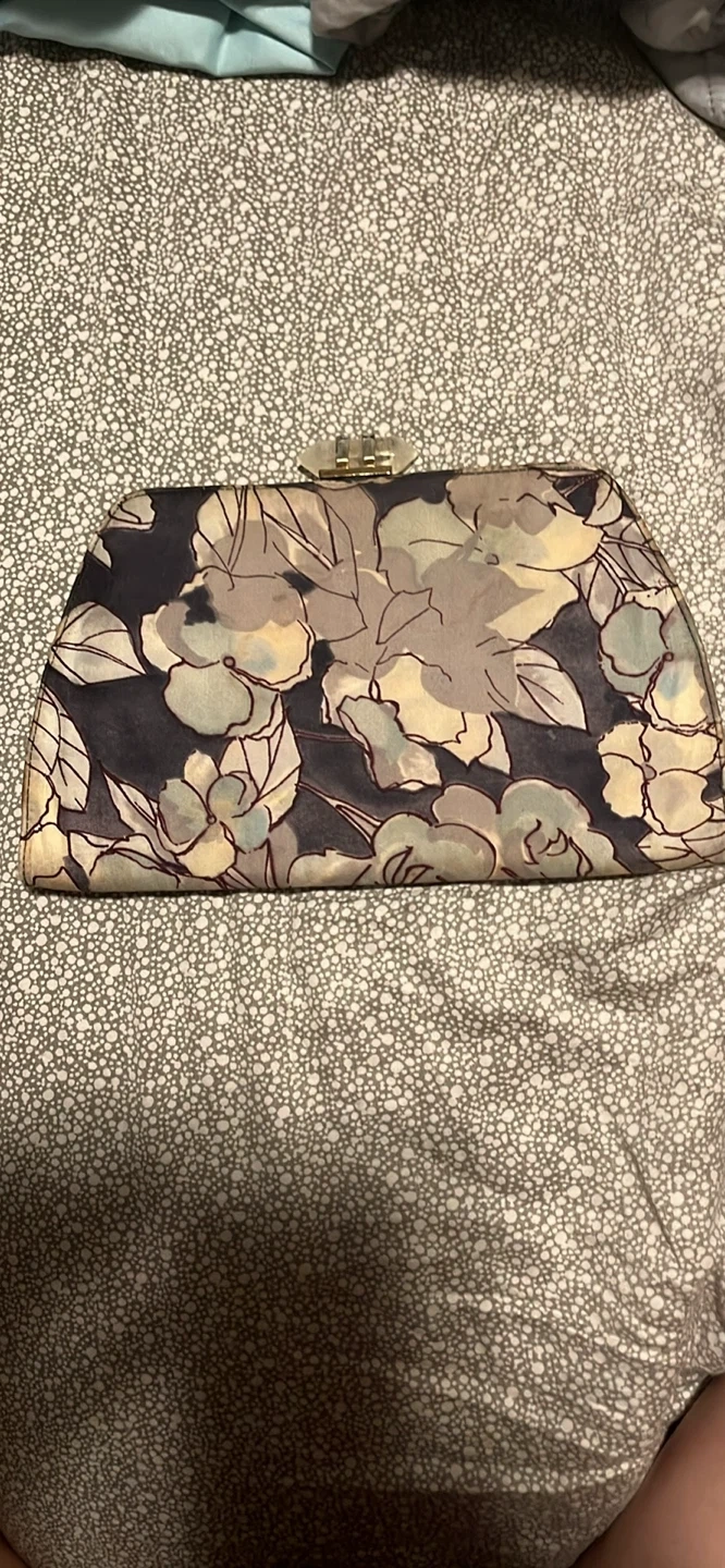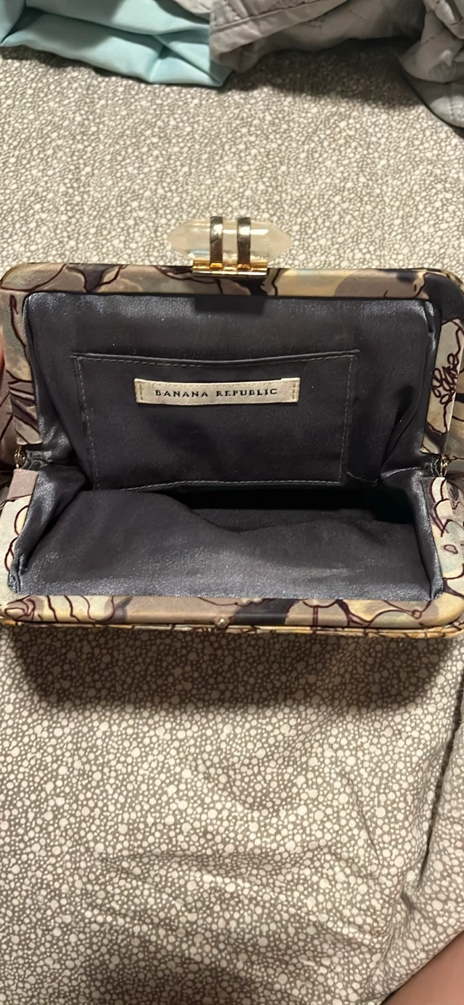 This elegant Banana Republic clutch bag is the perfect accessory for any formal occasion. The dark gray silk exterior is accented with a beautiful floral pattern and a "gem" lock closure. The bag measures 8.75 inches in width, 5 inches in height, and 0.5 inches in depth, making it a small but mighty addition to any outfit. The interior is lined with gray silk and features a snap closure. The bag is lightweight and easy to carry, making it a comfortable choice for weddings, parties, or any formal event. This vintage piece is a must-have for any fashion-forward woman and is sure to make a statement wherever you go.