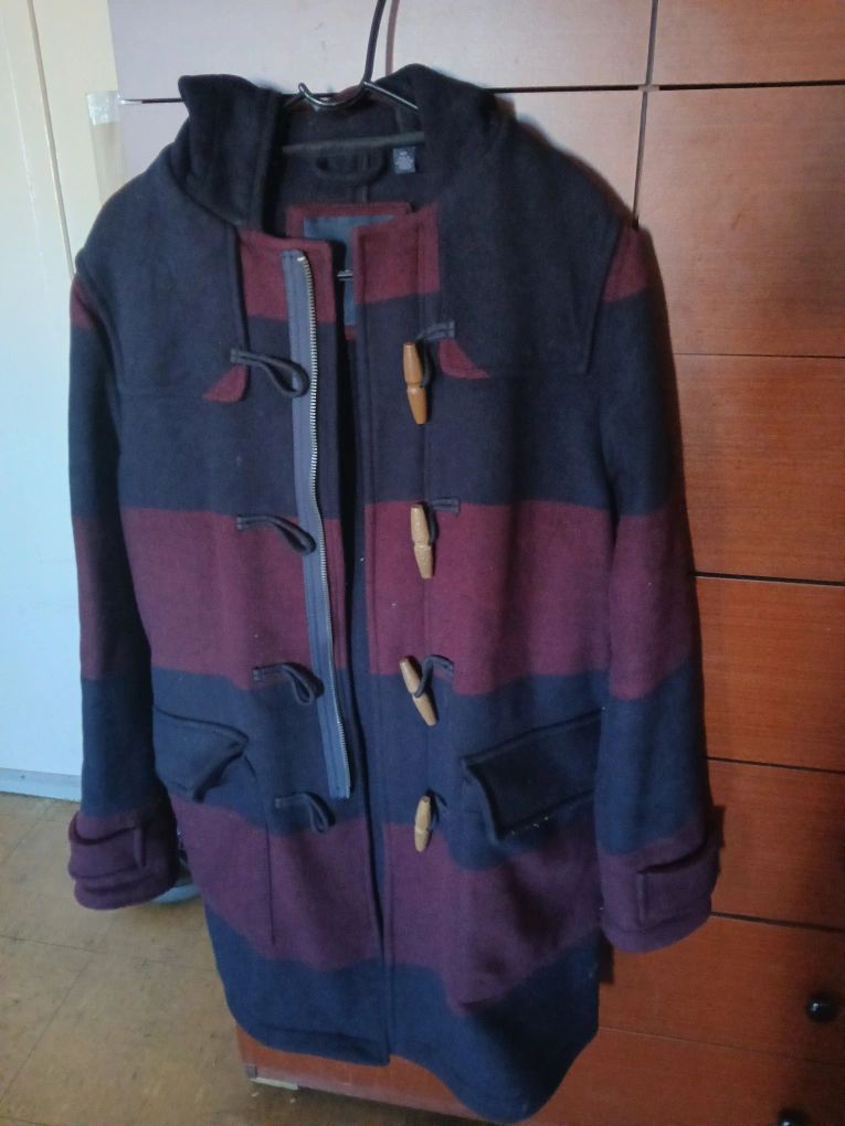 Selling a Banana Republic wool blend duffle coat. It features a stylish striped pattern in navy and burgundy. It's in great condition and perfect for colder weather!