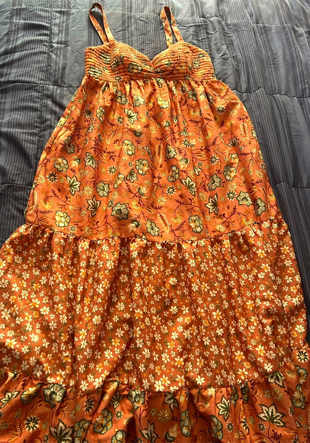 This is a beautiful floral maxi dress from Band of Gypsies! It's perfect for a summer day or a special occasion. The dress features a smocked bodice and a tiered skirt, giving it a flowy and flattering silhouette