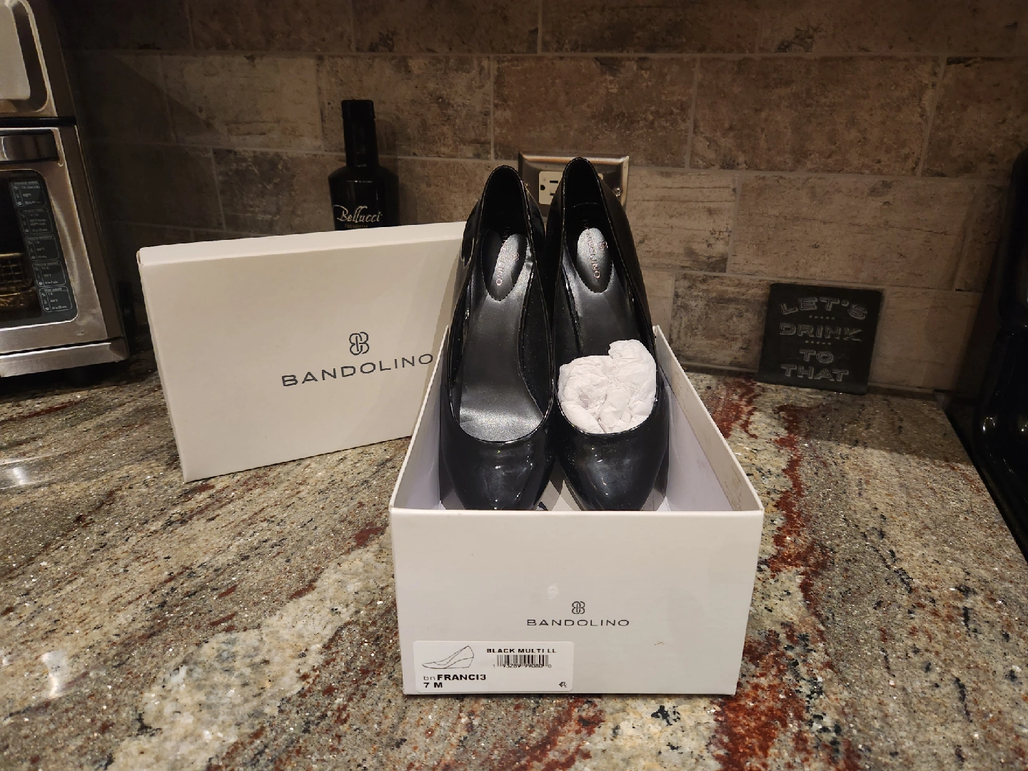 These are a pair of Bandolino wedge heels in size 7M. They have a sleek black patent leather finish and come in the original box. Perfect for adding a touch of elegance to any outfit!