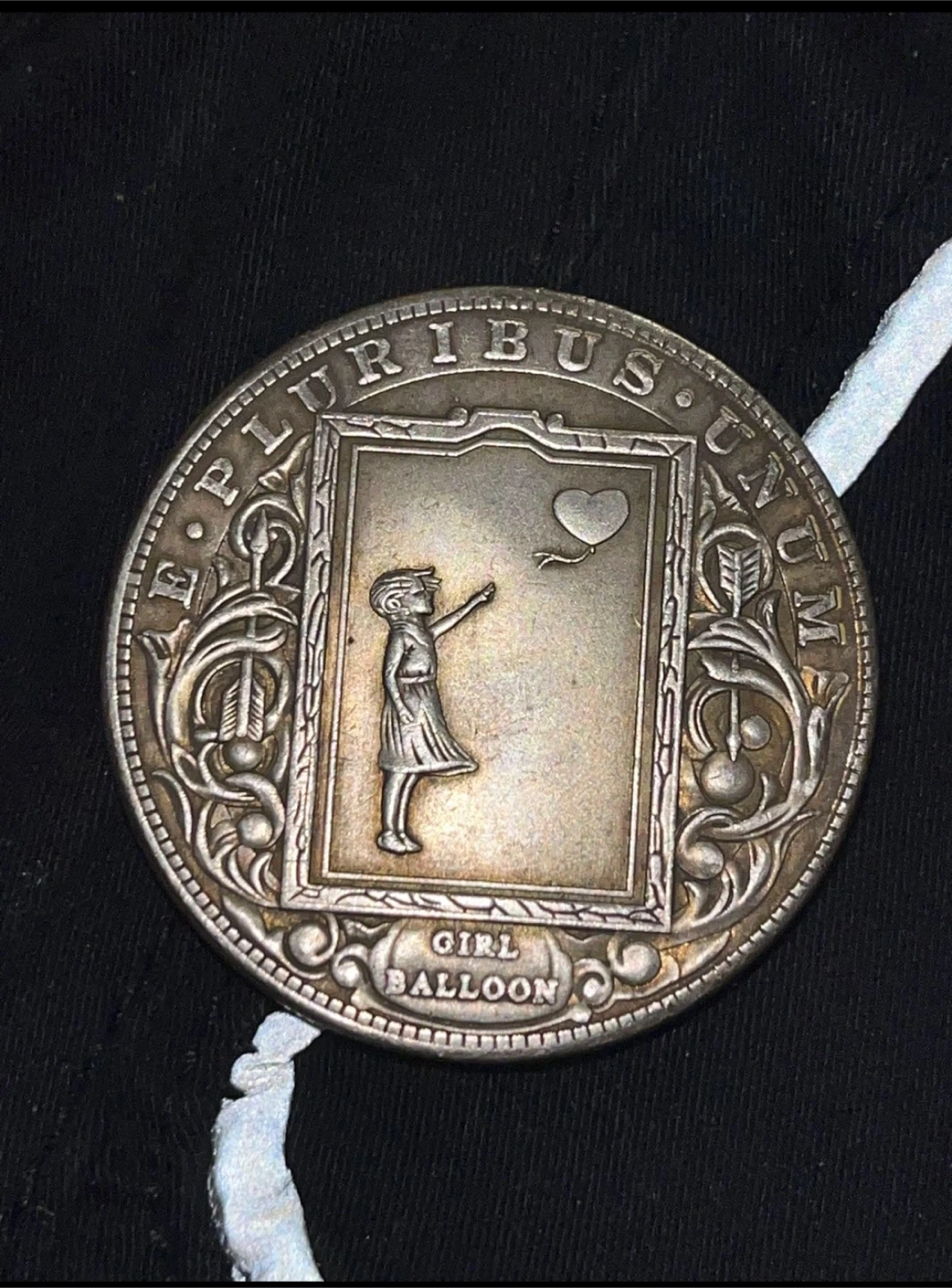 98Collectible, not real currency. Banksy art of balloon girl on one side and one dollar US coin on the other. (Not made by Banksy). 9 available.