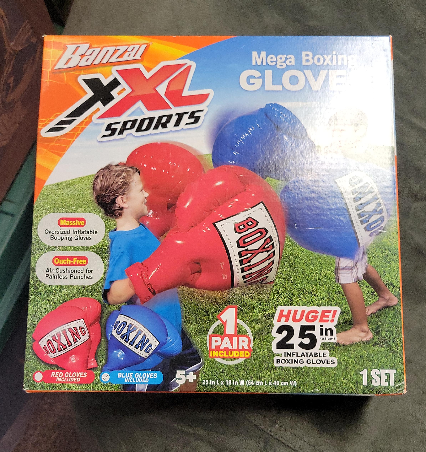 Selling a brand new set of Banzai XXL Sports Mega Boxing Gloves! These are oversized inflatable bopping gloves that are air-cushioned for painless punches. Includes one pair with both red and blue gloves. Each glove is a huge 25 inches!