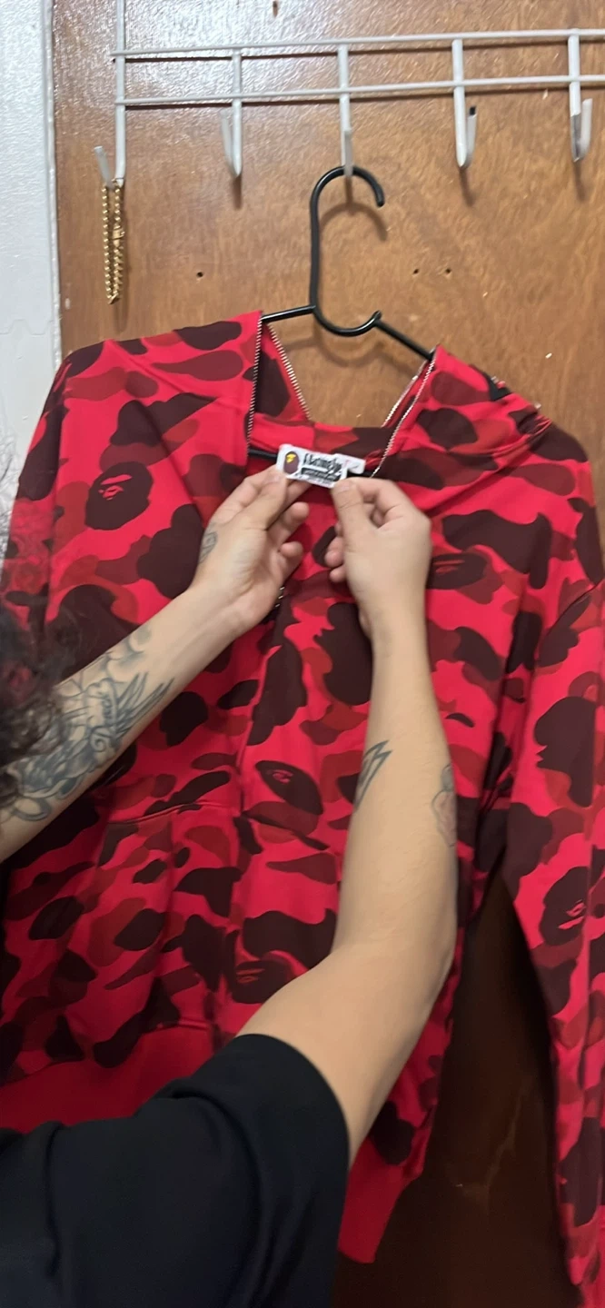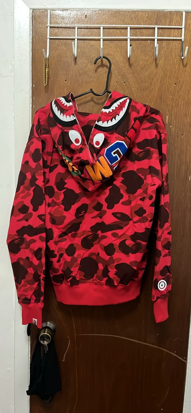 10Selling a BAPE full zip hoodie with the iconic shark design on the hood and the all-over red camo pattern. It's in great condition and ready for a new home! This is a stylish and eye-catching piece.