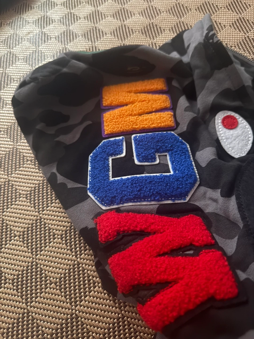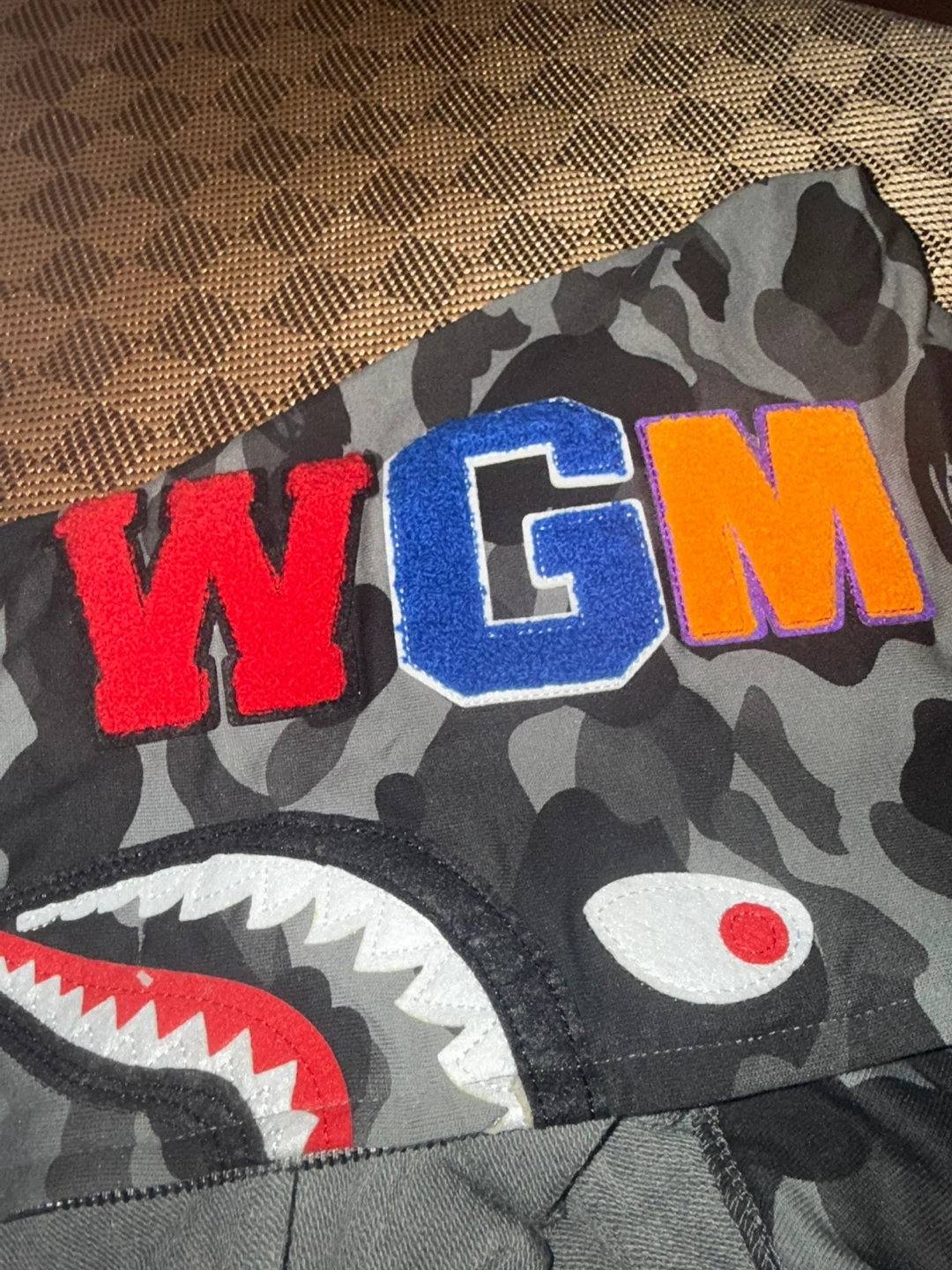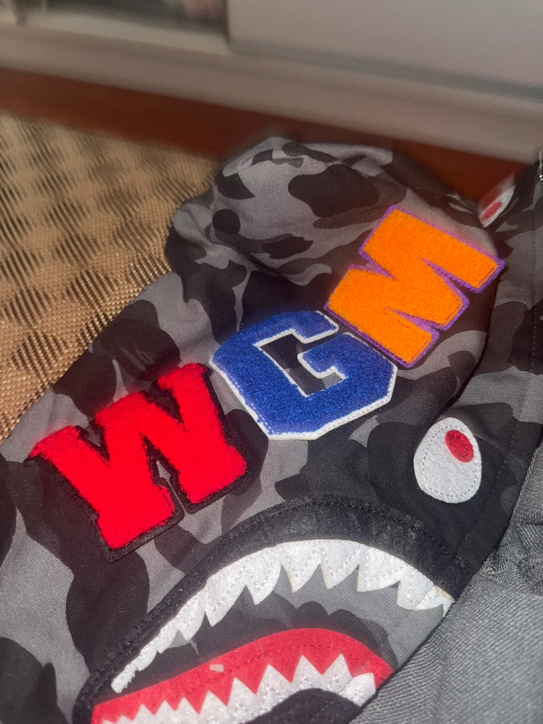12Selling a BAPE shark hoodie. It features the iconic shark design with the WGM lettering. Great for adding a unique touch to your wardrobe!