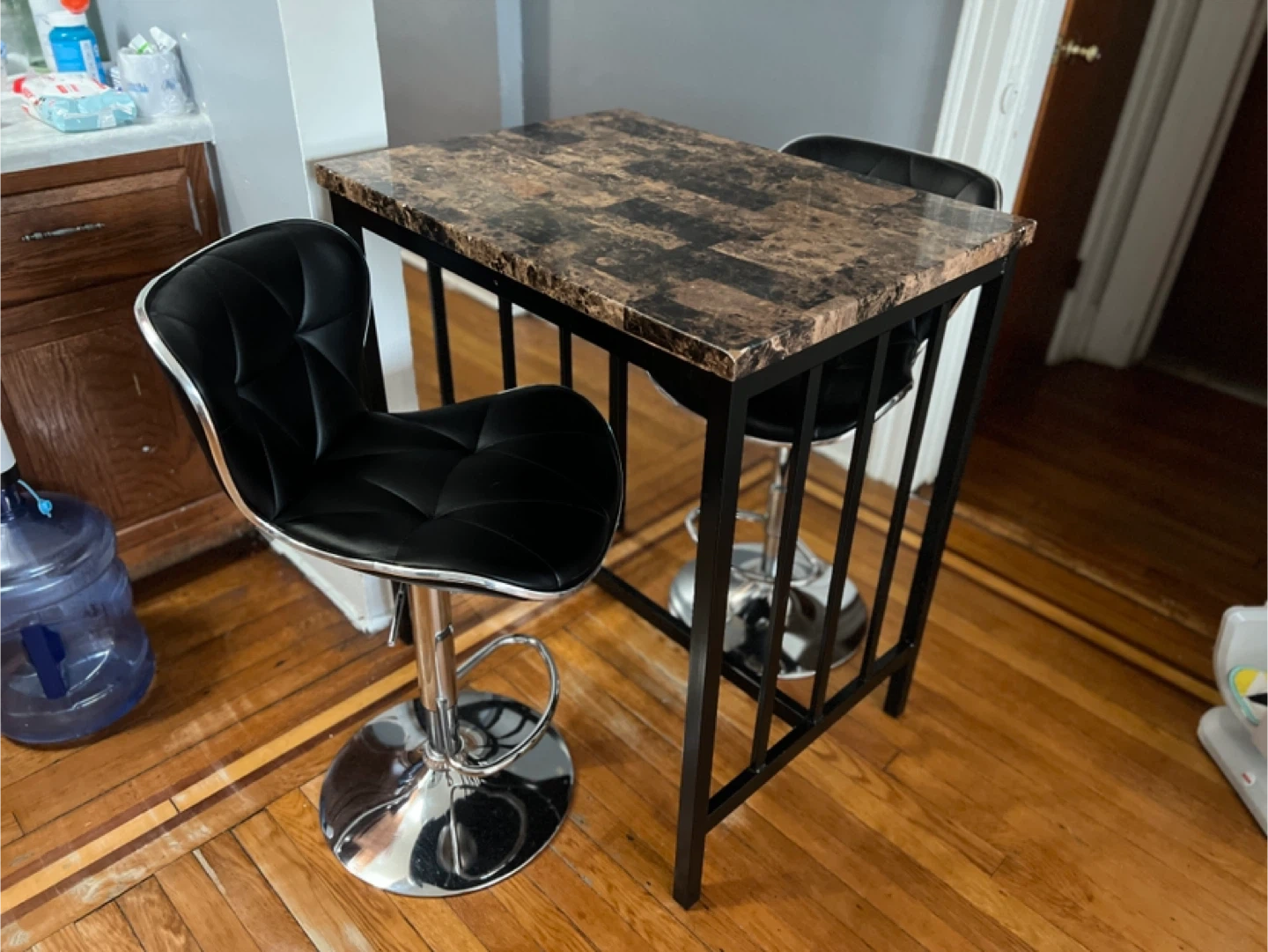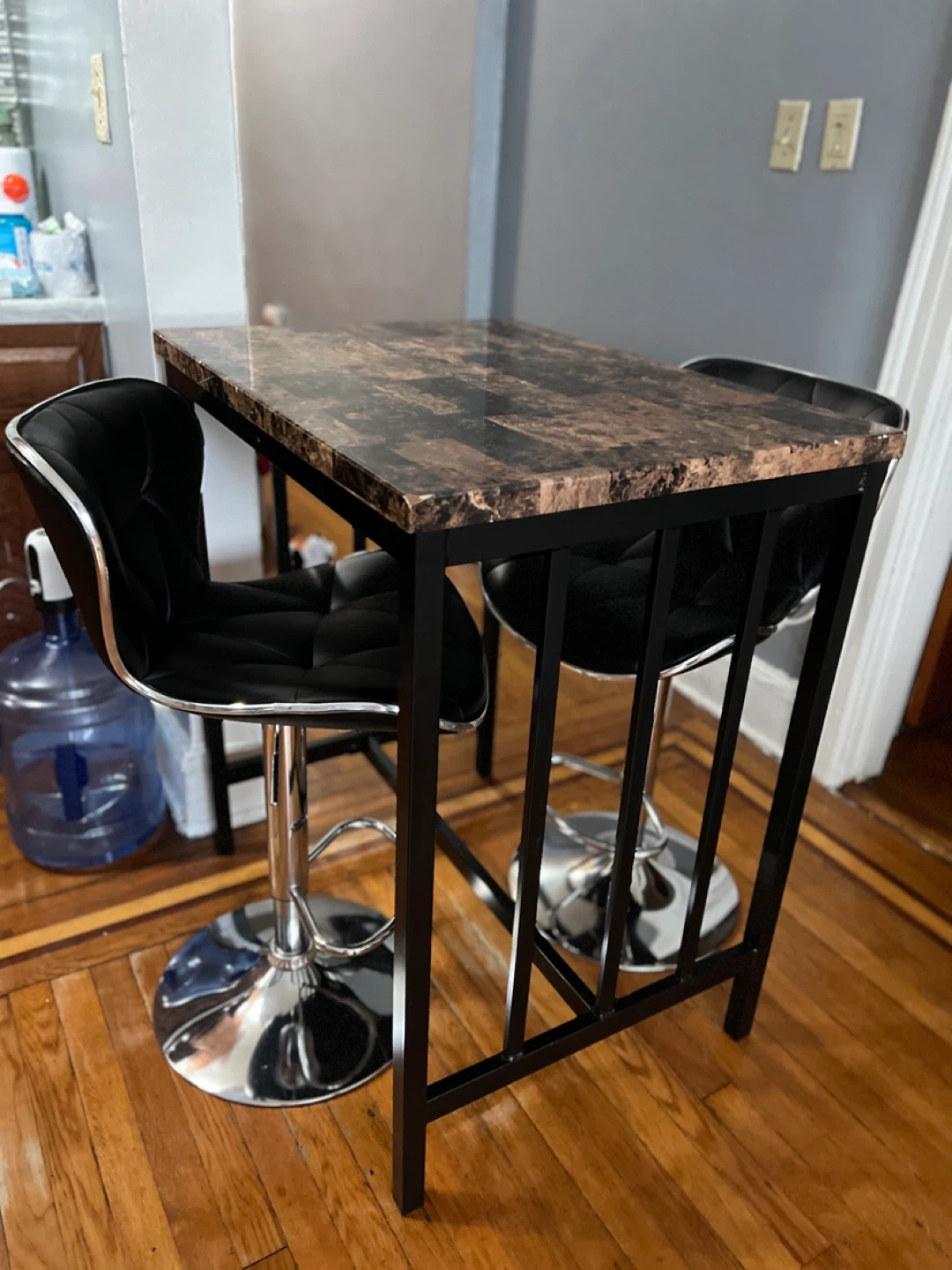 65Selling a bar table set that includes two swivel chairs! The table has a unique brown marble-patterned top with a black metal frame. The chairs are black with a chrome base and swivel for easy movement. Great for a small dining area or kitchen nook