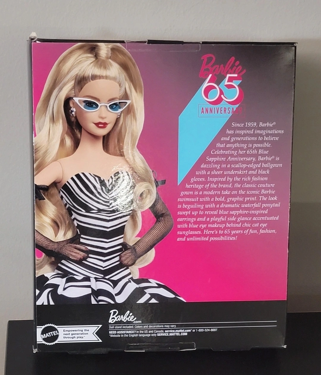 Selling a brand new Barbie 65th Anniversary doll, still in its original box! This doll is dazzling in a scallop-edged ballgown with a sheer underskirt and black gloves. Inspired by the rich fashion heritage of the brand, the classic couture gown is a modern take on the iconic Barbie swimsuit with a bold, graphic print. The look is beguiling with a dramatic waterfall ponytail swept up to reveal blue sapphire-inspired earrings and a playful side glance accentuated with blue eye makeup behind chic cat eye sunglasses. Here's to 65 years of fun, fashion, and unlimited possibilities!