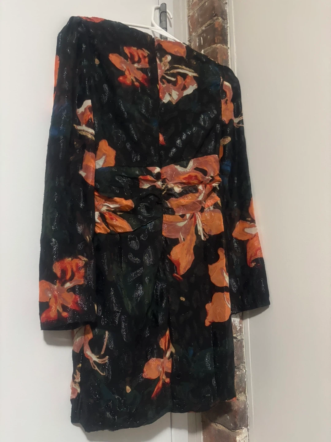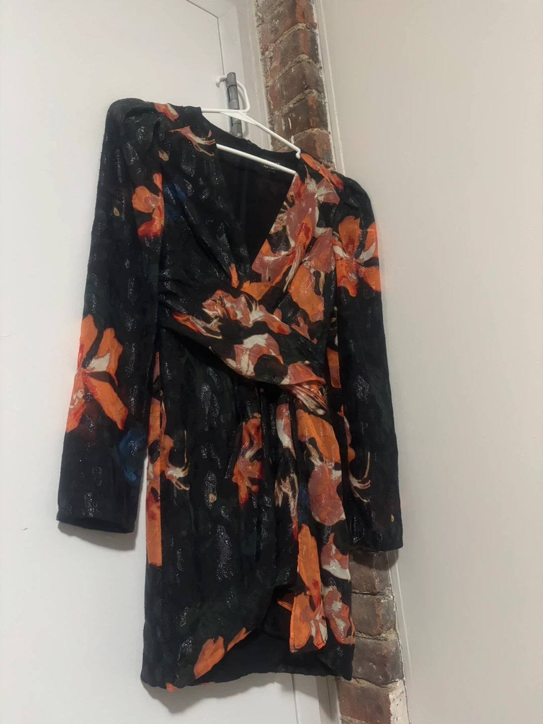 This is a Bardot mini dress with a black background and a floral print in shades of orange and white. It has long sleeves and a v-neckline. The dress has a gathered detail at the waist.