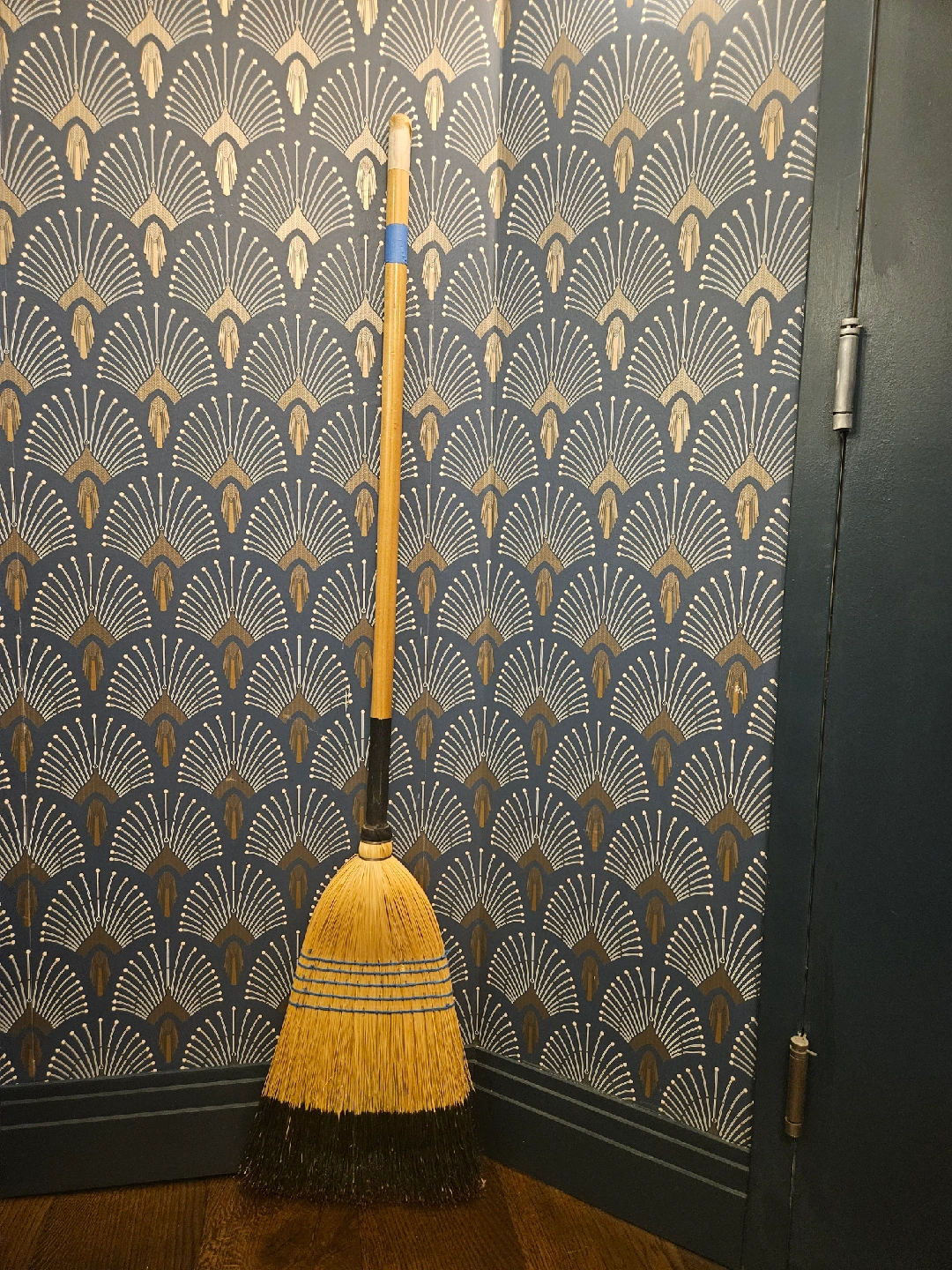 10I'm selling a used broom. It features natural straw bristles with black-dyed ends, bound with blue twine. The handle is made of wood. This is a substantial broom. Nothing flimsy, plastic, or cheap. It's barely been used as a broom. It's been used more as a piece of artwork. Similar new brooms sell for over $100. https://pin.it/3NsJ39tTe