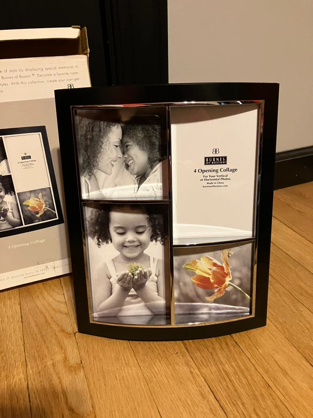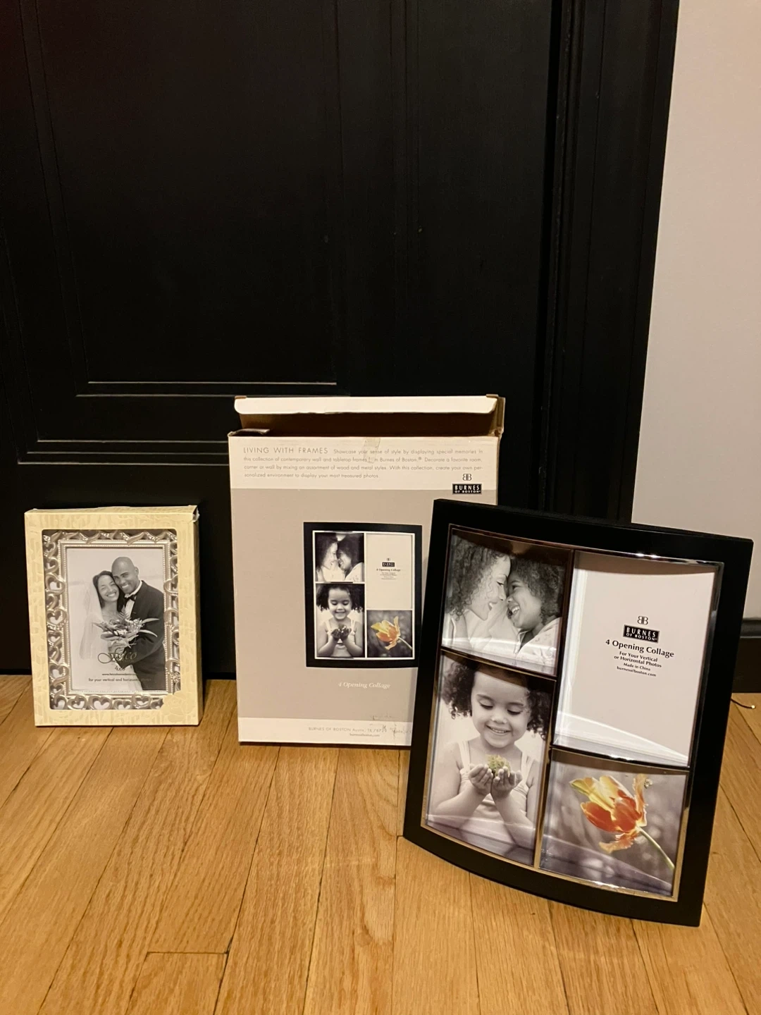 120I have a couple of Barnes & Noble collage picture frames for sale! One is a 4-opening collage frame, and the other is a smaller, single-photo frame with a decorative border. They're perfect for displaying your favorite memories in a stylish way. $5 price is for both togetherš¤