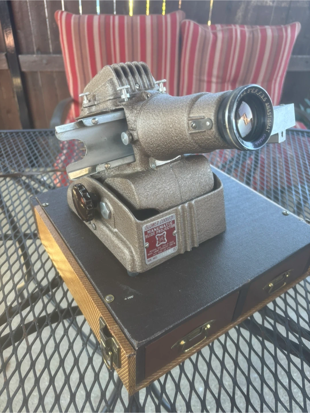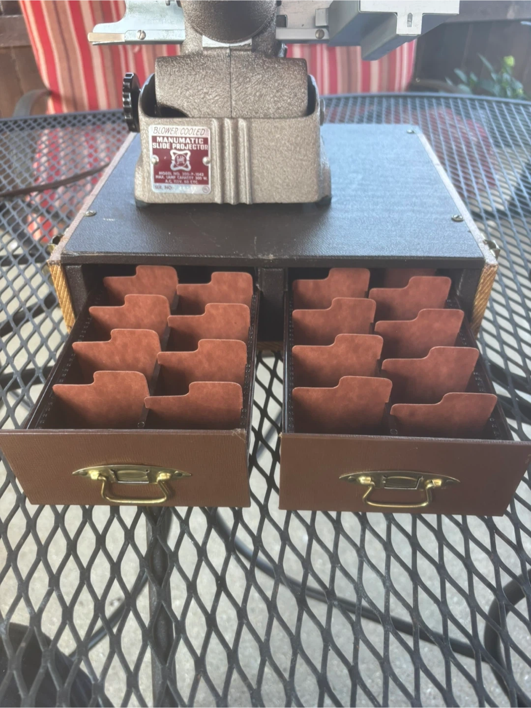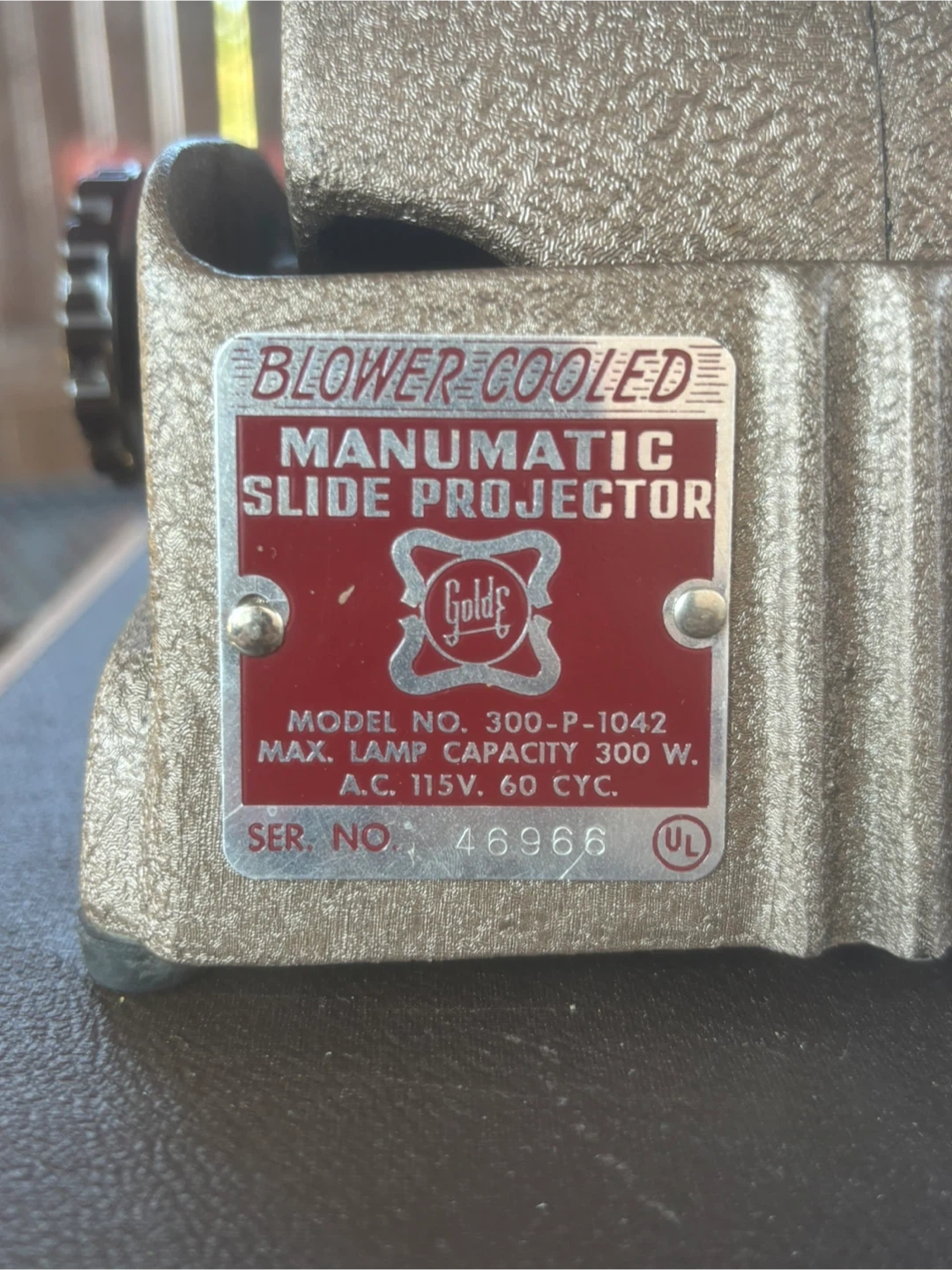 1950s GoldE Manumatic Film Slide Projector, case and 2 cabinets, operational and in great condition, Model and Serial Number in photos.