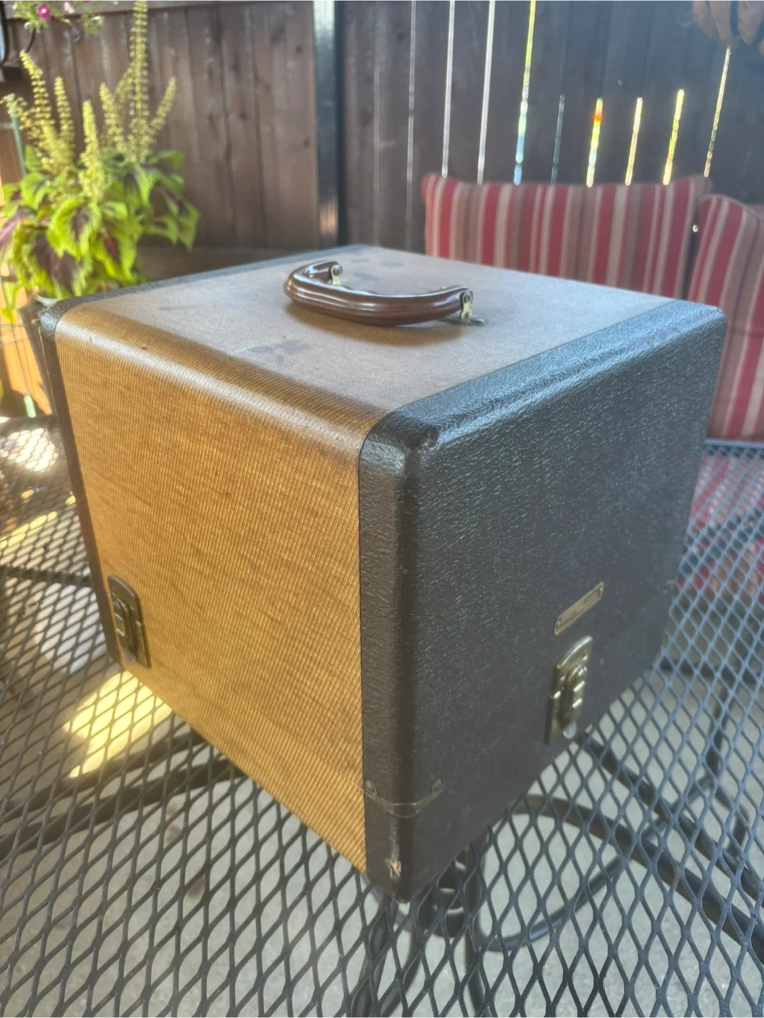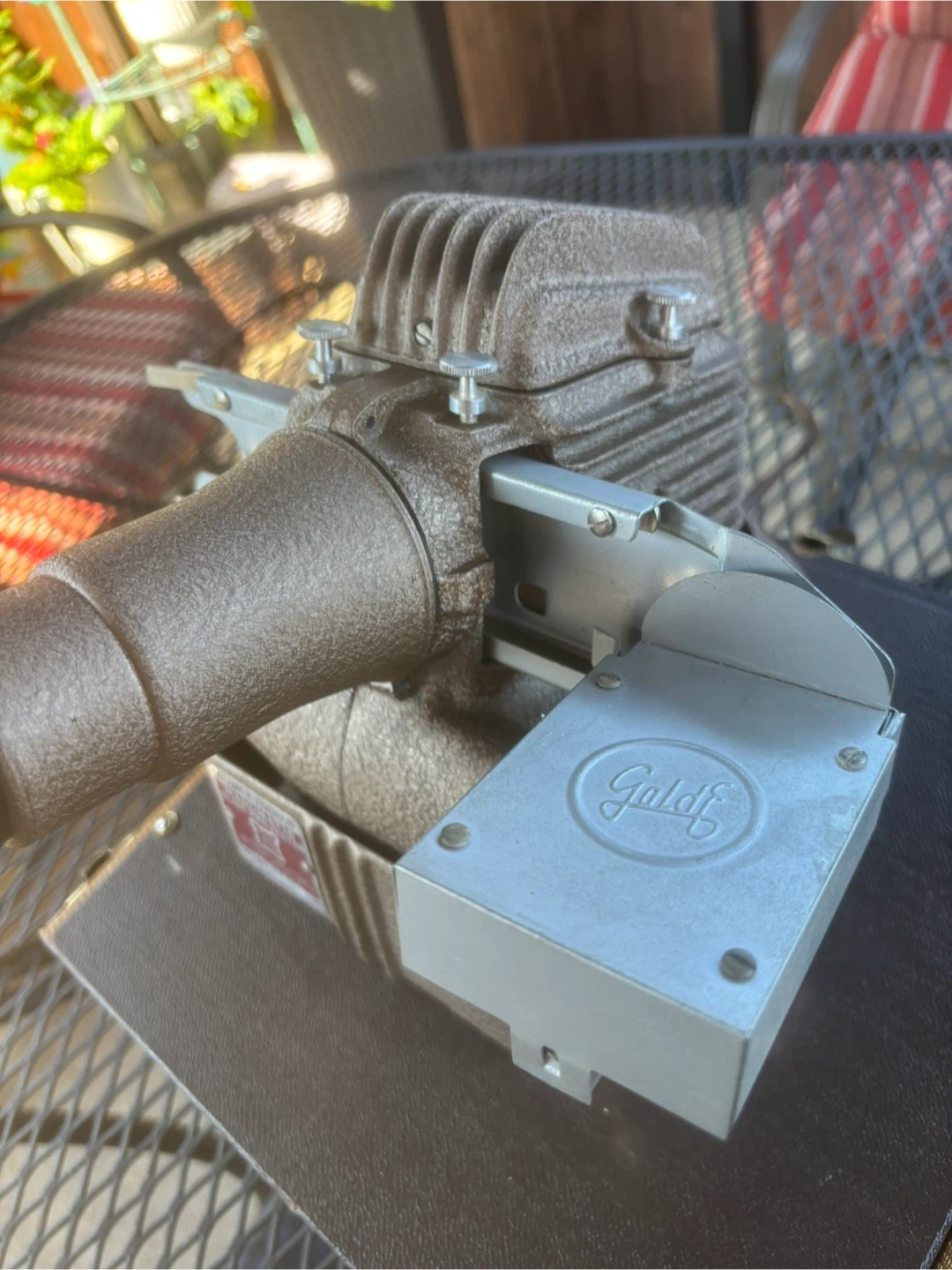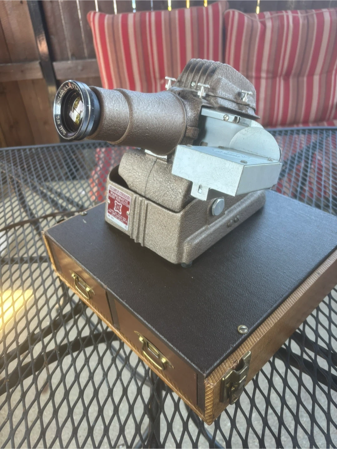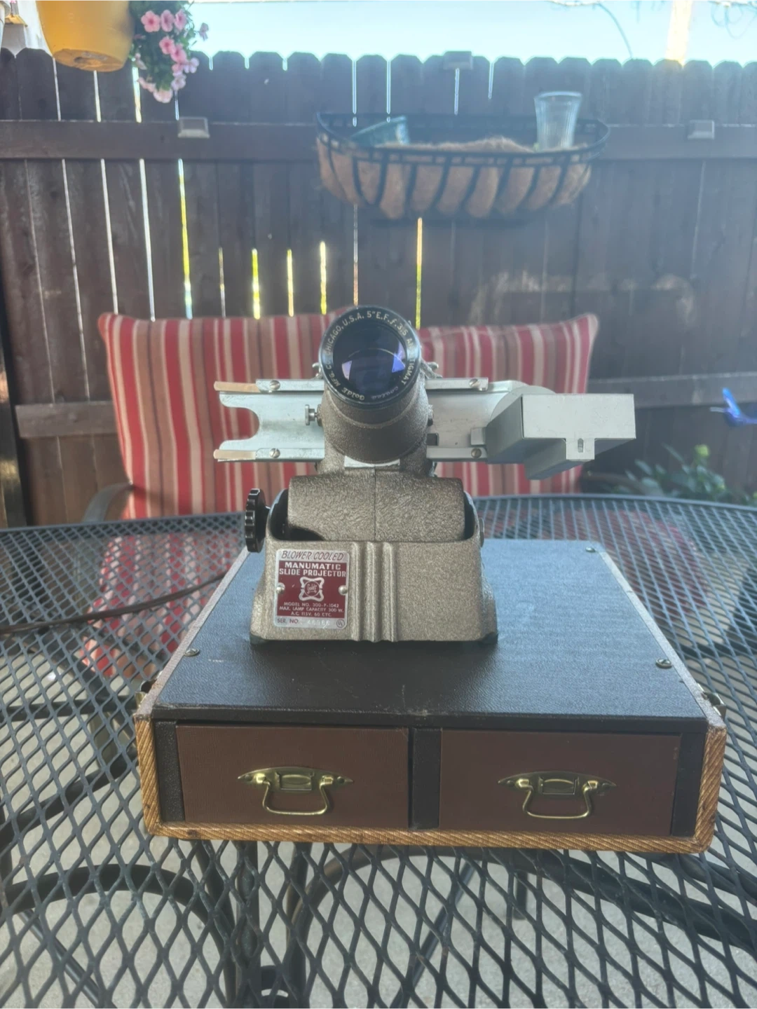 1950s GoldE Manumatic Film Slide Projector, case and 2 cabinets, operational and in great condition, Model and Serial Number in photos.