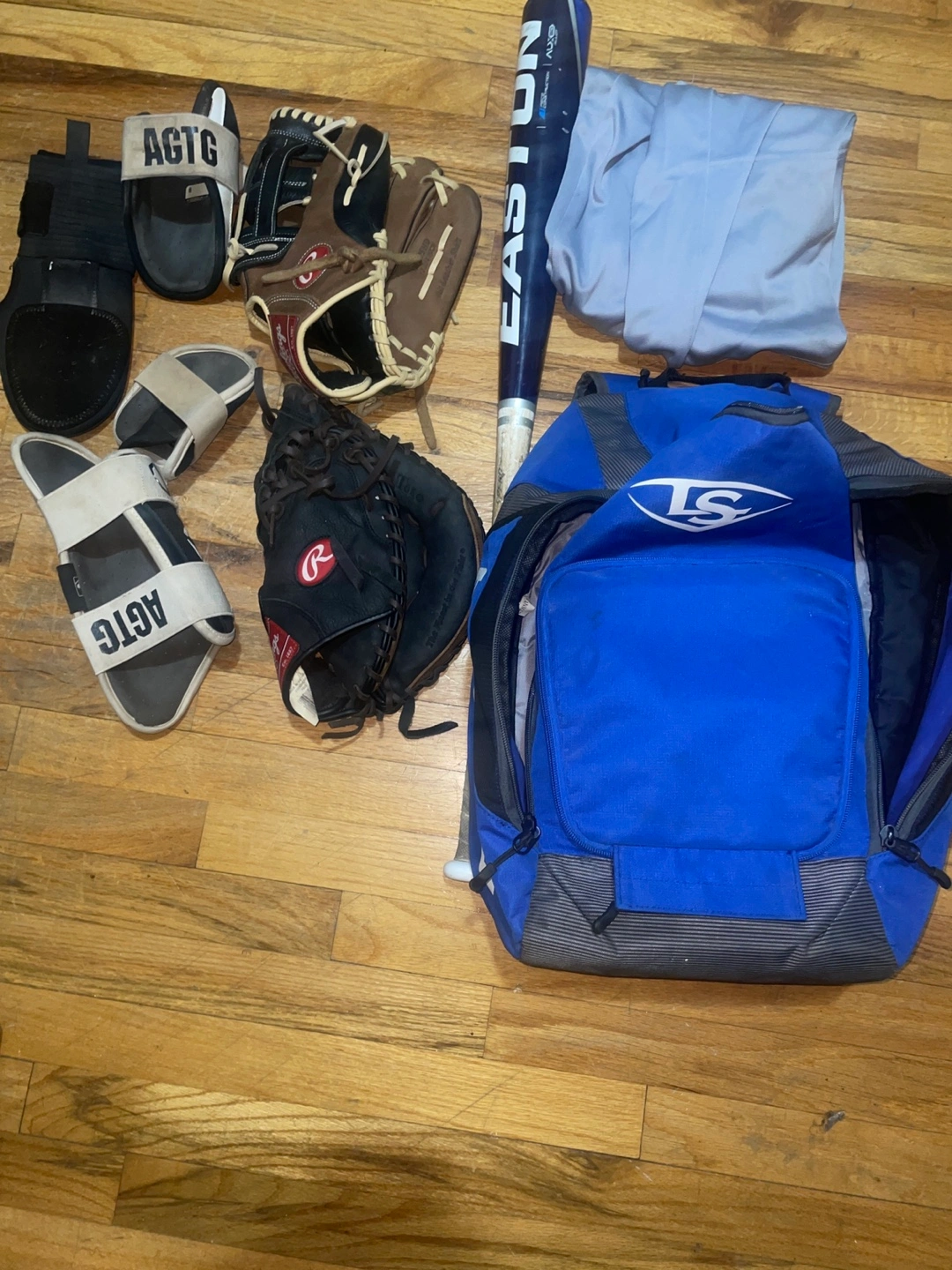 baseball equipment bundle. Includes two Rawlings baseball gloves, Easton bat, ACTG slides, and a blue and gray baseball bag. Great for youth players. Extra pair of grey and red&blue pants ask for more information!
