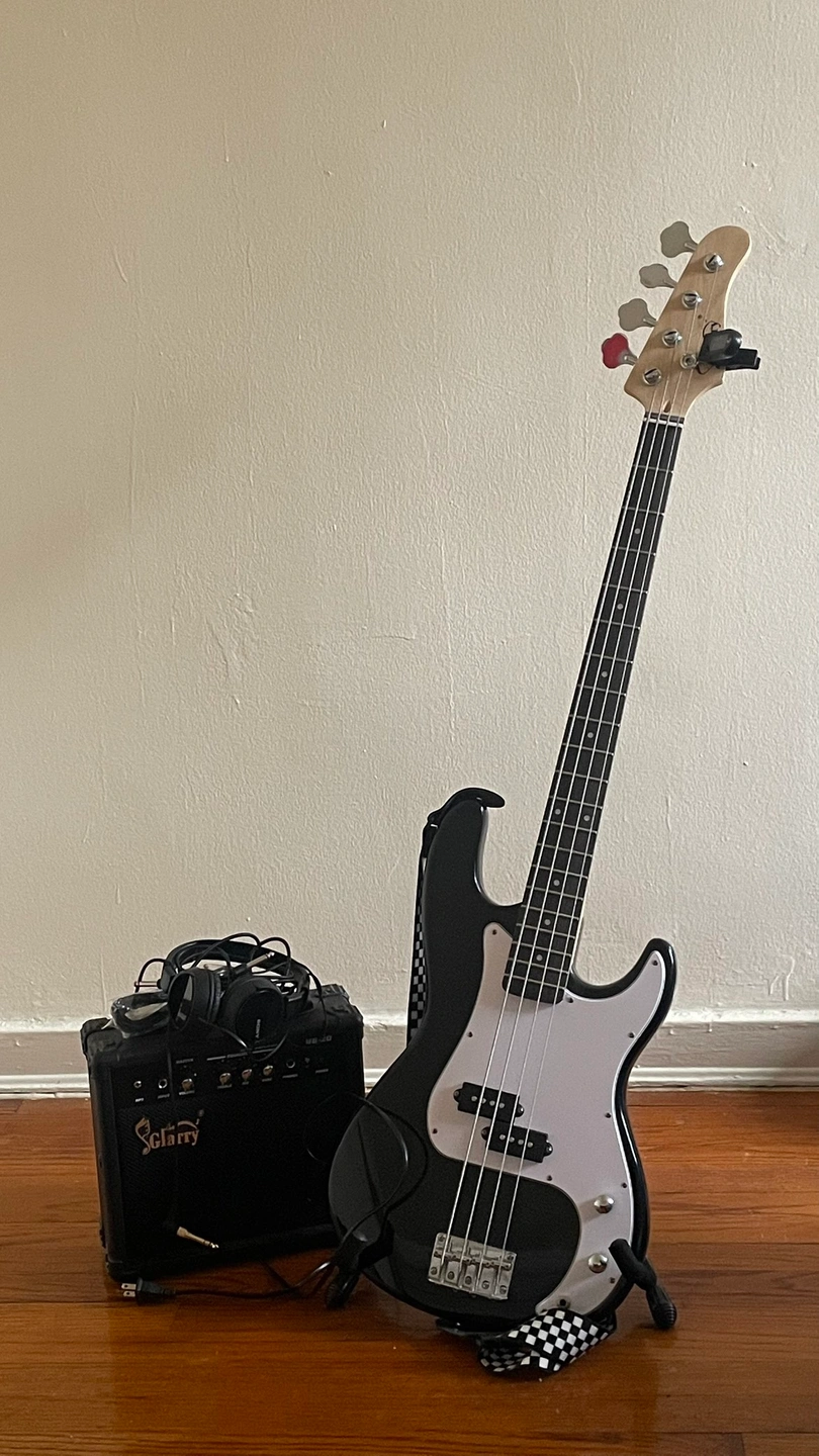 Bass guitar with Amp Stand Headphone Shoulder strap Amp cord Bass Tuner Bag If you have question, text me.