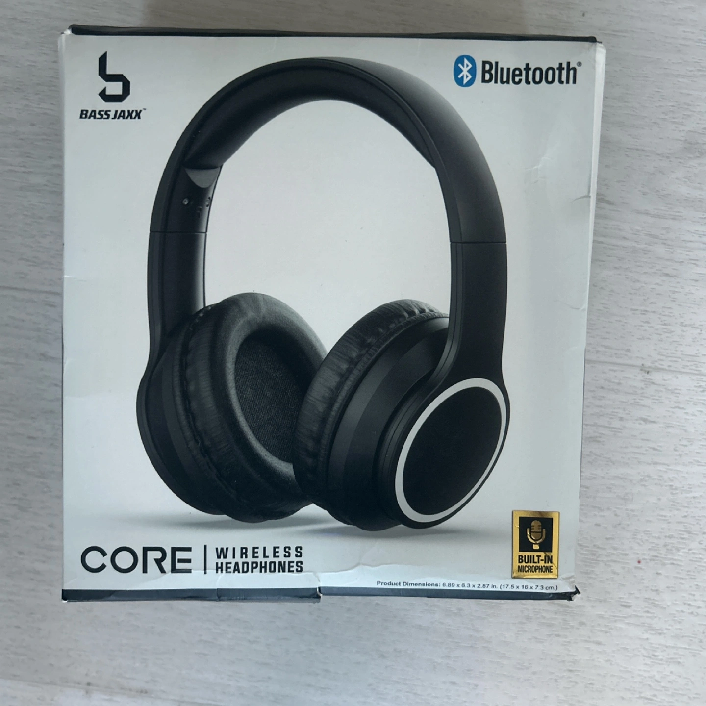 65Selling a pair of Bass Jaxx Core wireless headphones! They come in their original box and have a built-in microphone. The product dimensions are 6.89 x 6.3 x 2.87 inches. Enjoy wireless listening with these Bluetooth headphones!