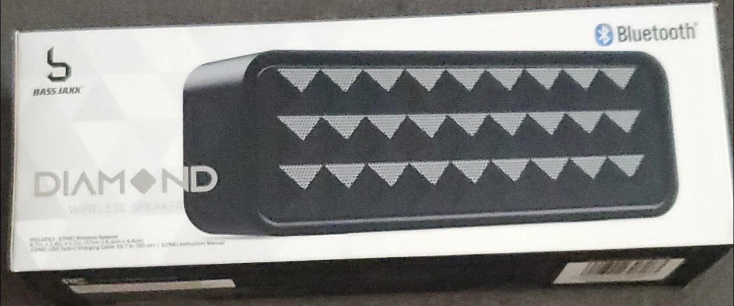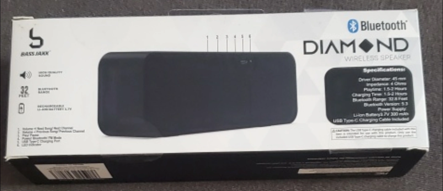 Selling a brand new Bass Jaxx Diamond Wireless Speaker! It's still in the box and has never been used. Key features include: - High-quality sound - Bluetooth connectivity - 32 feet Bluetooth range - Rechargeable Li-ion battery It's compatible with iPhones, Android smartphones, iPads, and wireless audio players. The box includes the speaker, a USB Type-C charging cable, and an instruction manual