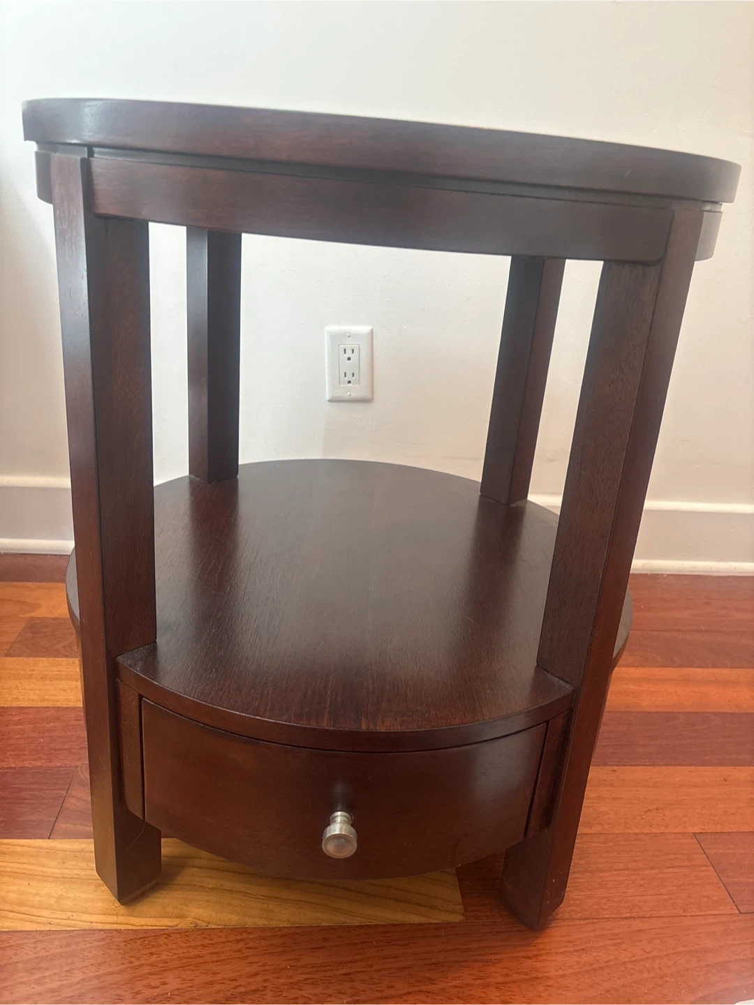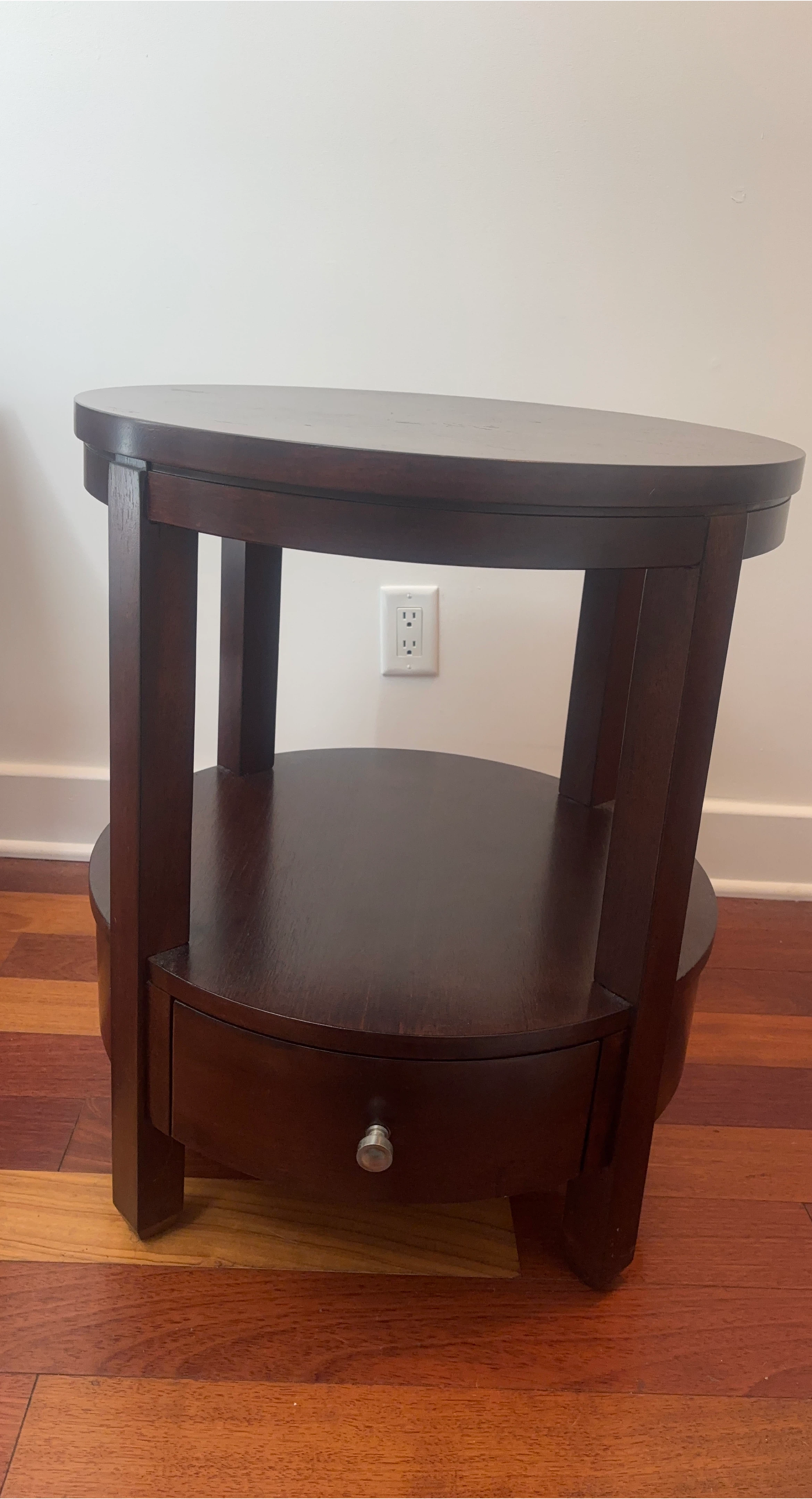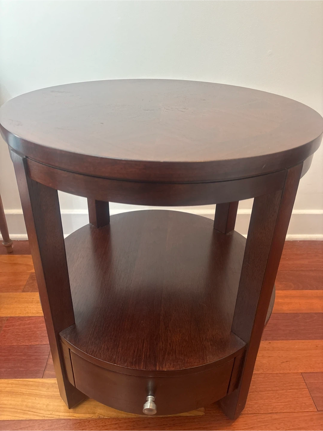 Selling a Bassett dark wood end table ! It's round and has a drawer for storage and is very sturdy in very good condition. Great for adding a touch of elegance to any room