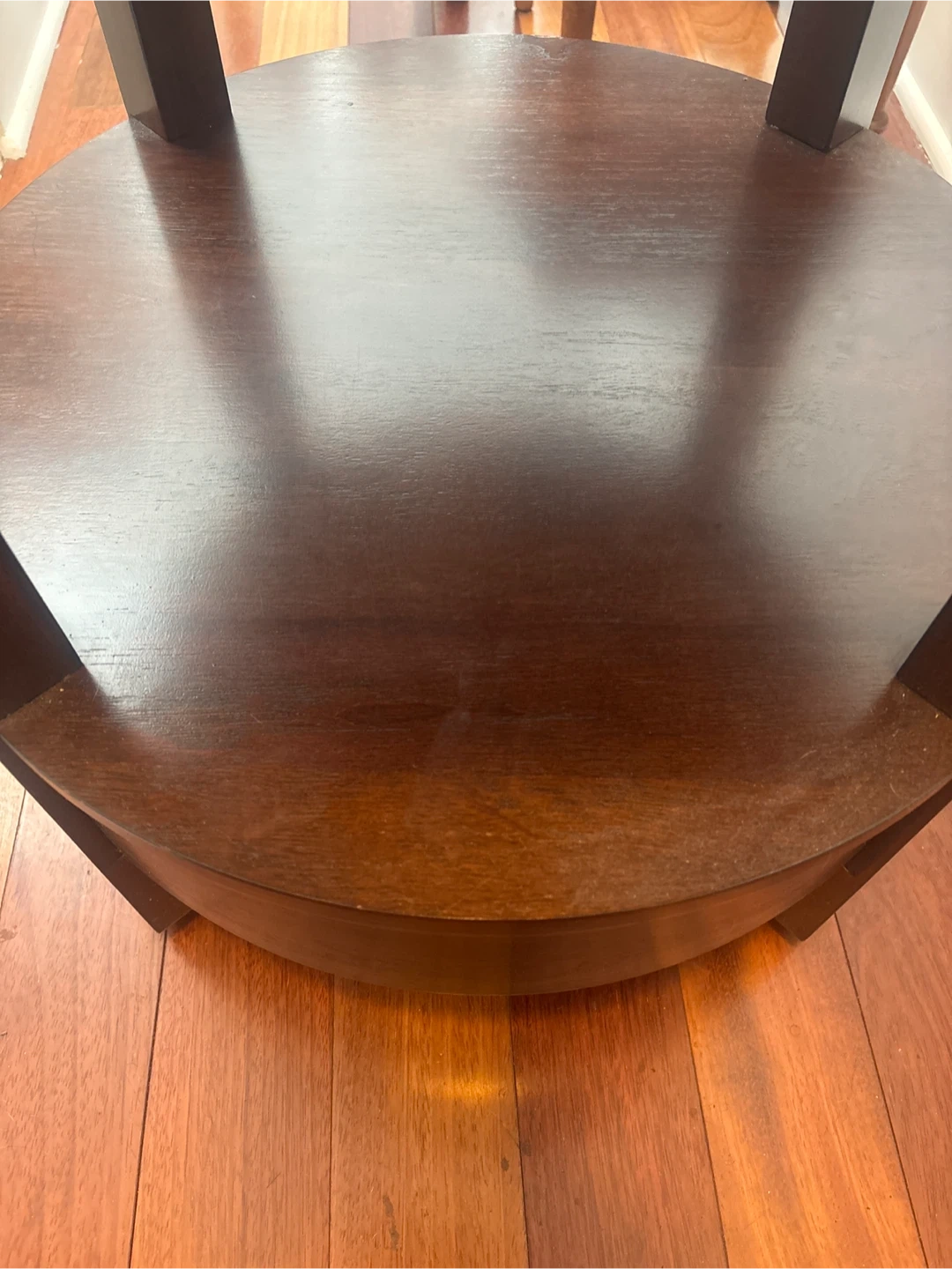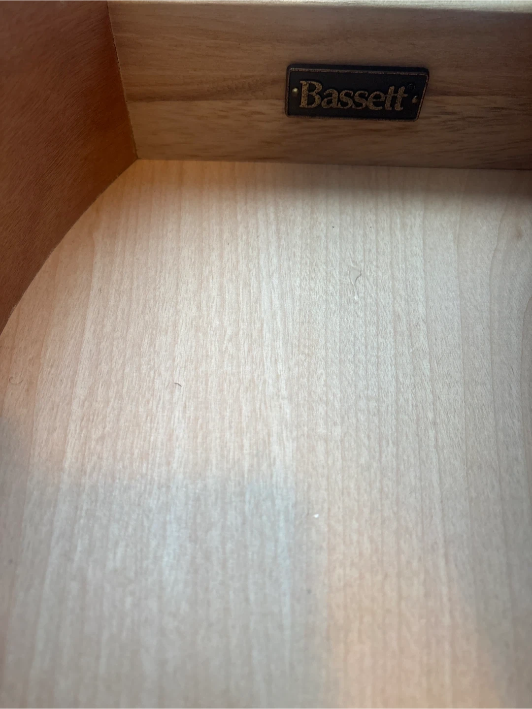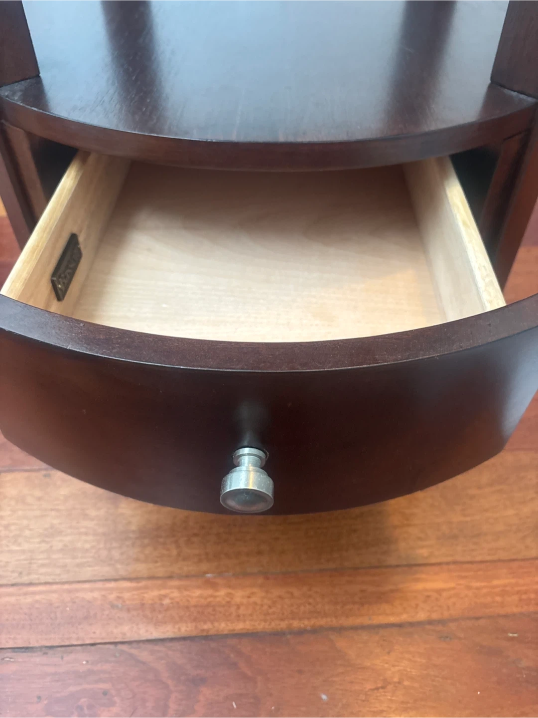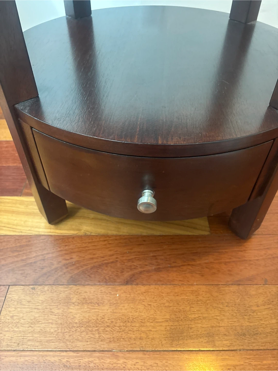 Selling a Bassett dark wood end table ! It's round and has a drawer for storage and is very sturdy in very good condition. Great for adding a touch of elegance to any room