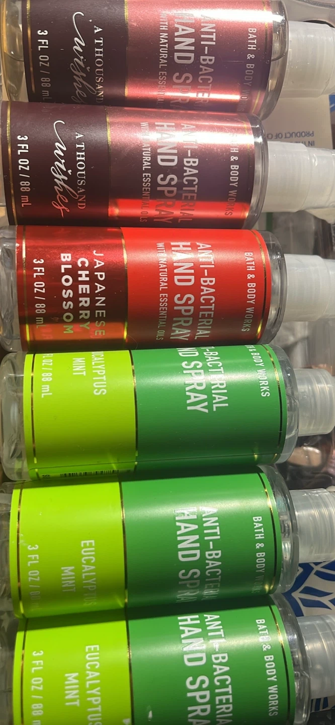 65I'm selling Bath & Body Works hand sanitizer sprays! They come in various scents like A Thousand Wishes, Japanese Cherry Blossom, and Eucalyptus Mint. Each bottle contains 3 fl oz / 88 mL and has antibacterial properties with natural essential oils $2 each !! These are new !!! Take them all for $12! You won't get cheaper than this !!! Wilson and Ashland If posted it's available