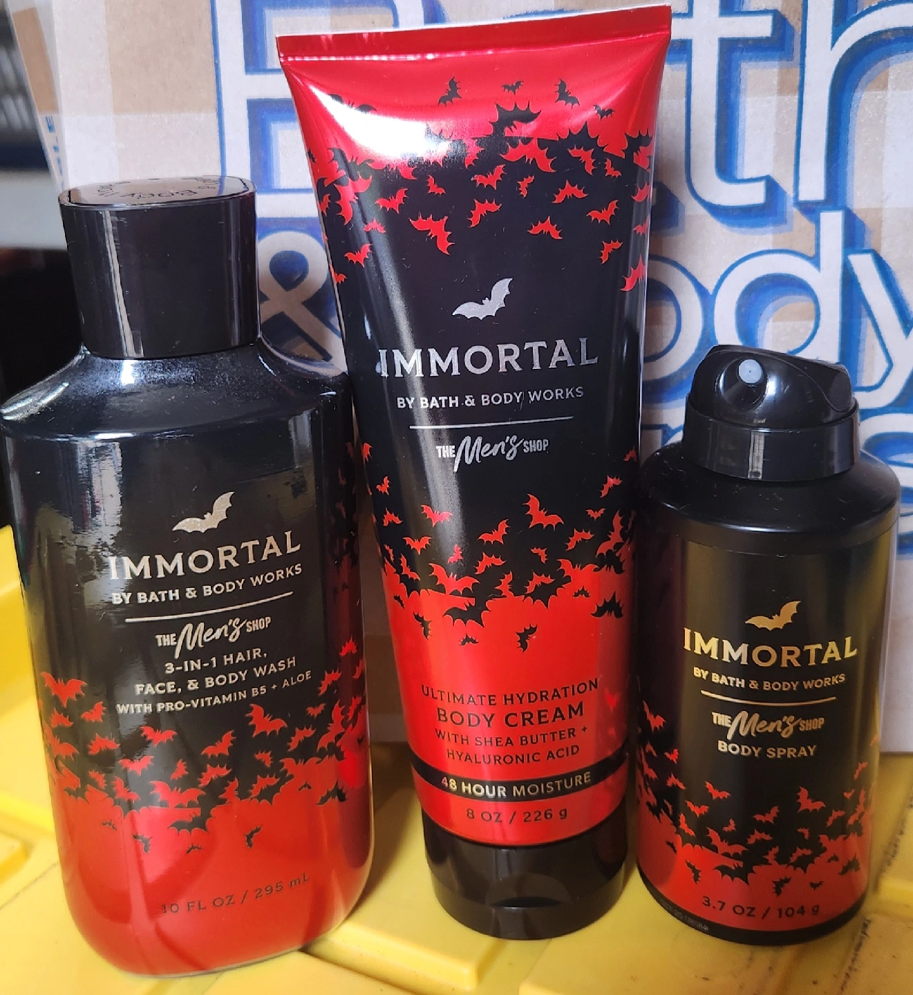 Selling a Bath & Body Works Immortal set from The Men's Shop! Includes: - 3-in-1 Hair, Face, & Body Wash (10 fl oz / 295 mL) with Pro-Vitamin B5 + Aloe - Ultimate Hydration Body Cream (8 oz / 226 g) with Shea Butter + Hyaluronic Acid for 48-hour moisture - Body Spray (3.7 oz / 104 g)