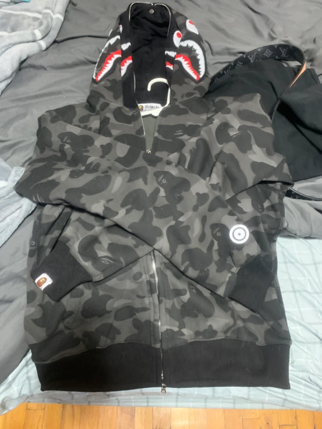 Selling a BAPE (Bathing Ape) Shark Full Zip Hoodie in size L(fits like M). It features a cool camouflage pattern and the iconic shark design on the hood. It comes with the original packaging!