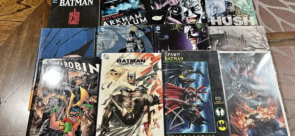 Used as is. Hardcover noel Tpb hush Hardcover the joker a celebration of 75 years Tpb death in the family Tpb dark knight strikes again Comic Batman Arkham knight Hardcover heart of hush Let me know if you're interested!