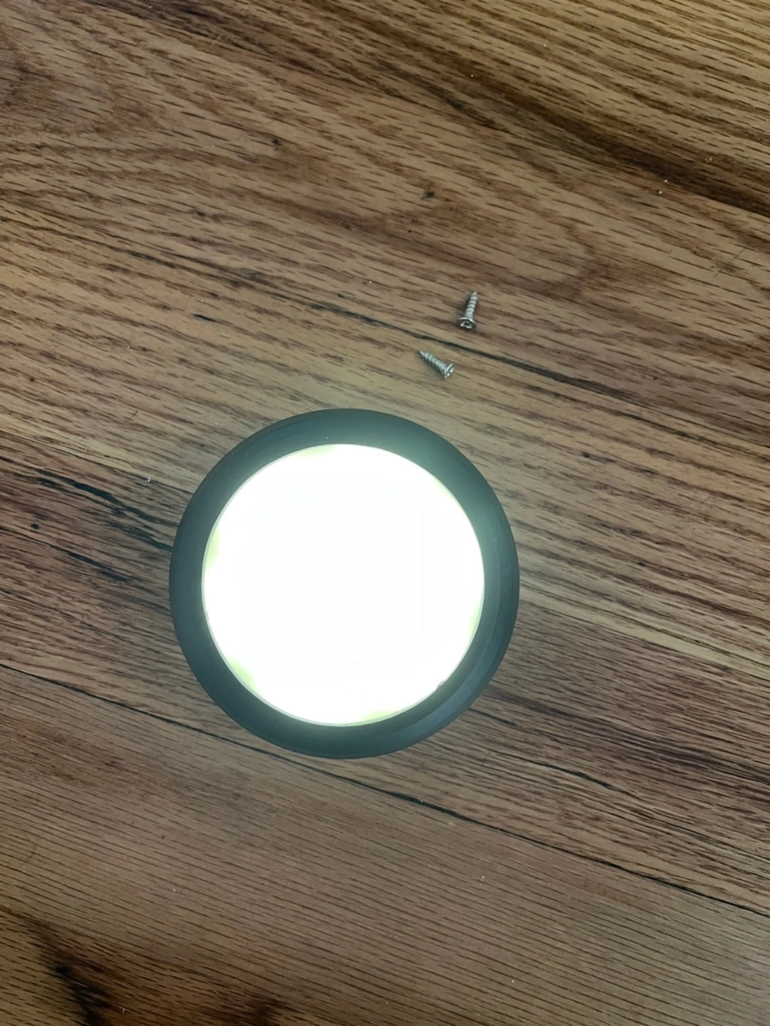 162Round battery operated puck light. Black plastic housing. Includes mounting screws. Great for closets, cabinets, or under-shelf lighting. Can be mounted with included screws or command strips for more renter-friendly option!