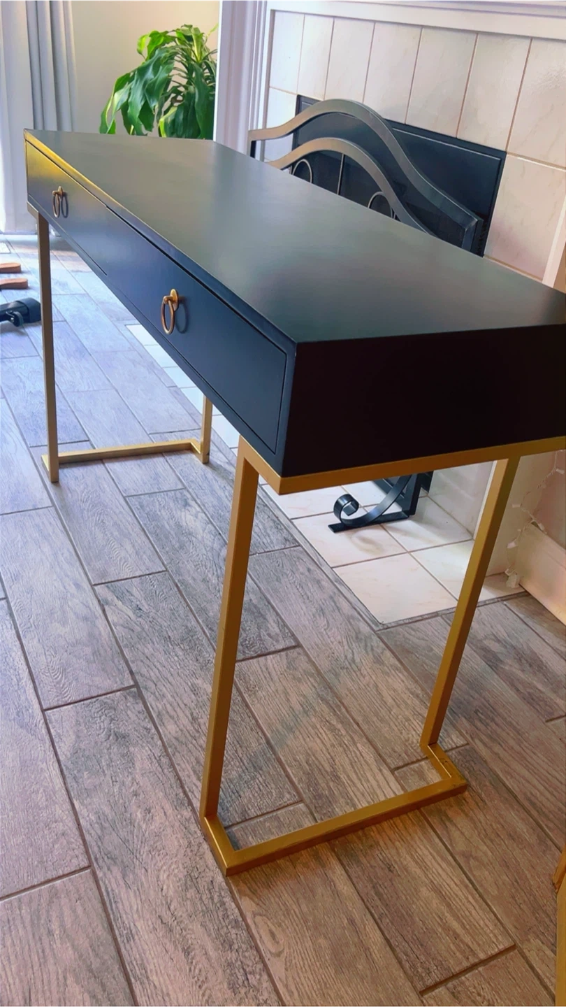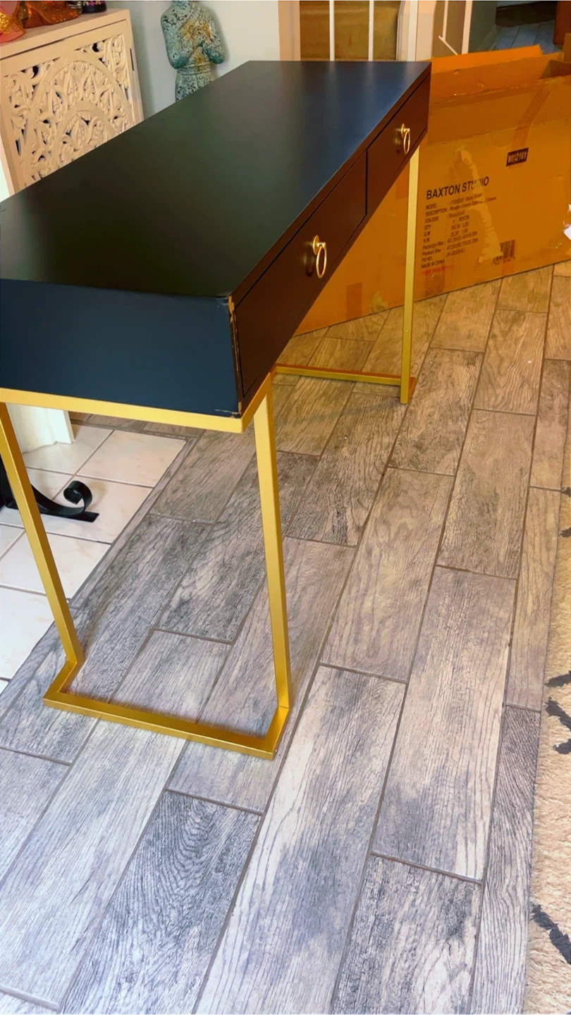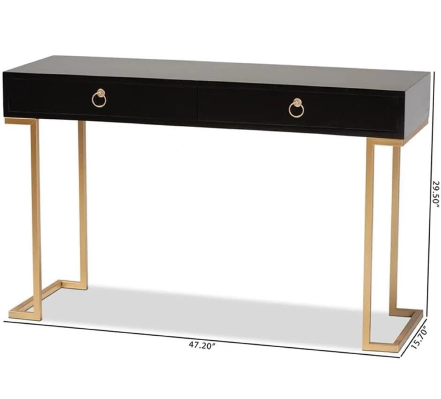 Selling a Baxton Studio console desk with a sleek black top and gold legs. It has two drawers with ring pulls. Dimensions are approximately 47.2" wide, 15.7" deep, and 29.5" high. There are some signs of wear on the edges, as pictured