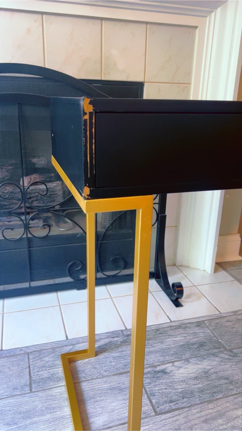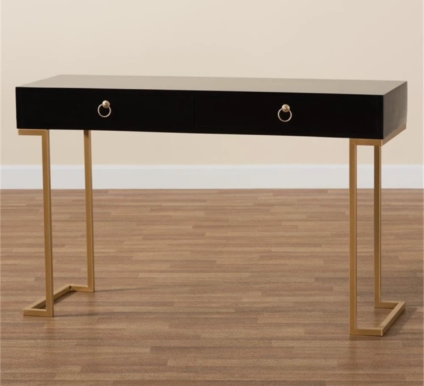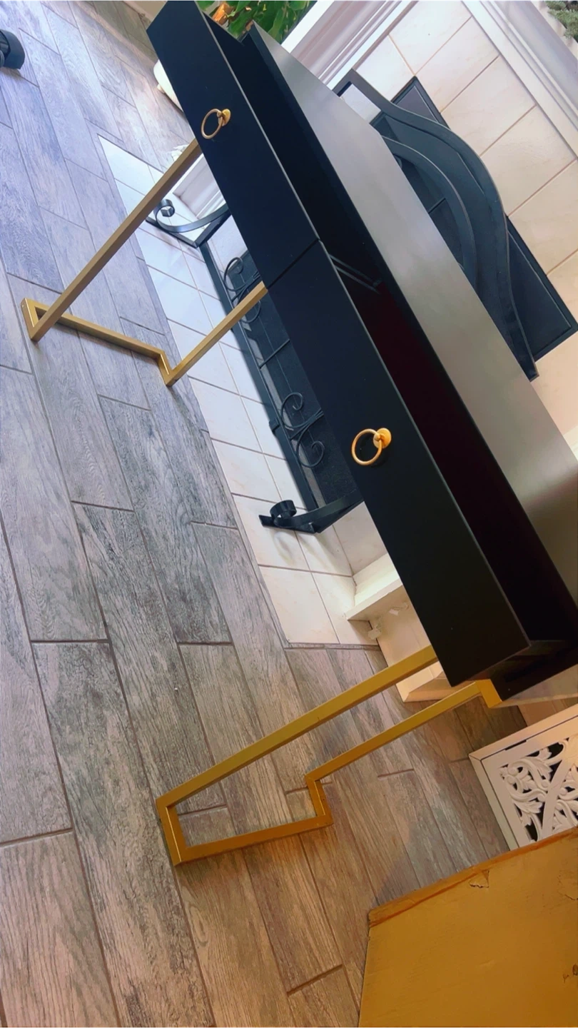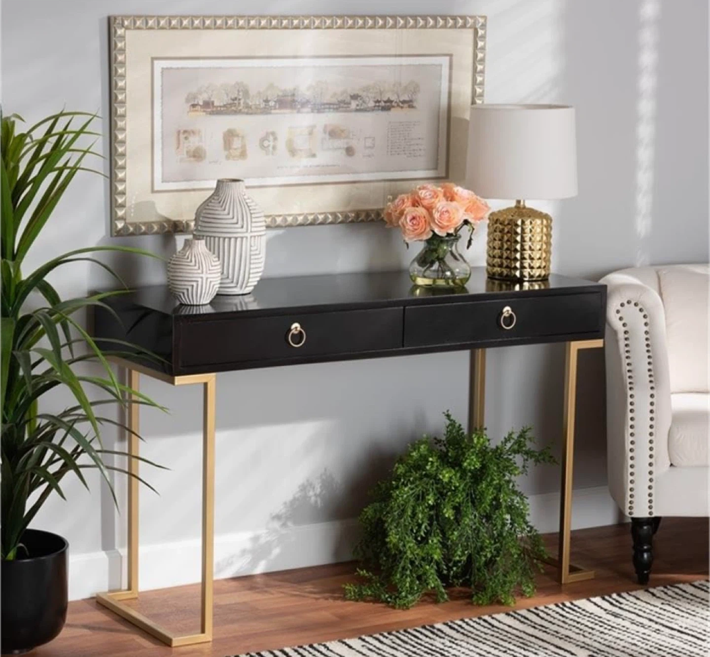 Selling a Baxton Studio console desk with a sleek black top and gold legs. It has two drawers with ring pulls. Dimensions are approximately 47.2" wide, 15.7" deep, and 29.5" high. There are some signs of wear on the edges, as pictured