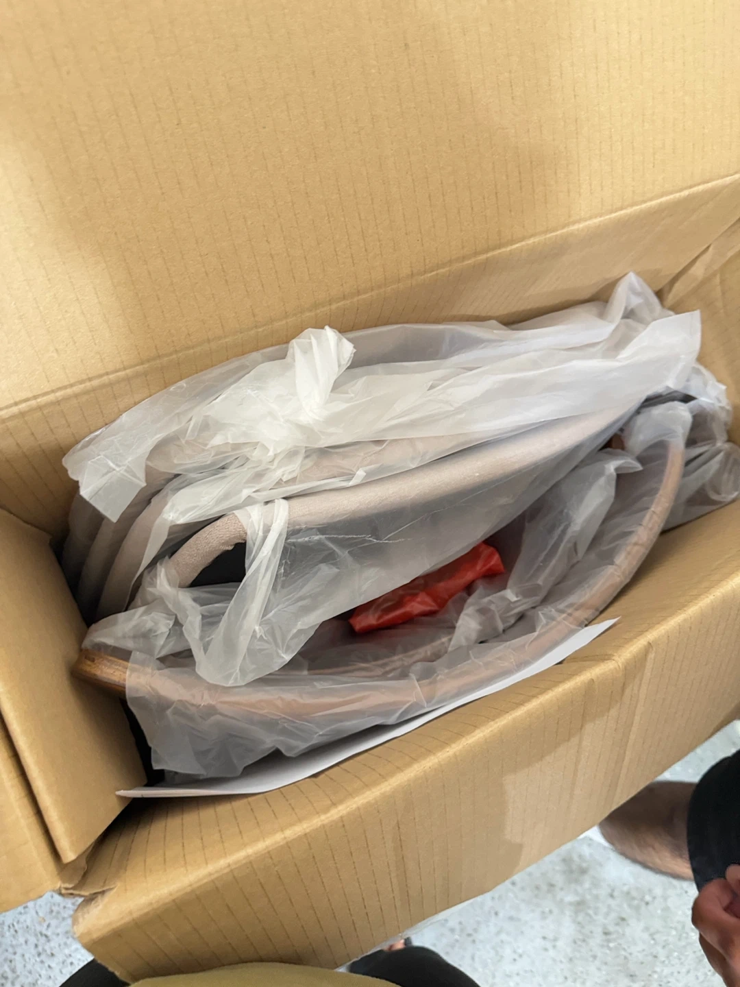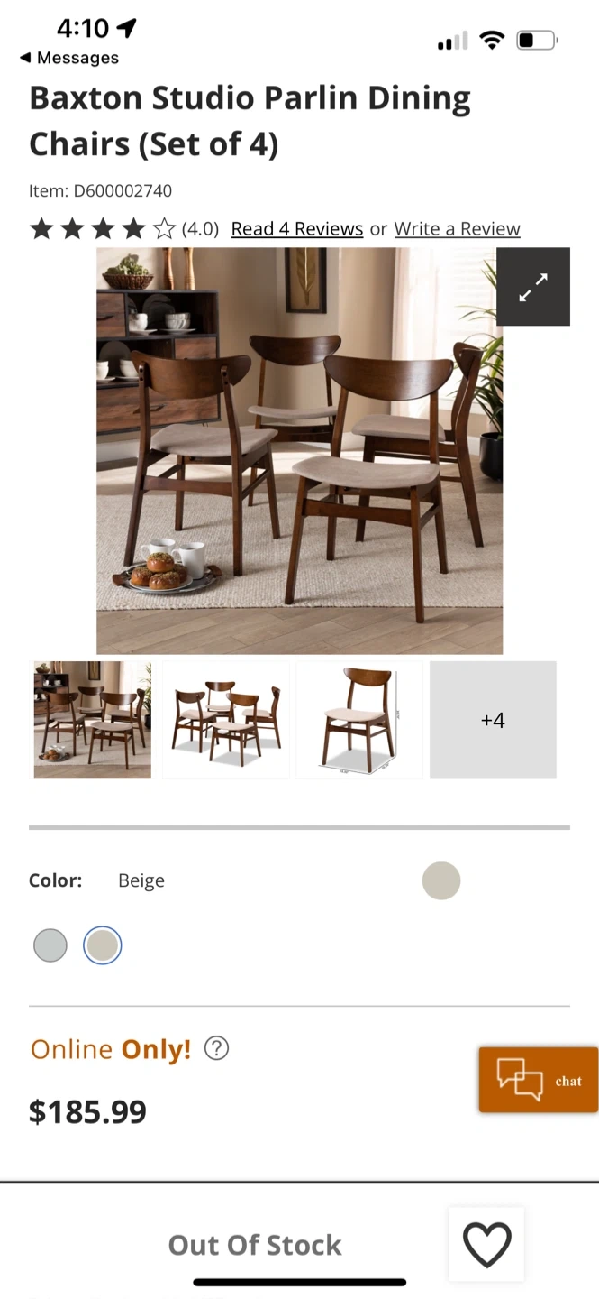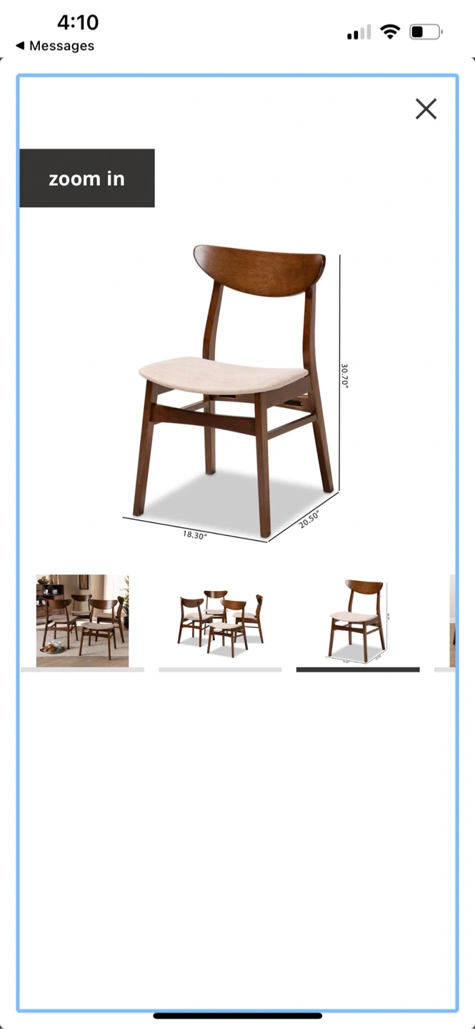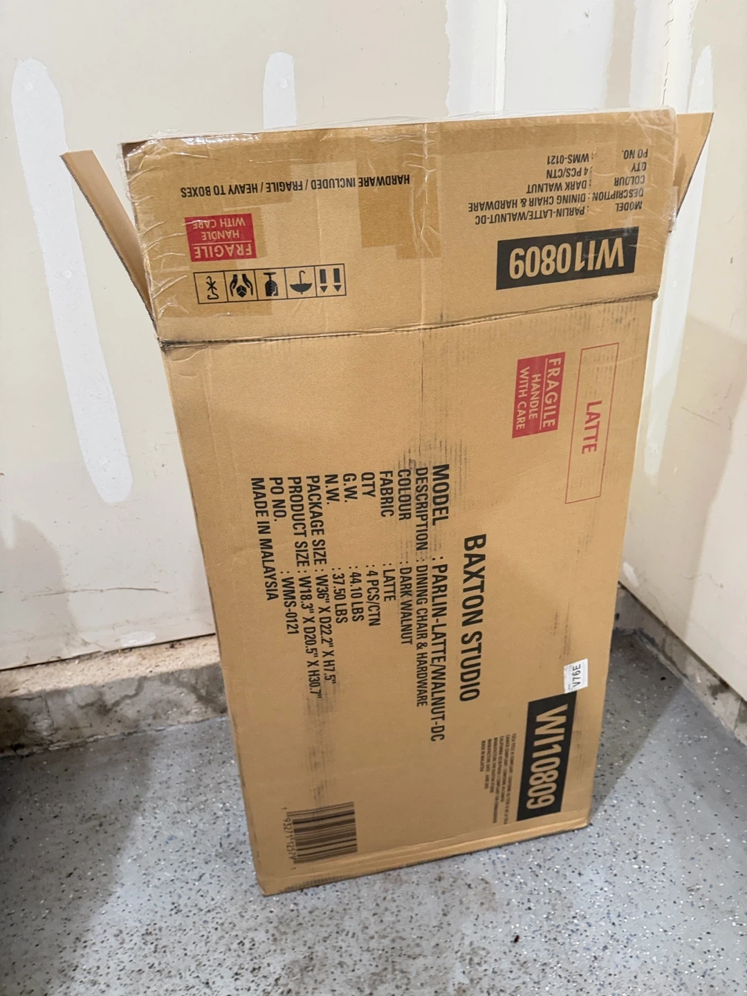 Selling a Baxton Studio Parlin dining chair in beige. The chair is 30.71" tall, 18.30" wide, and 20.50" deep. Brand new dining chairs bought on Ashley’s website. Only built one chair, all other chairs are untouched. Didn’t work for the space we have. All hardware and building instructions included. In original packaging. Online description: Item: D600002740 Comfort and efficiency define the modest design of the Parlin dining chair. Made in Malaysia, the Parlin is finished in a warm walnut brown that lends any space a relaxed feel. Curved wood craftsmanship provides excellent back support in a smooth and streamlined form. Each foam-padded chair is upholstered in an elegant light-tone fabric and requires assembly. With its compact size, the Parlin dining chair is an easy addition to dining rooms and nooks with limited space. Set includes four (4) dining chairs Constructed from rubberwood Walnut brown finish Upholstered in polyester fabric and padded with foam