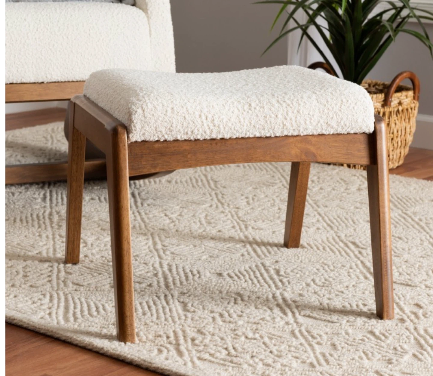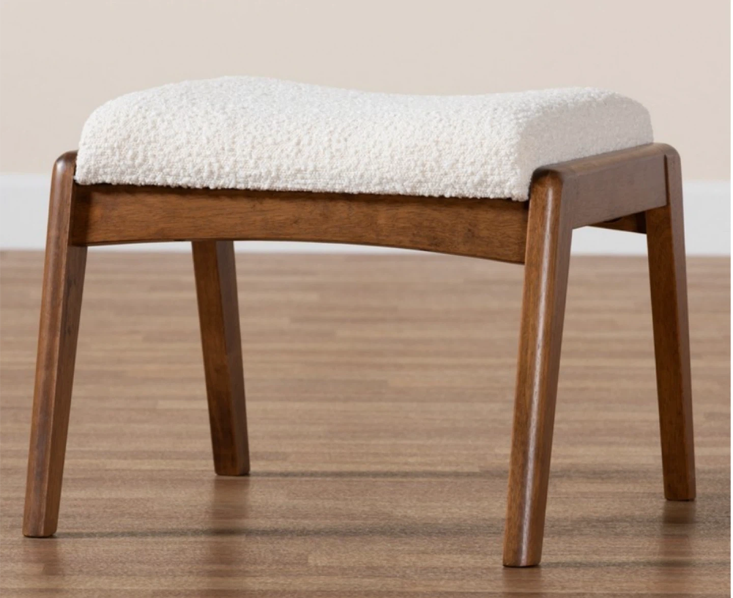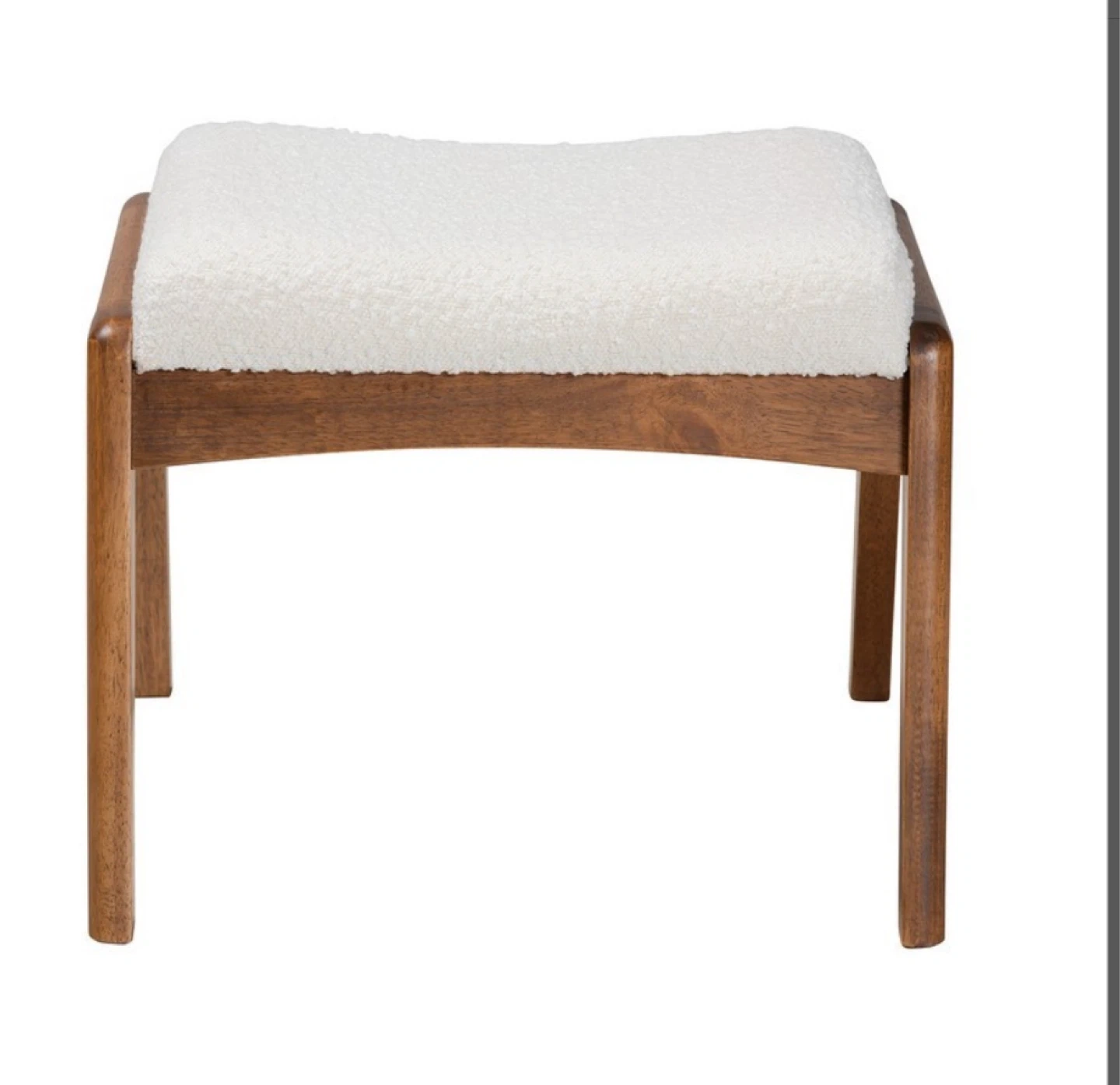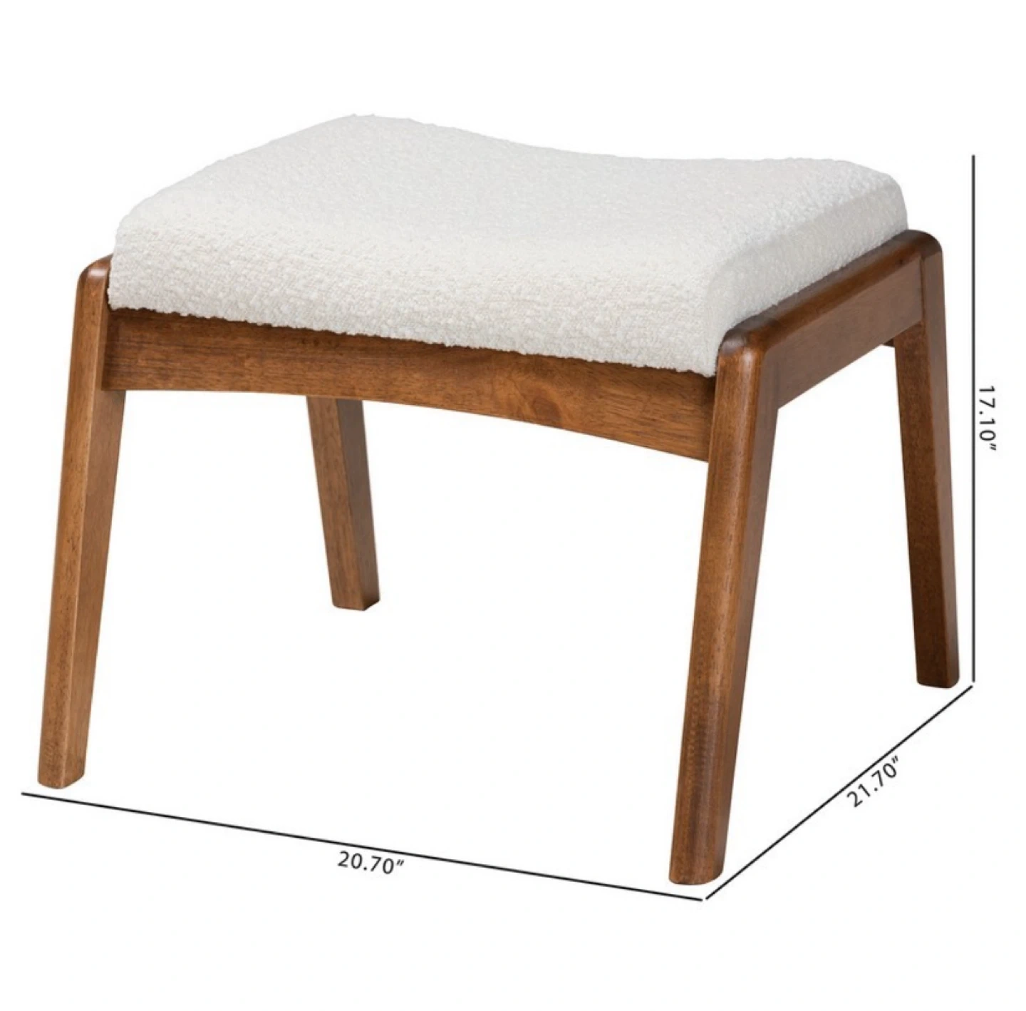 Selling a Baxton Studio Roxy Ottoman in off-white boucle and walnut brown finish wood. It's a stylish and comfortable addition to any living space! - Dimensions: 17.10" H x 21.70" W x 20.70" D