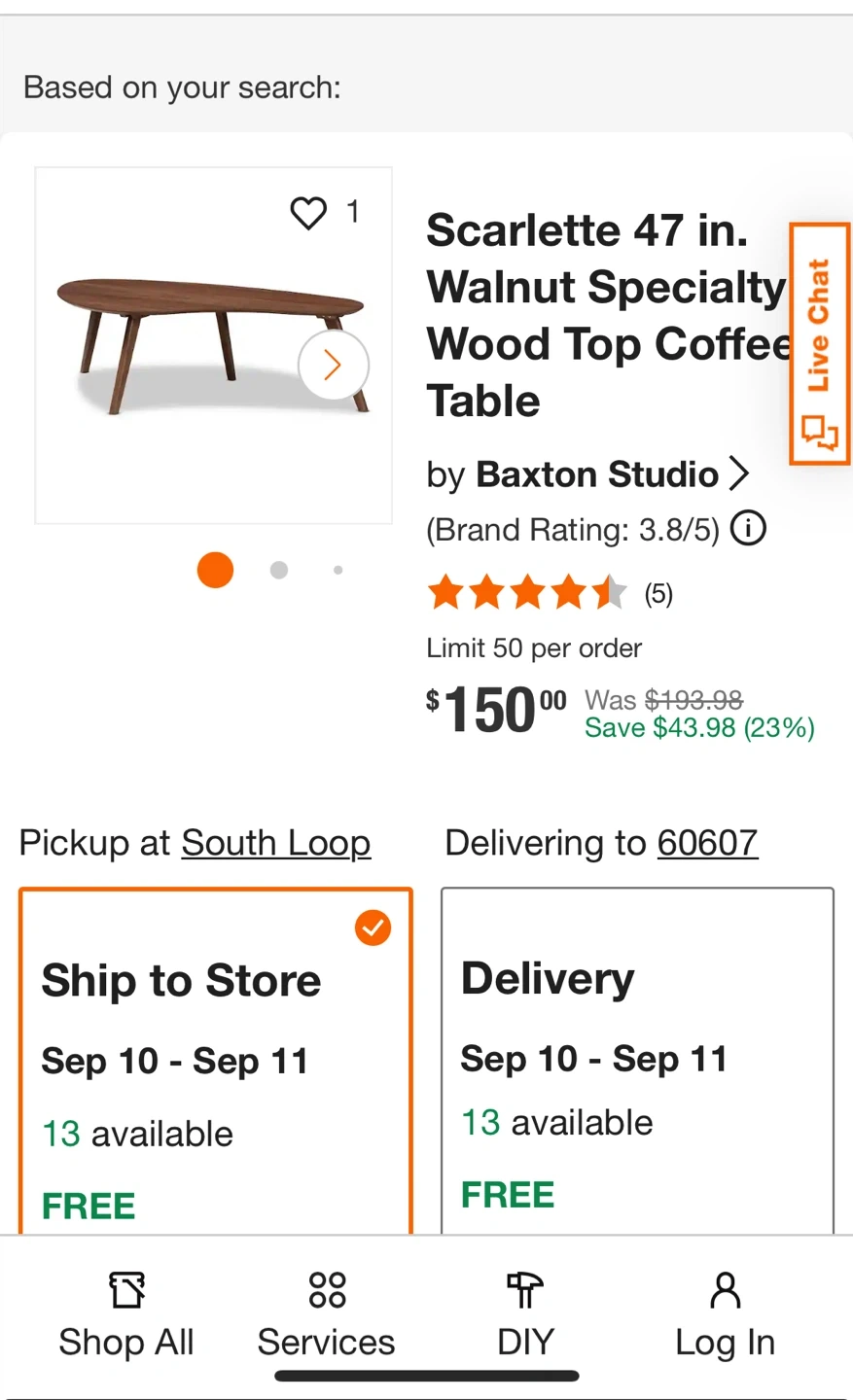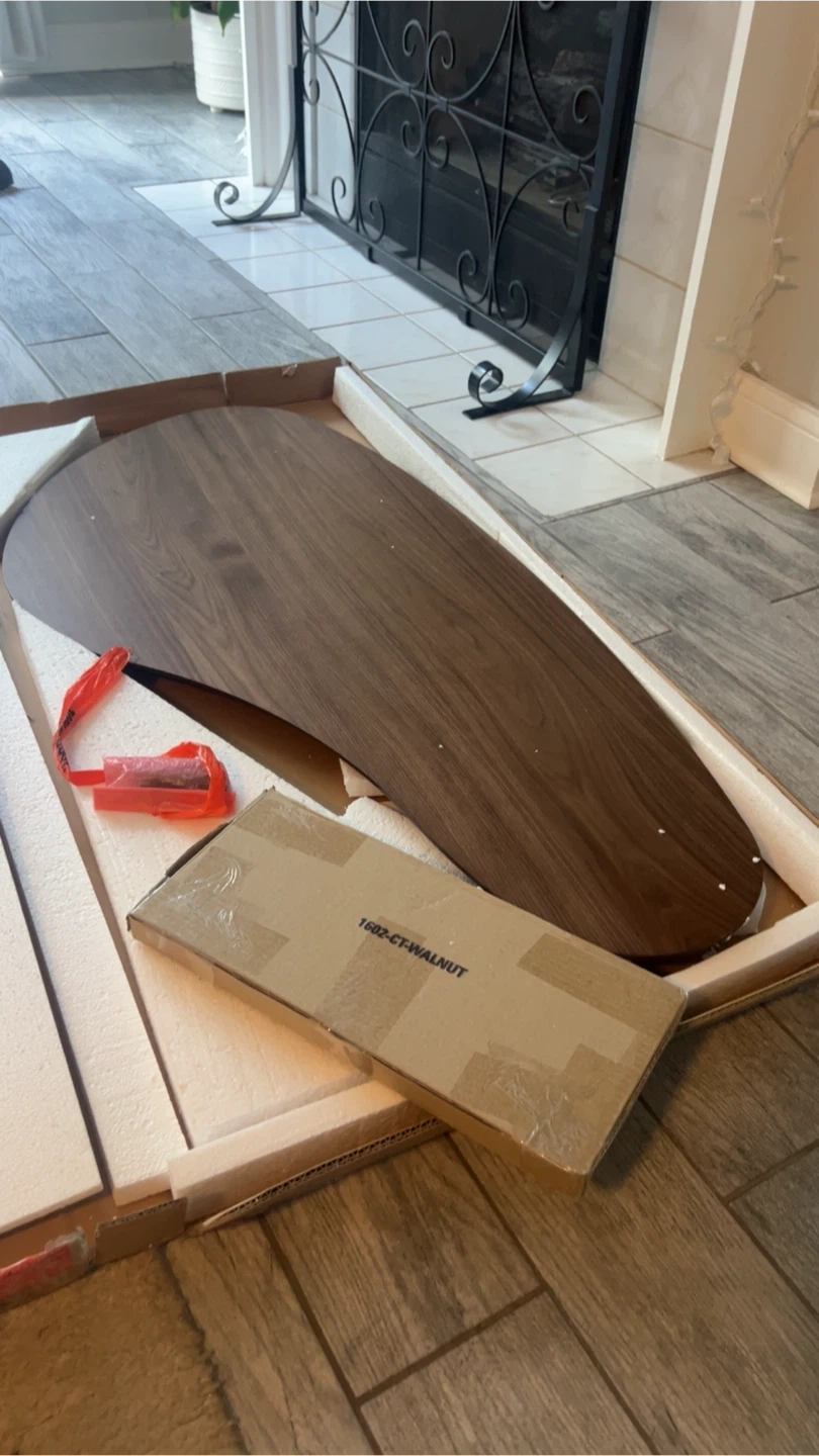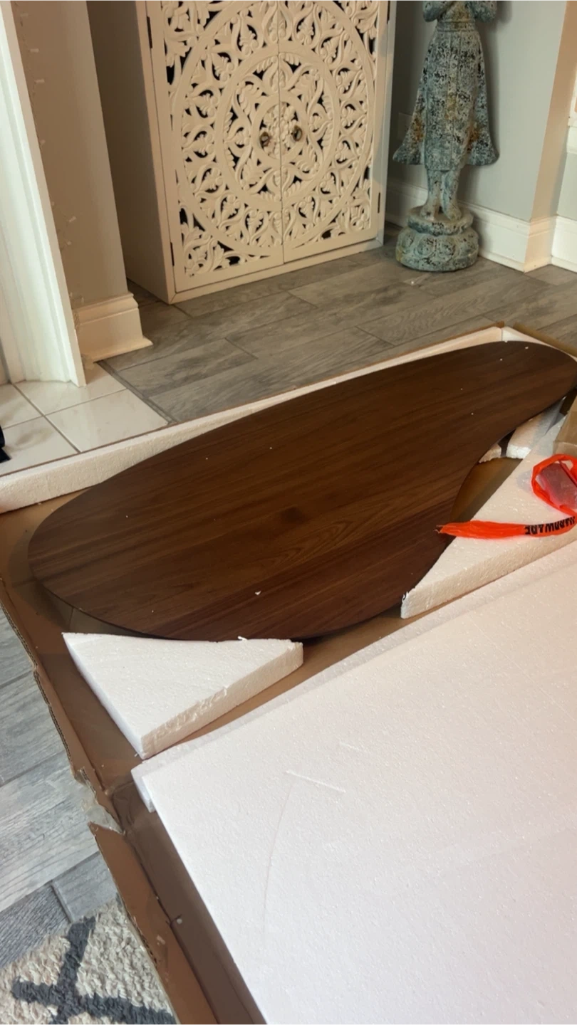 Selling a Baxton Studio Scarlette 47-inch Walnut Specialty Wood Top Coffee Table. It's constructed from solid rubberwood with a walnut brown finish and rounded edges. Assembly is required.