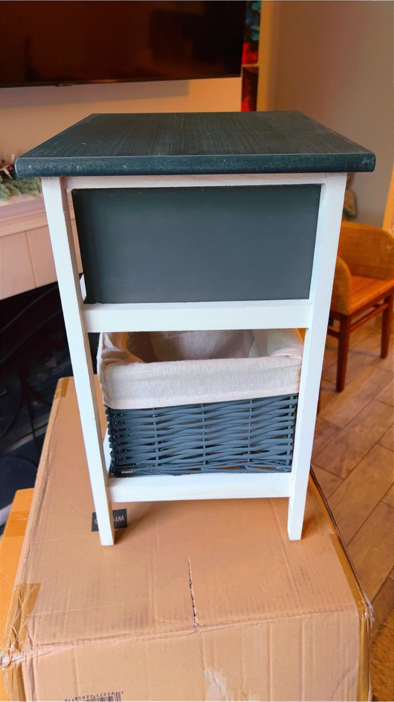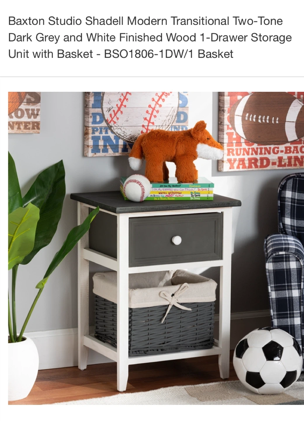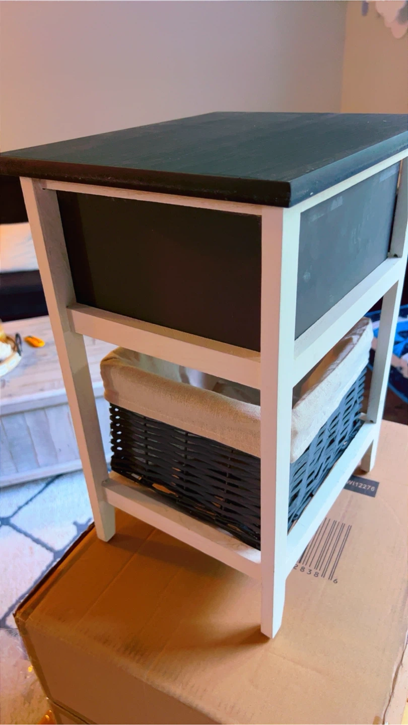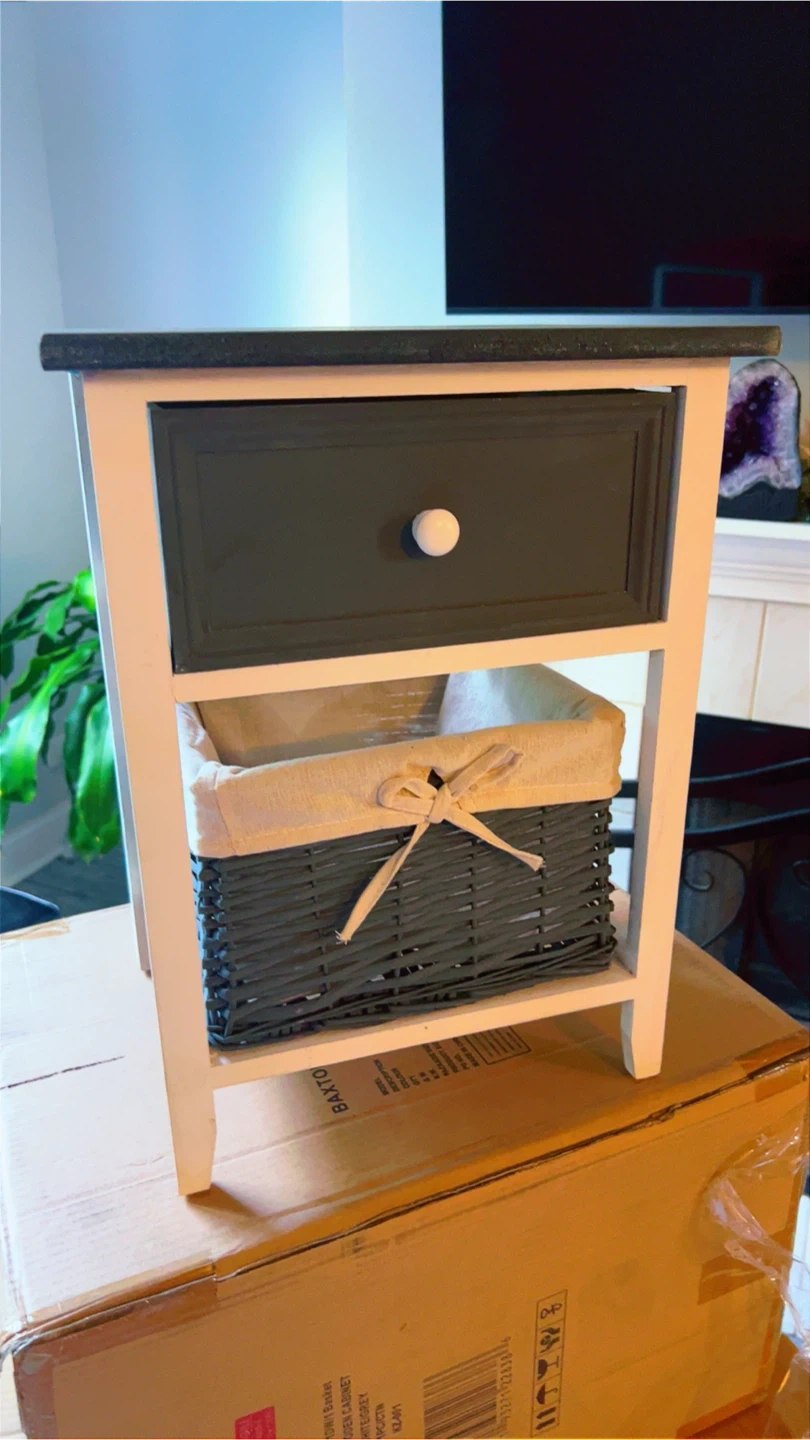 Selling a Baxton Studio Shadell Modern Transitional Two-Tone Dark Grey and White Finished Wood 1-Drawer Storage Unit with Basket! It's in great condition and comes with the original box. This side table is perfect for adding a touch of style and storage to any room