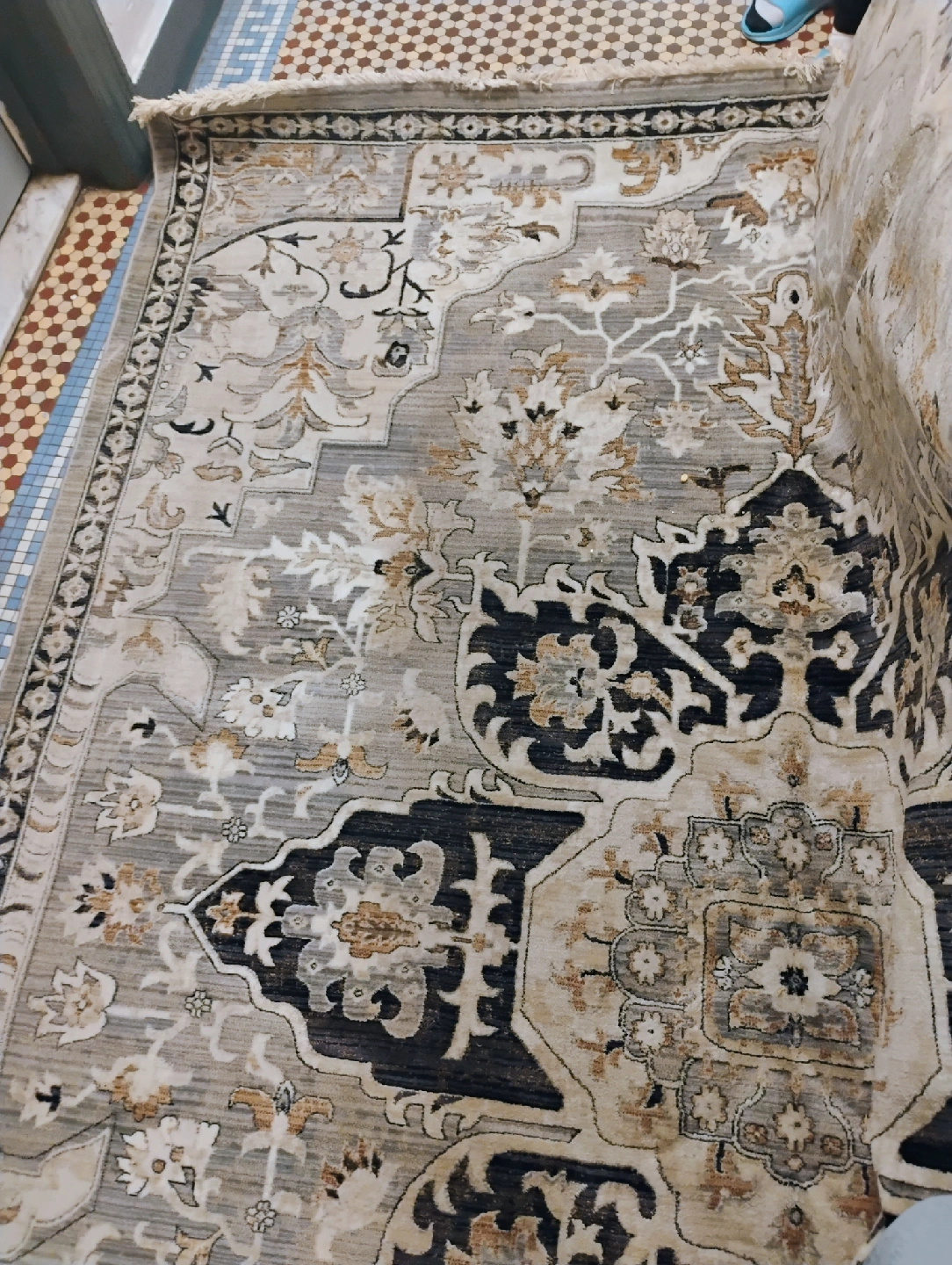 30Selling a Bazaar Dazzle Area Rug in blue! It's sized at 7'10" x 10'2" (2.38 m x 3.09 m). The face is Polypropylene and the backing is a cotton blend and polyester blend made in Turkey