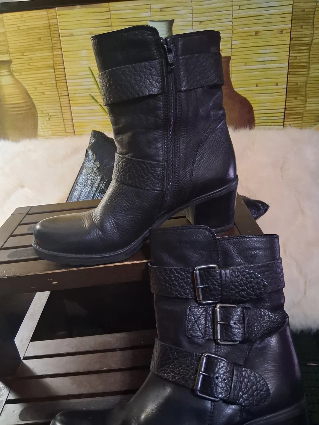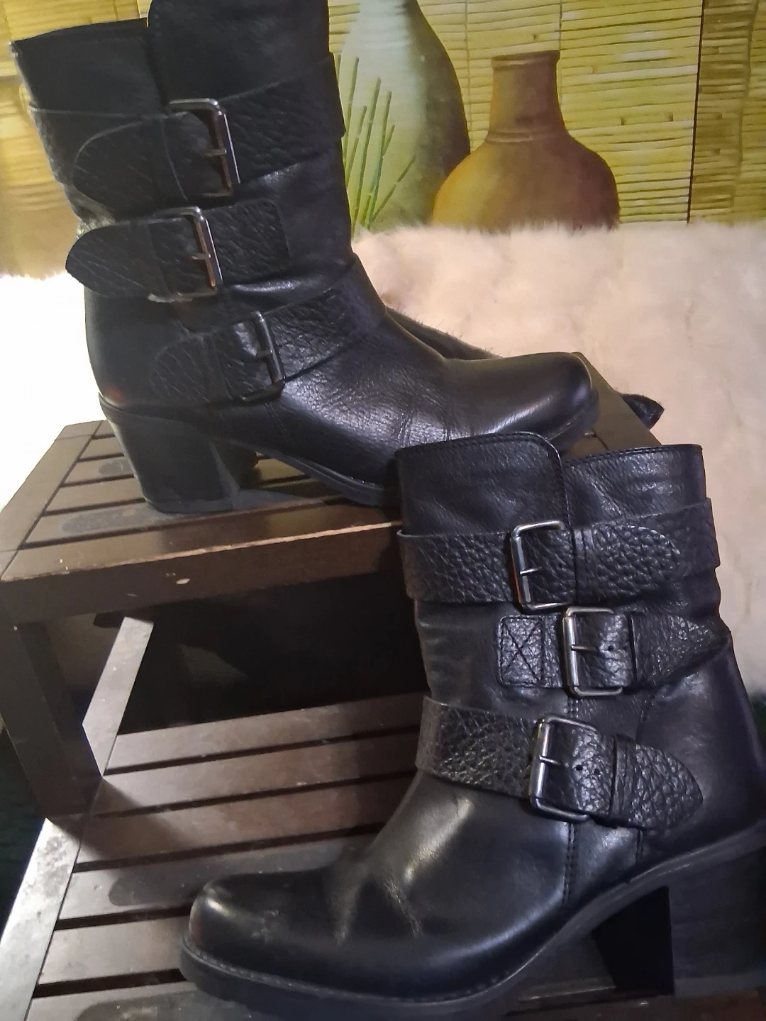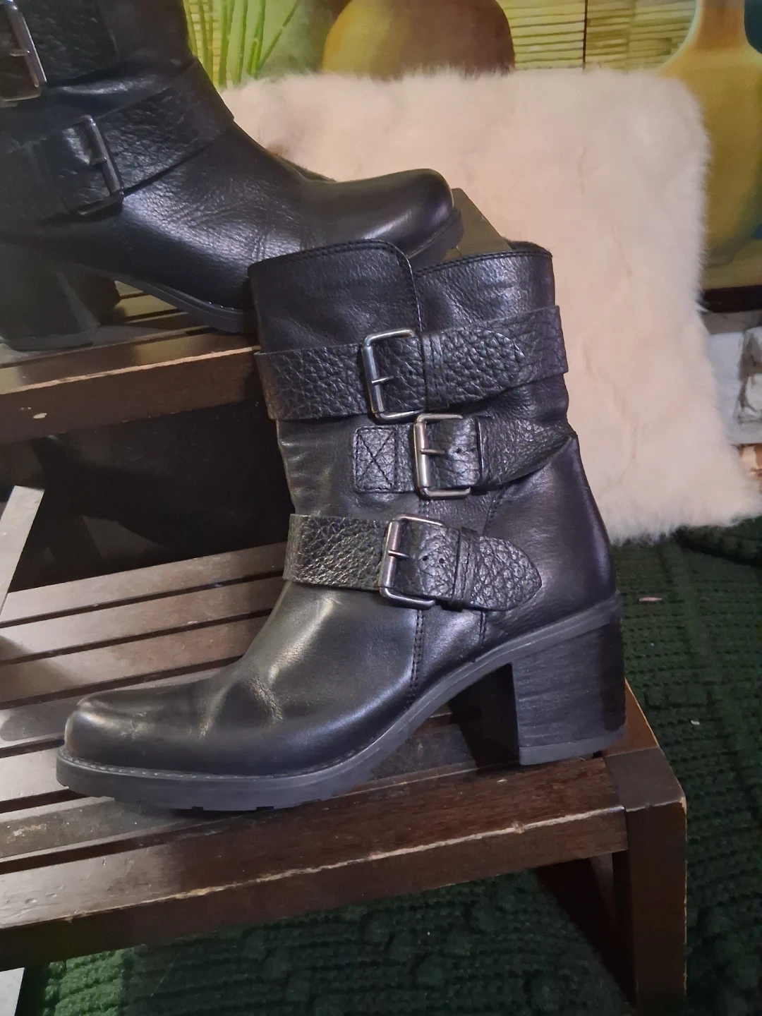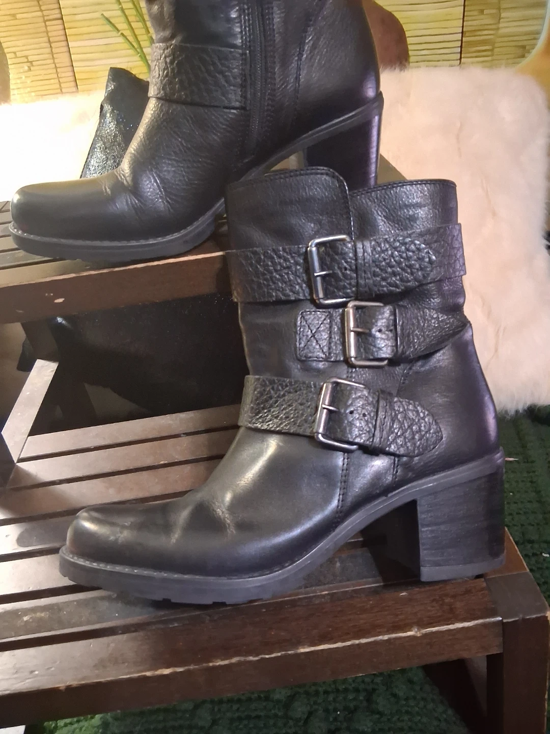 These Clarks ankle boots are crafted from black leather with multiple buckle details. They feature a comfortable block heel and a durable sole. Perfect for adding a stylish touch to any outfit!