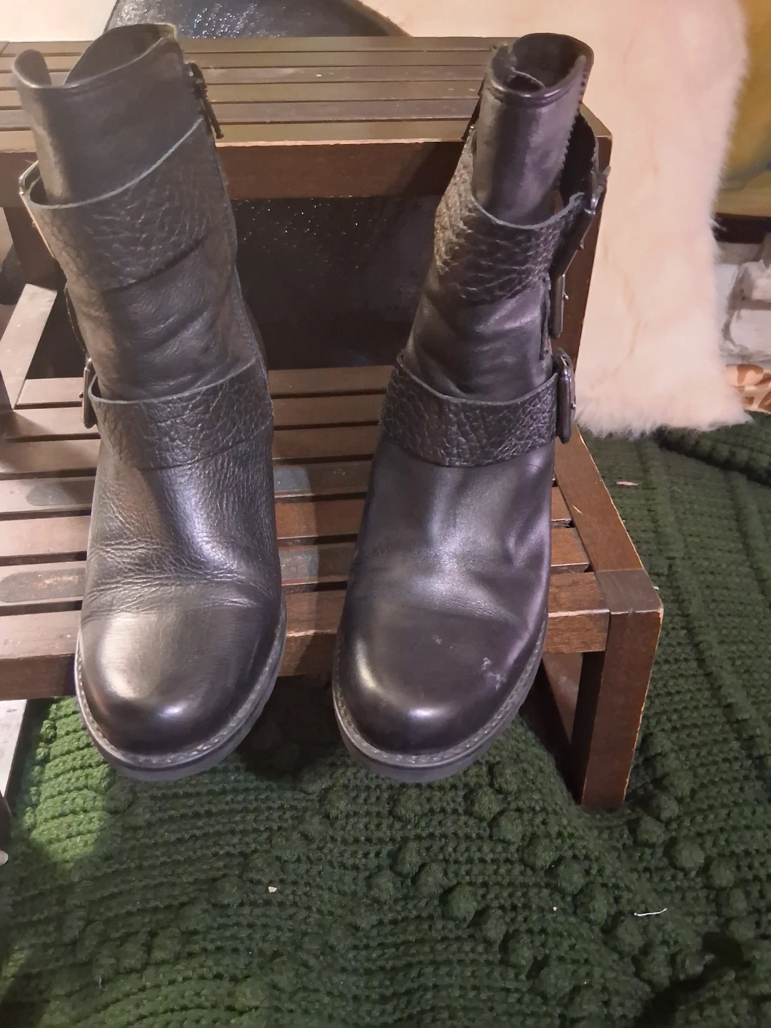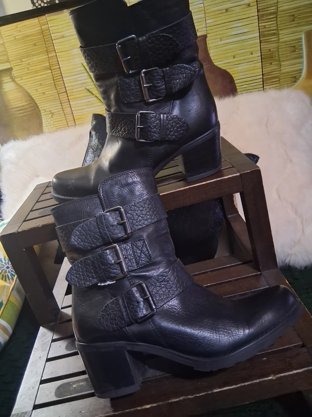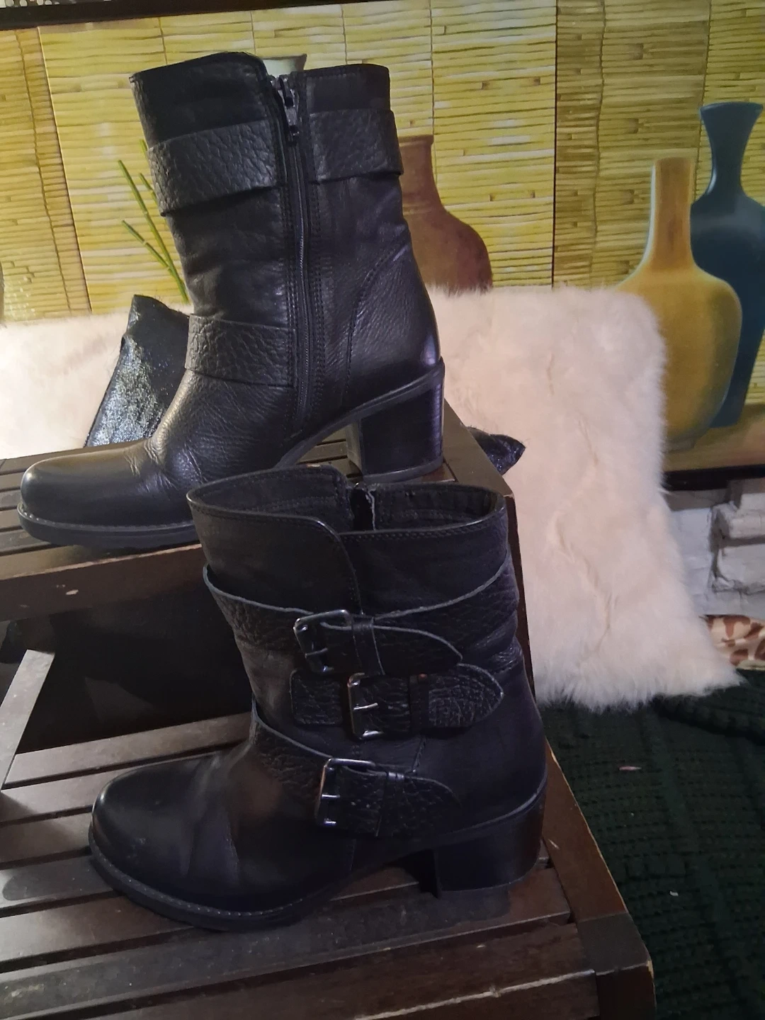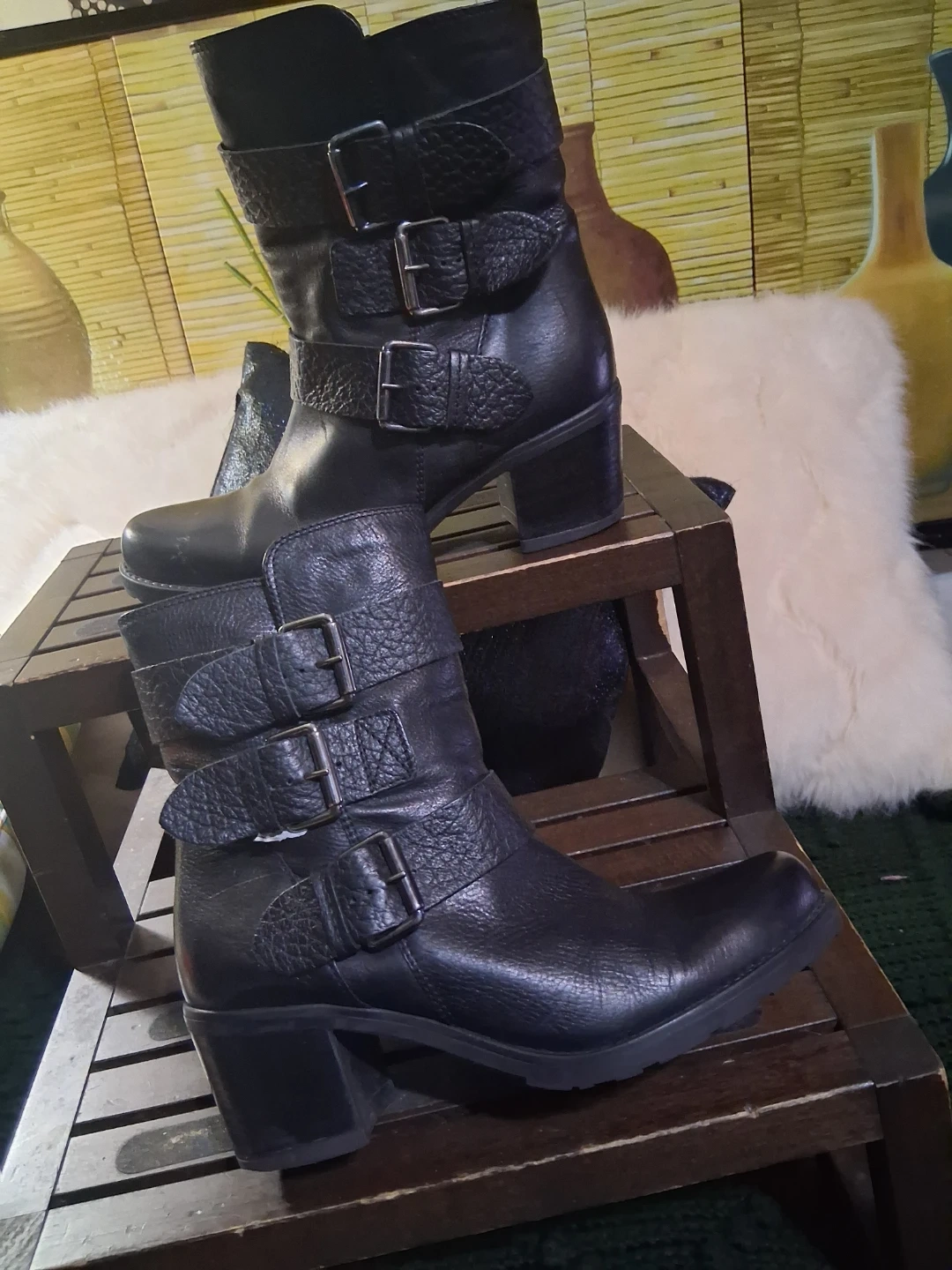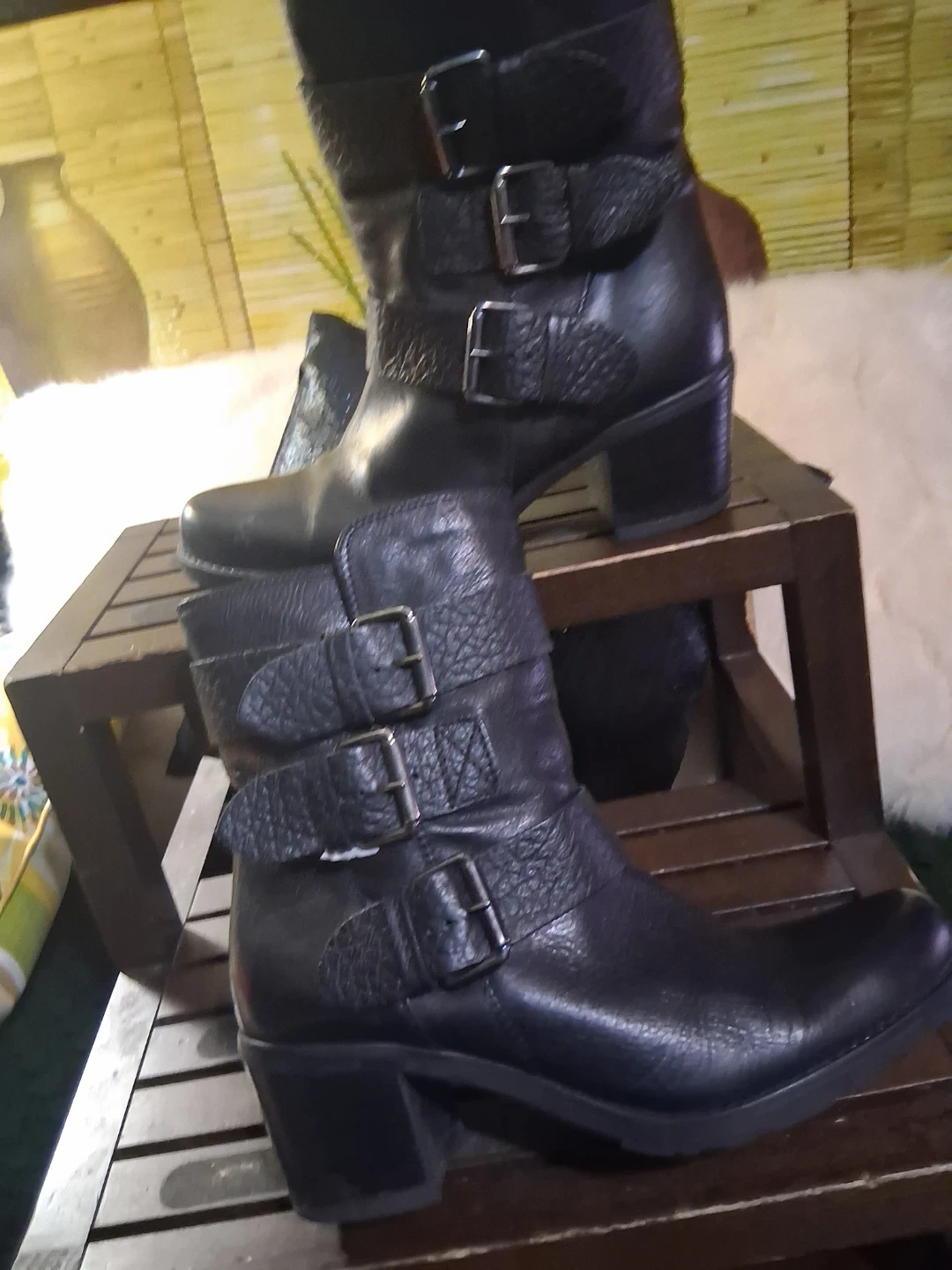 These Clarks ankle boots are crafted from black leather with multiple buckle details. They feature a comfortable block heel and a durable sole. Perfect for adding a stylish touch to any outfit!